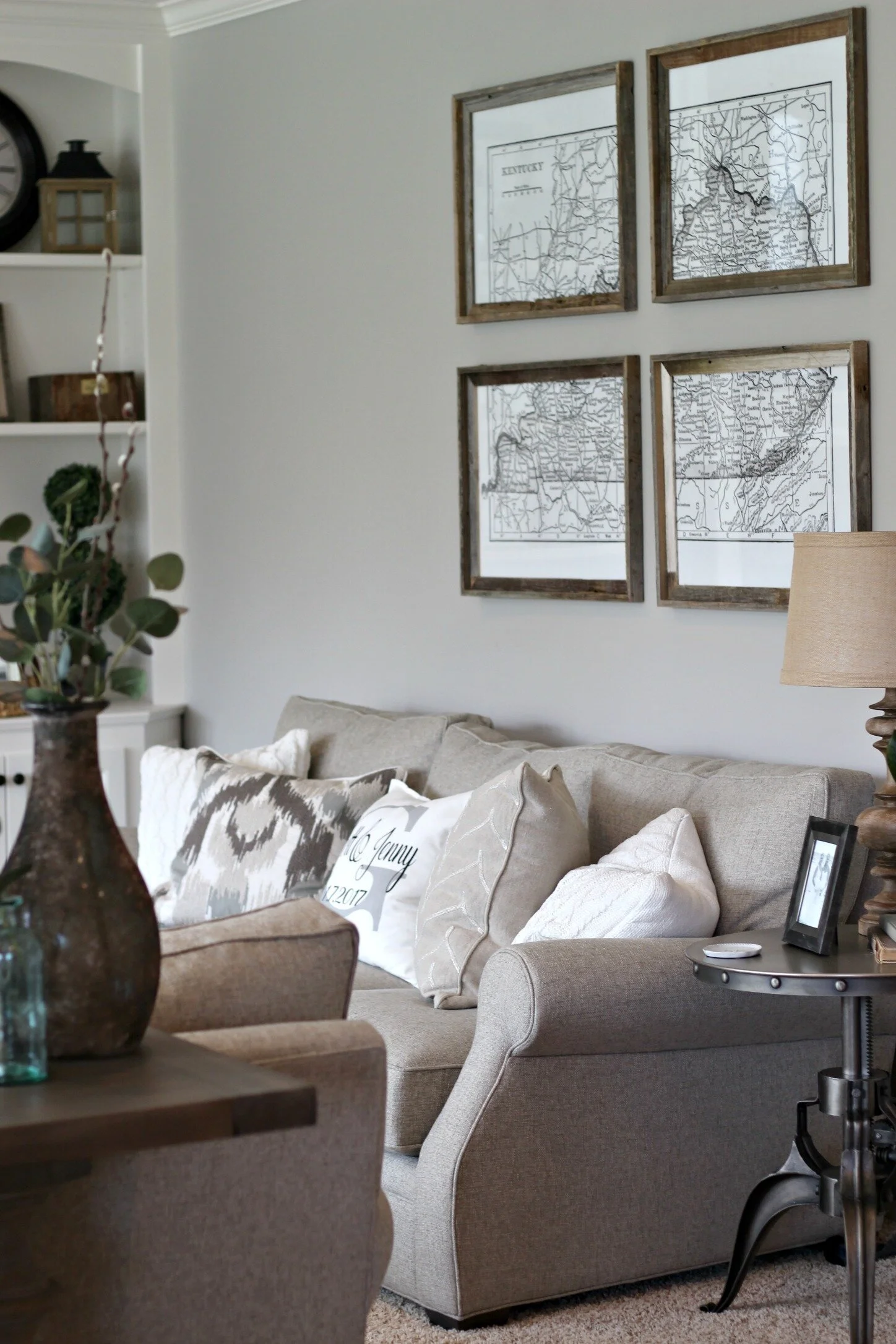When we first met, this couple mentioned getting some type of map art to fill this wall and they really liked the idea of the divided style with multiple frames. I was able to enlarge an old Kentucky map and then divide it between four 16 x 20 barnwood frames from Hobby Lobby (the larger sizes are only available in-store but I linked some of the smaller sizes at the end of this post). I was thrilled to find these frames because they are all unique and completely made from reclaimed wood from barns and farm fencing across the U.S. I love the texture and warmth the frames add to the room and they fill the open space above the couch perfectly.