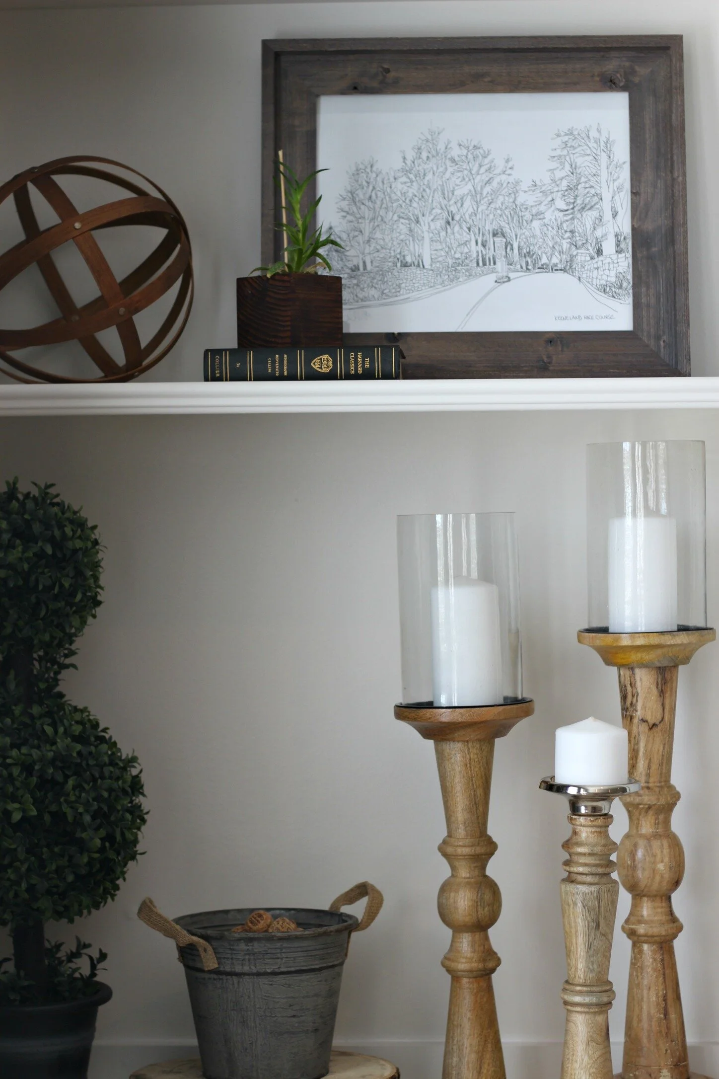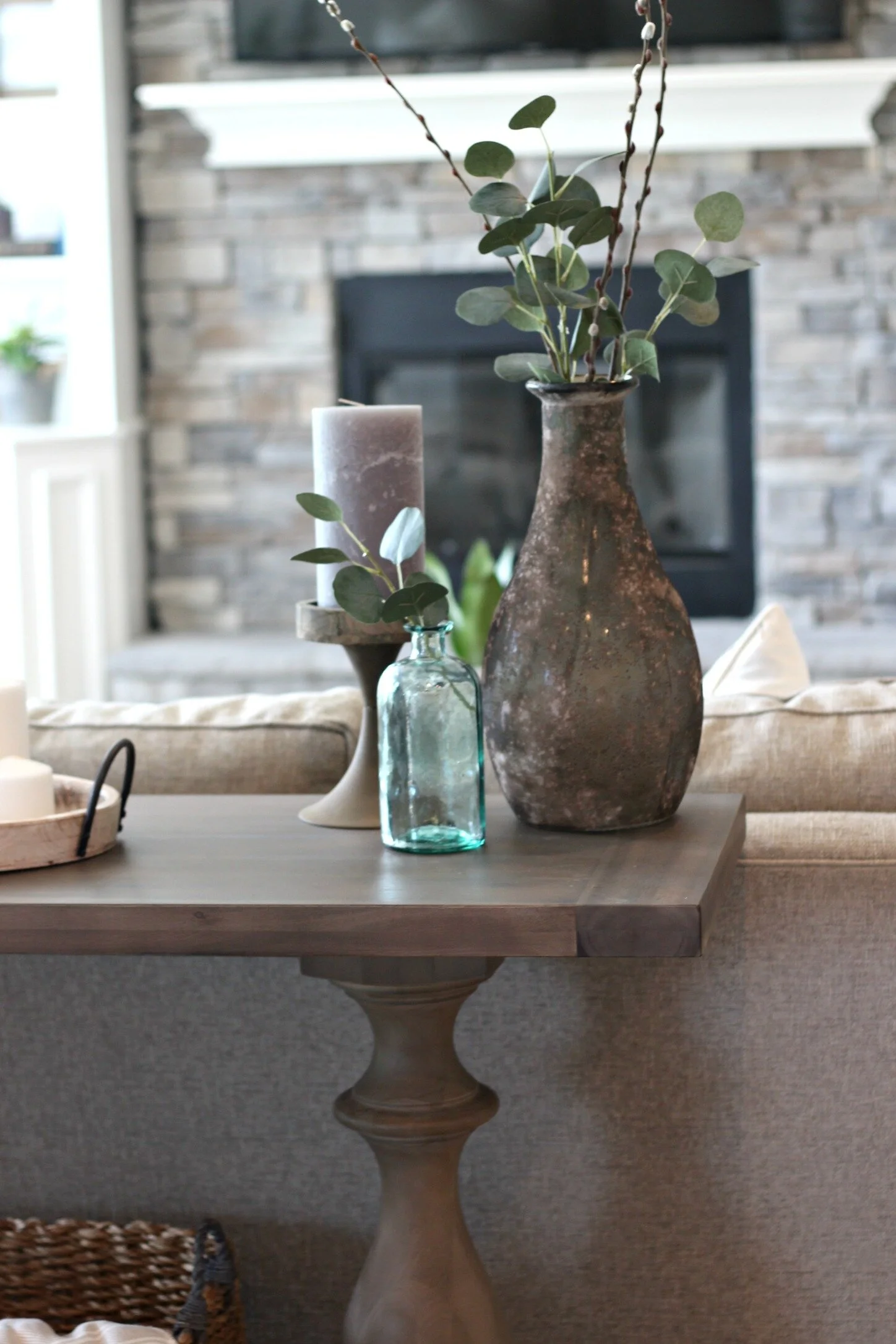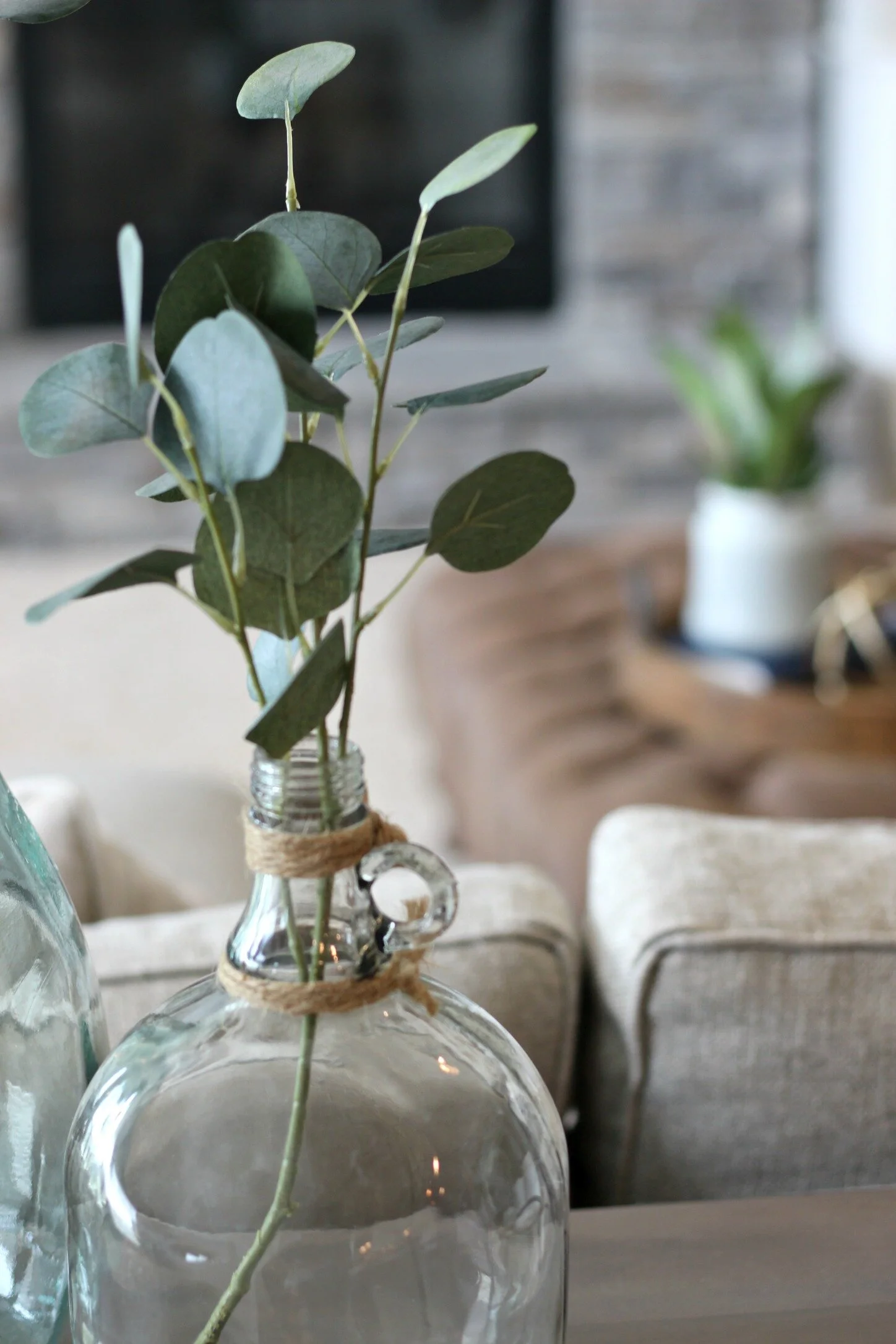 The overall color scheme of the space is neutral but with a few pops of green and blue (like these glass bottles, greenery stems, and lots of plants). I tried to tie in lots of distressed wood, recycled glass, and industrial metals to give the space that refined farmhouse feel but also lots of texture and warmth. The styling of the sofa table behind the couch did stump me at first because I'm so used to just placing lamps on these to anchor each side. Due to the location in the middle of the room, there was no way to plug in lamps without having a cord strewn across the walking space. So I went on the hunt for something tall to add some height here and the glass bottles ended up being the perfect choice (found these at HomeGoods and Hobby Lobby)! Since they are clear, they also don't block your sight lines into the living room or the natural light coming in from the windows. I placed some faux stems inside them to add color and they will last forever without wilting or watering! The super simple combination of the white pillar candles on the oval tray in the center ended up being one of our favorite elements of the entire space too. Adding a cluster of candles like this is such an easy way to make any tray, crate, or dish into a chic arrangement.