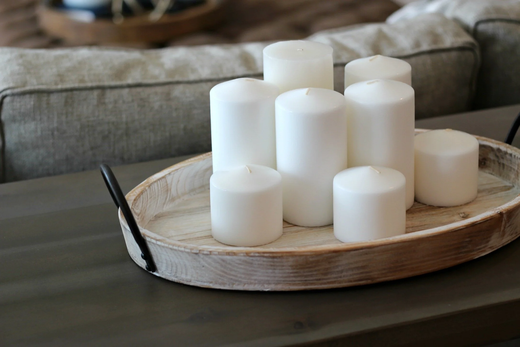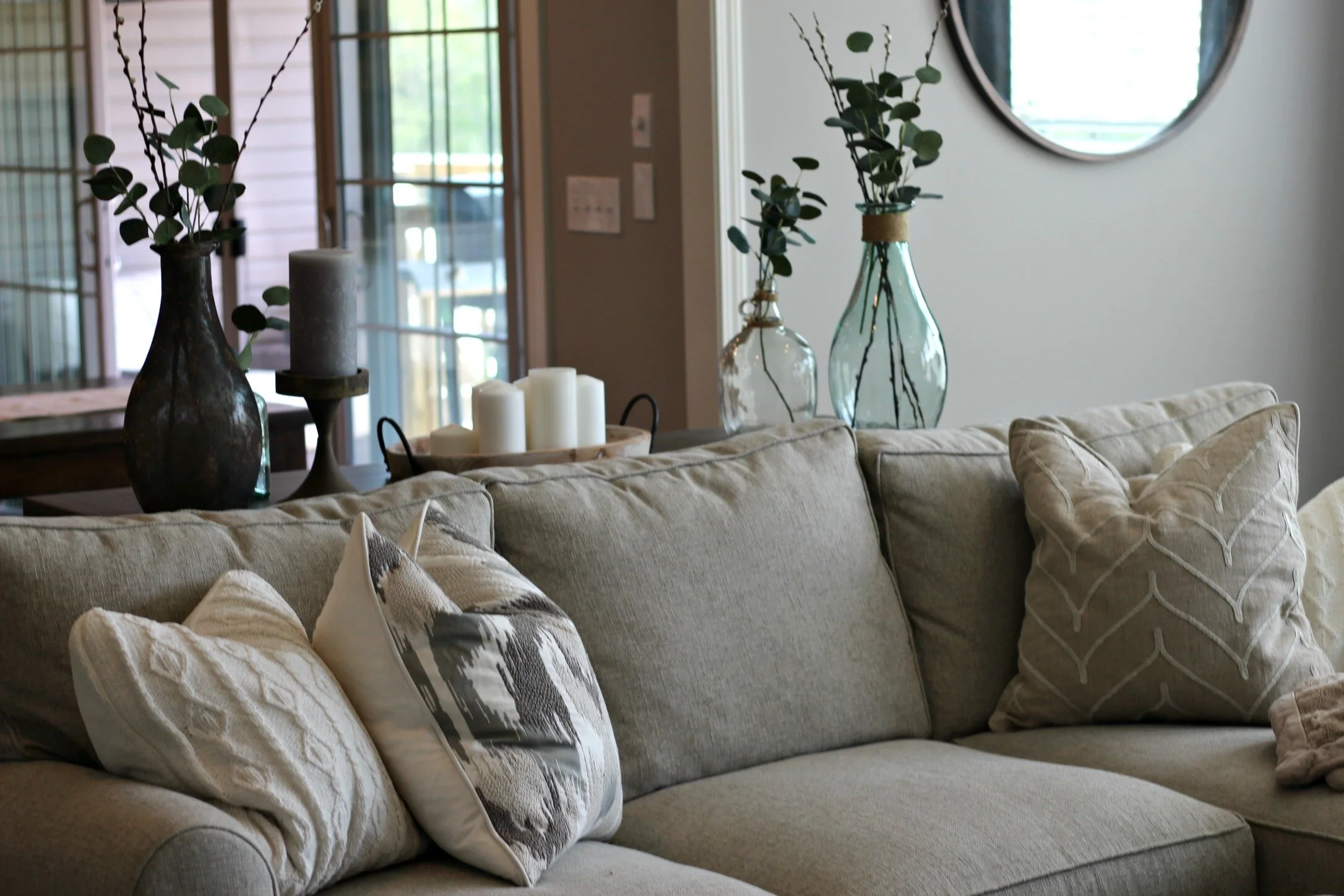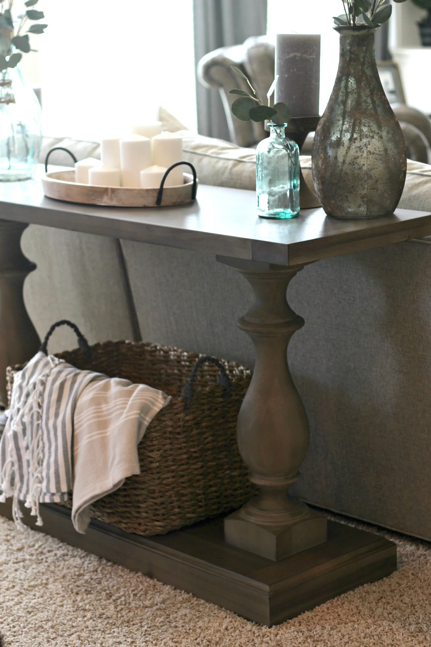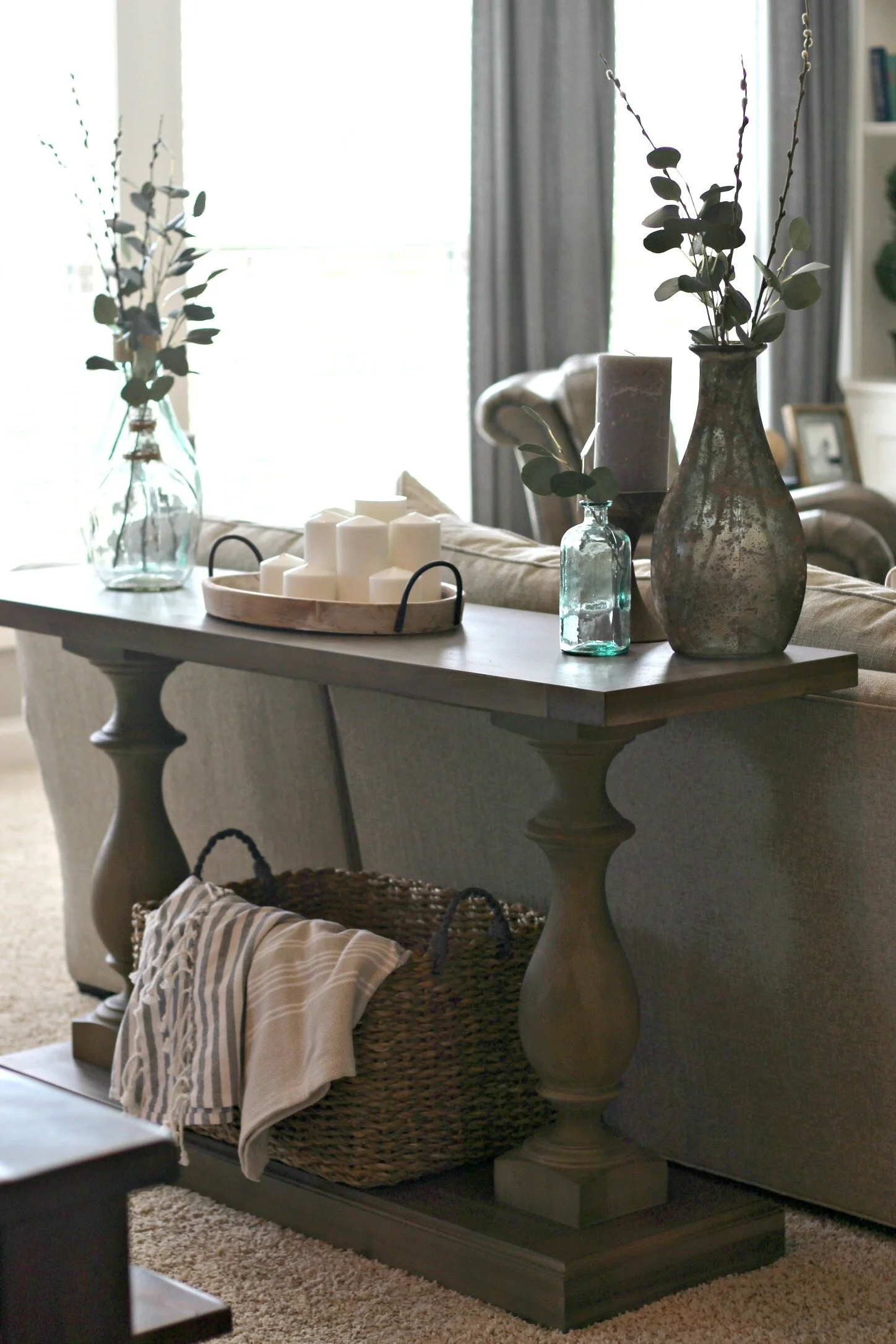 The overall color scheme of the space is neutral but with a few pops of green and blue (like these glass bottles, greenery stems, and lots of plants). I tried to tie in lots of distressed wood, recycled glass, and industrial metals to give the space that refined farmhouse feel but also lots of texture and warmth. The styling of the sofa table behind the couch did stump me at first because I'm so used to just placing lamps on these to anchor each side. Due to the location in the middle of the room, there was no way to plug in lamps without having a cord strewn across the walking space. So I went on the hunt for something tall to add some height here and the glass bottles ended up being the perfect choice (found these at HomeGoods and Hobby Lobby)! Since they are clear, they also don't block your sight lines into the living room or the natural light coming in from the windows. I placed some faux stems inside them to add color and they will last forever without wilting or watering! The super simple combination of the white pillar candles on the oval tray in the center ended up being one of our favorite elements of the entire space too. Adding a cluster of candles like this is such an easy way to make any tray, crate, or dish into a chic arrangement.