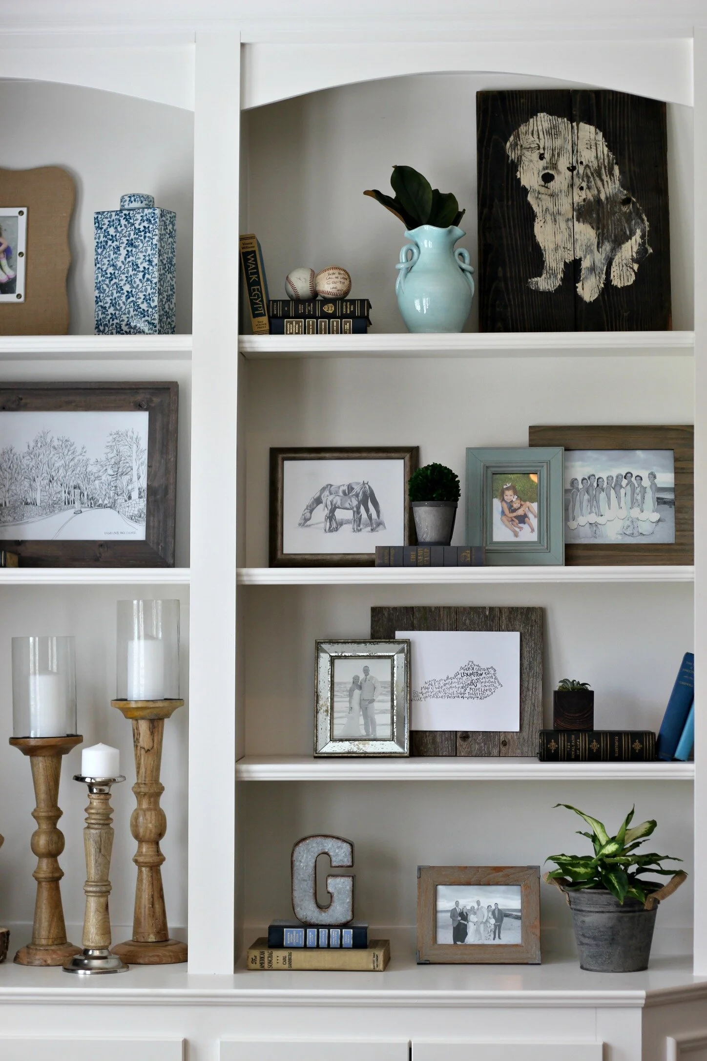 Above you can see a closer look at some of the frames and prints I chose to fill in the built-ins. They had lots of new pictures to frame since they just got married a few months ago, and I wanted to layer lots of different styles and sizes of frames to add dimension on these shelves. We also added a few Kentucky/equestrian themed prints from my shop to break up all the photos and add some unique character.