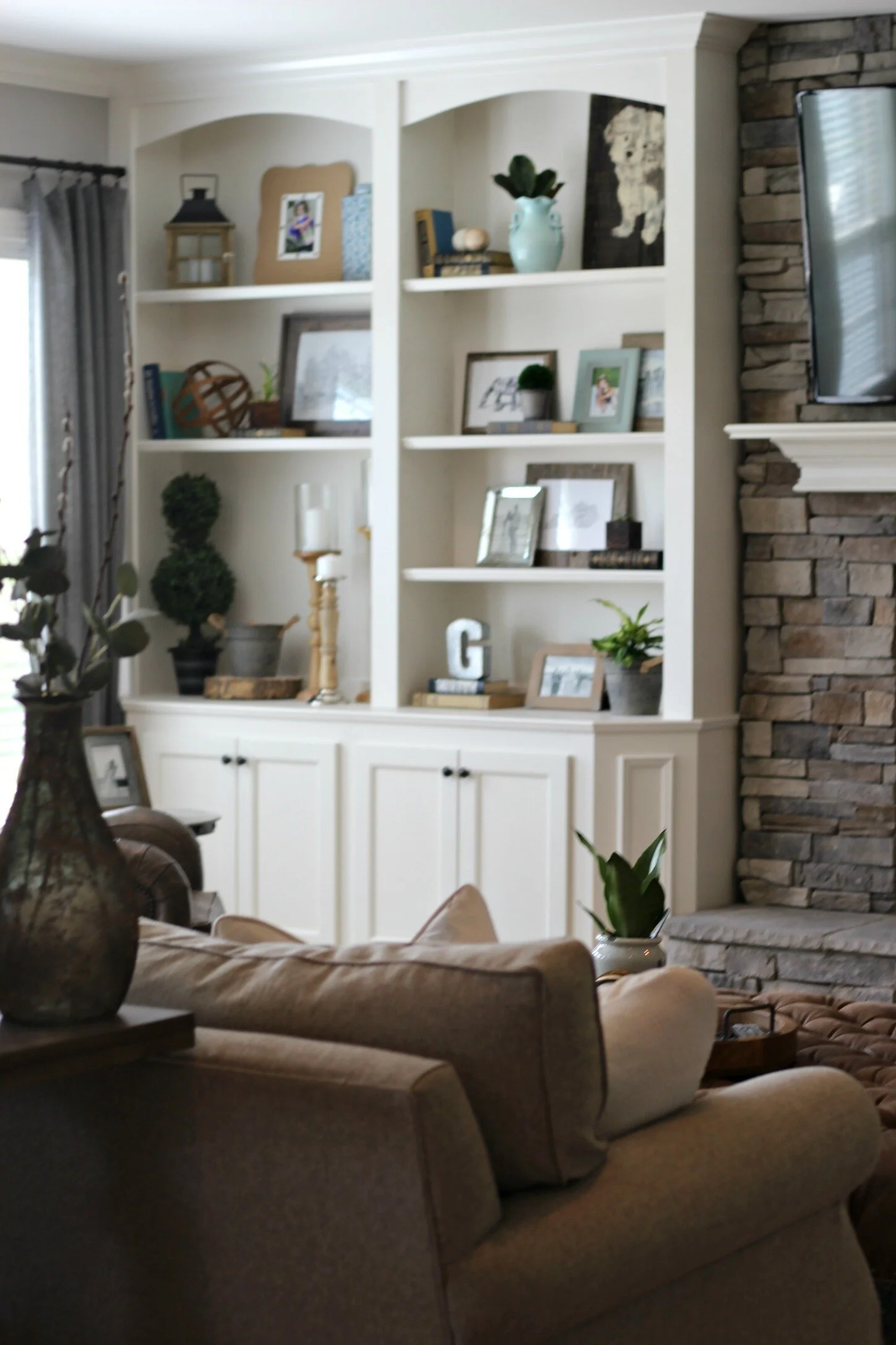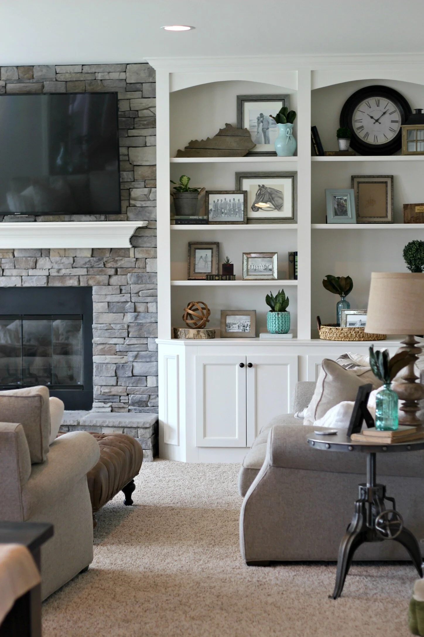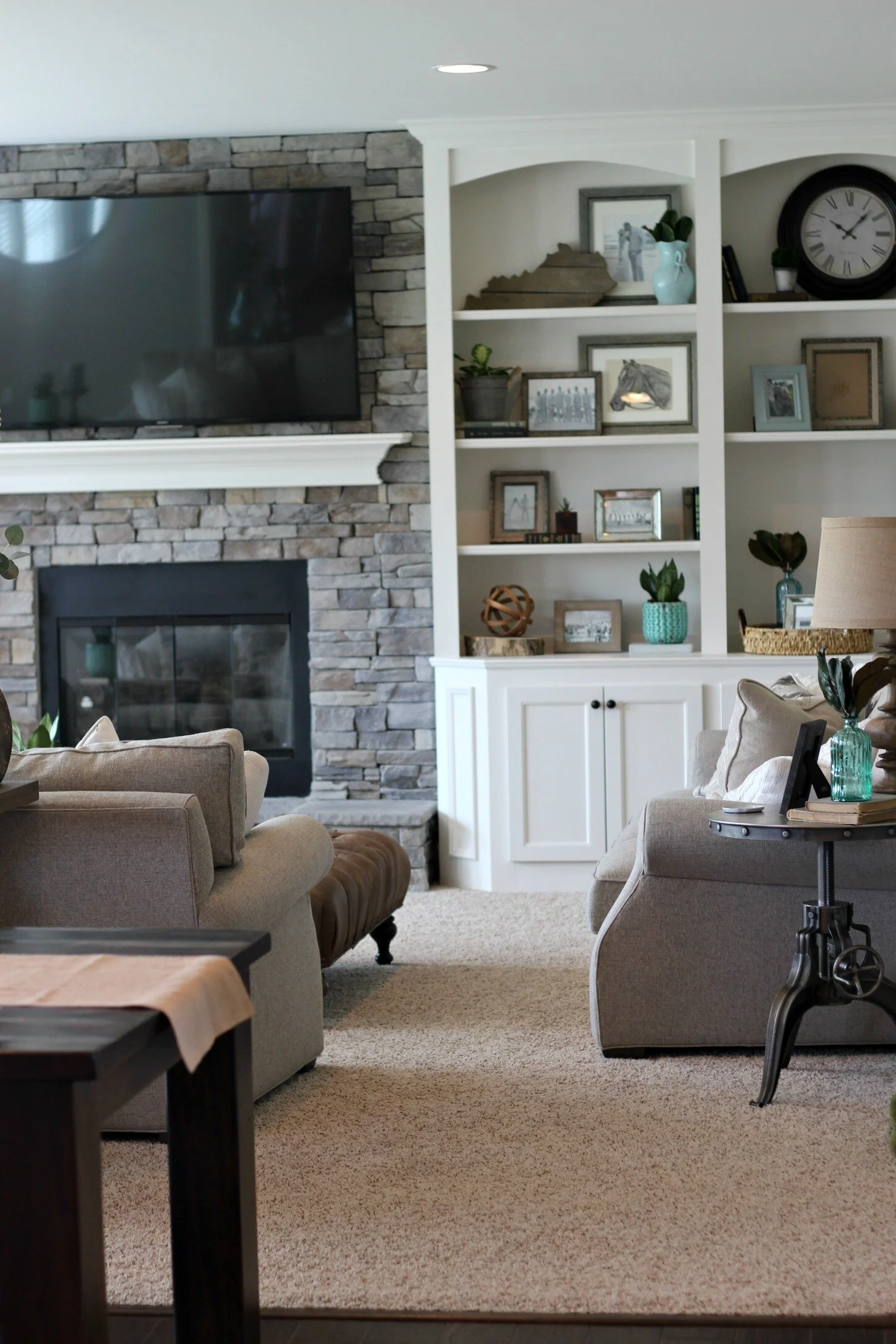 I've been dying to share this design project ever since the install a few weeks ago! The finishing touches are what made the biggest difference in this space and I think the end product perfectly emulates this couple's style and vision for the space. I was also lucky to start with a pretty clean slate and had some great base pieces to work off of (the couch, ottoman, and built-ins). Take a look at some of the before photos below:
