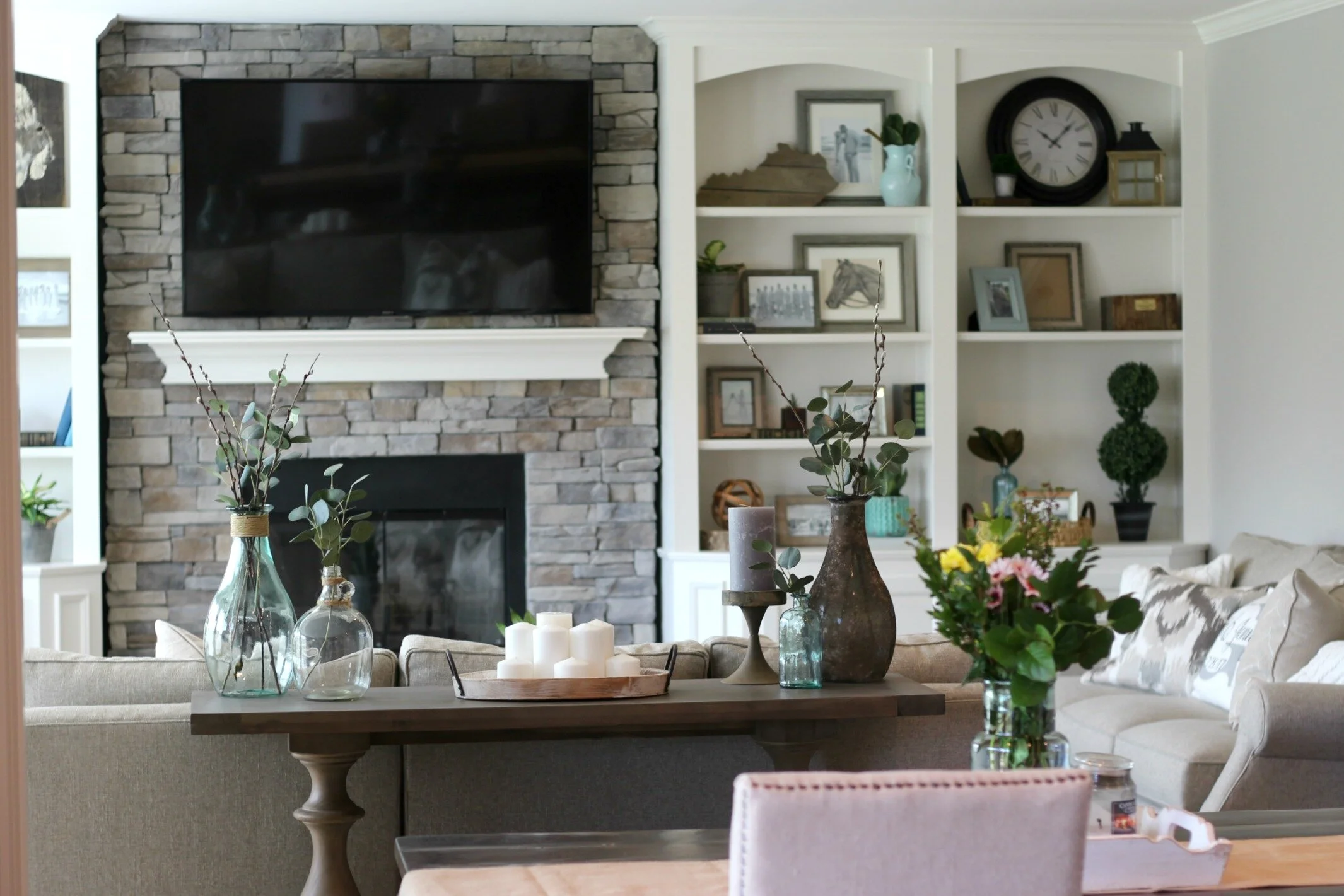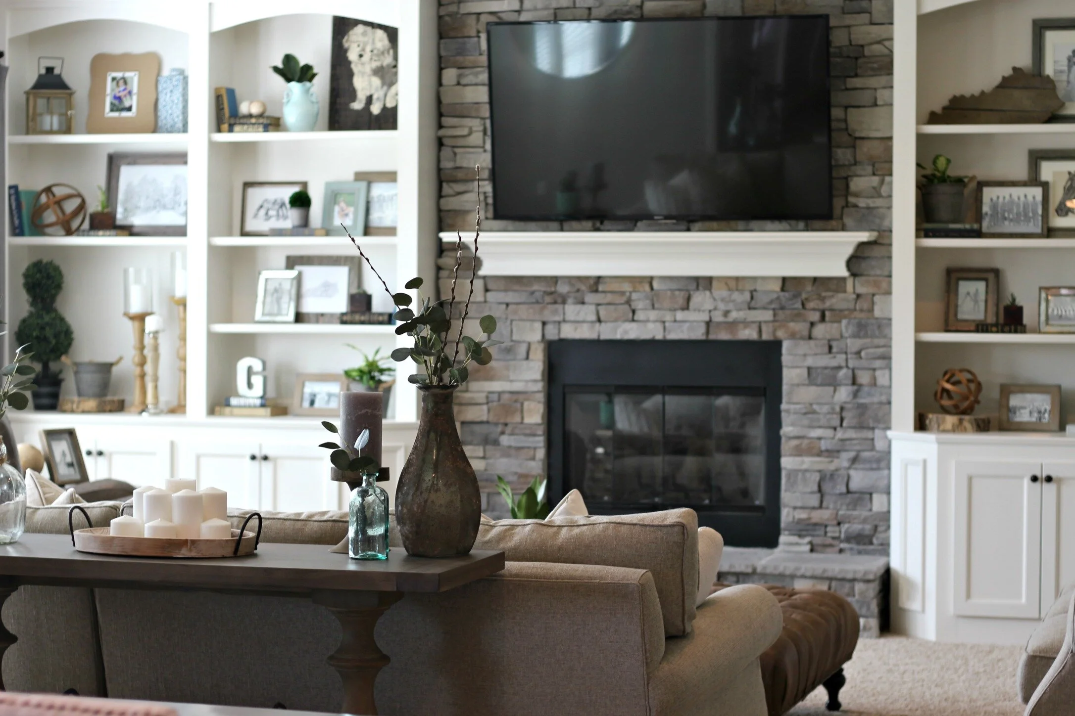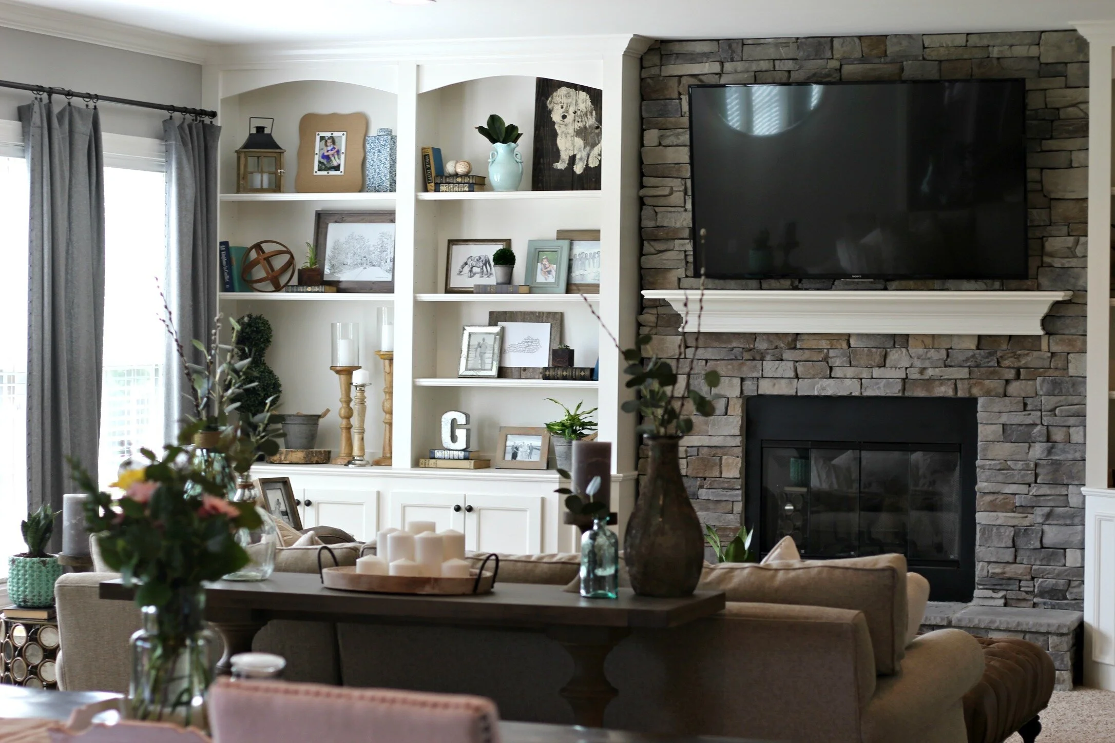 I've been dying to share this design project ever since the install a few weeks ago! The finishing touches are what made the biggest difference in this space and I think the end product perfectly emulates this couple's style and vision for the space. I was also lucky to start with a pretty clean slate and had some great base pieces to work off of (the couch, ottoman, and built-ins). Take a look at some of the before photos below: