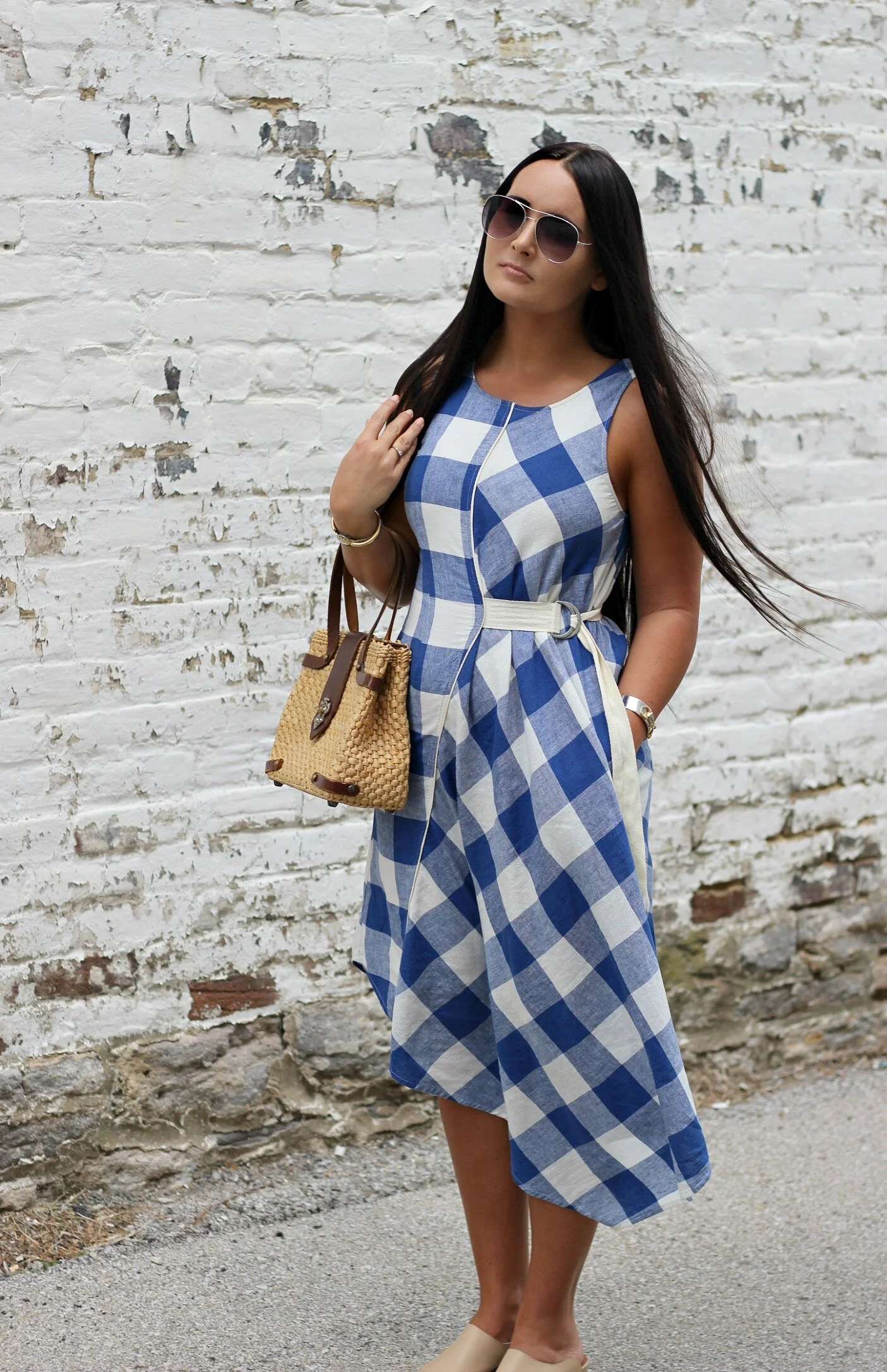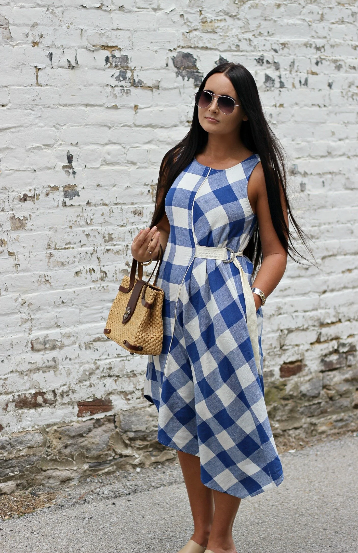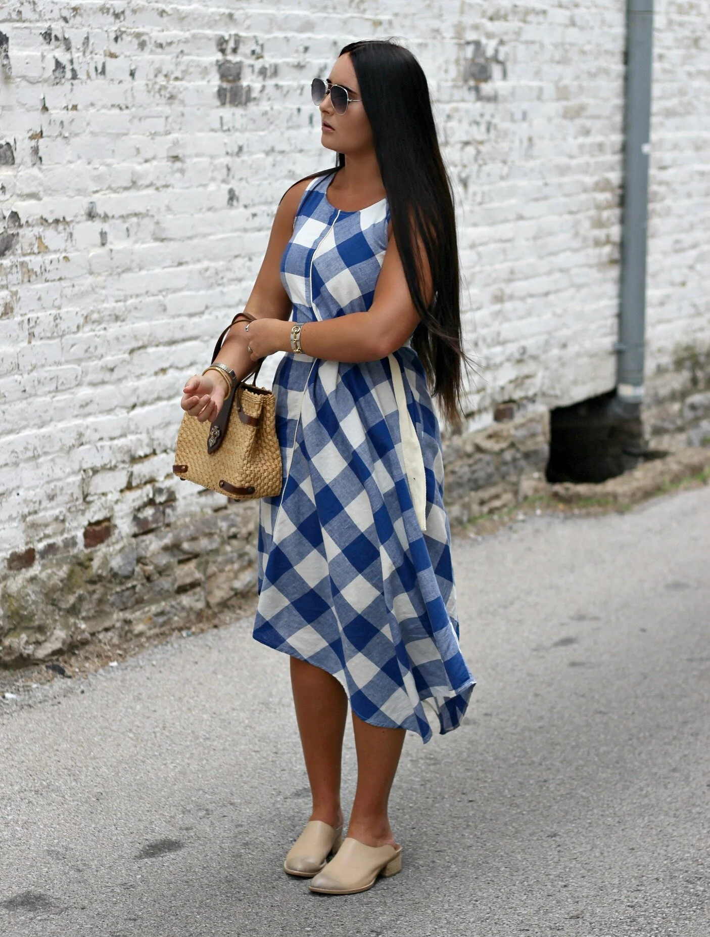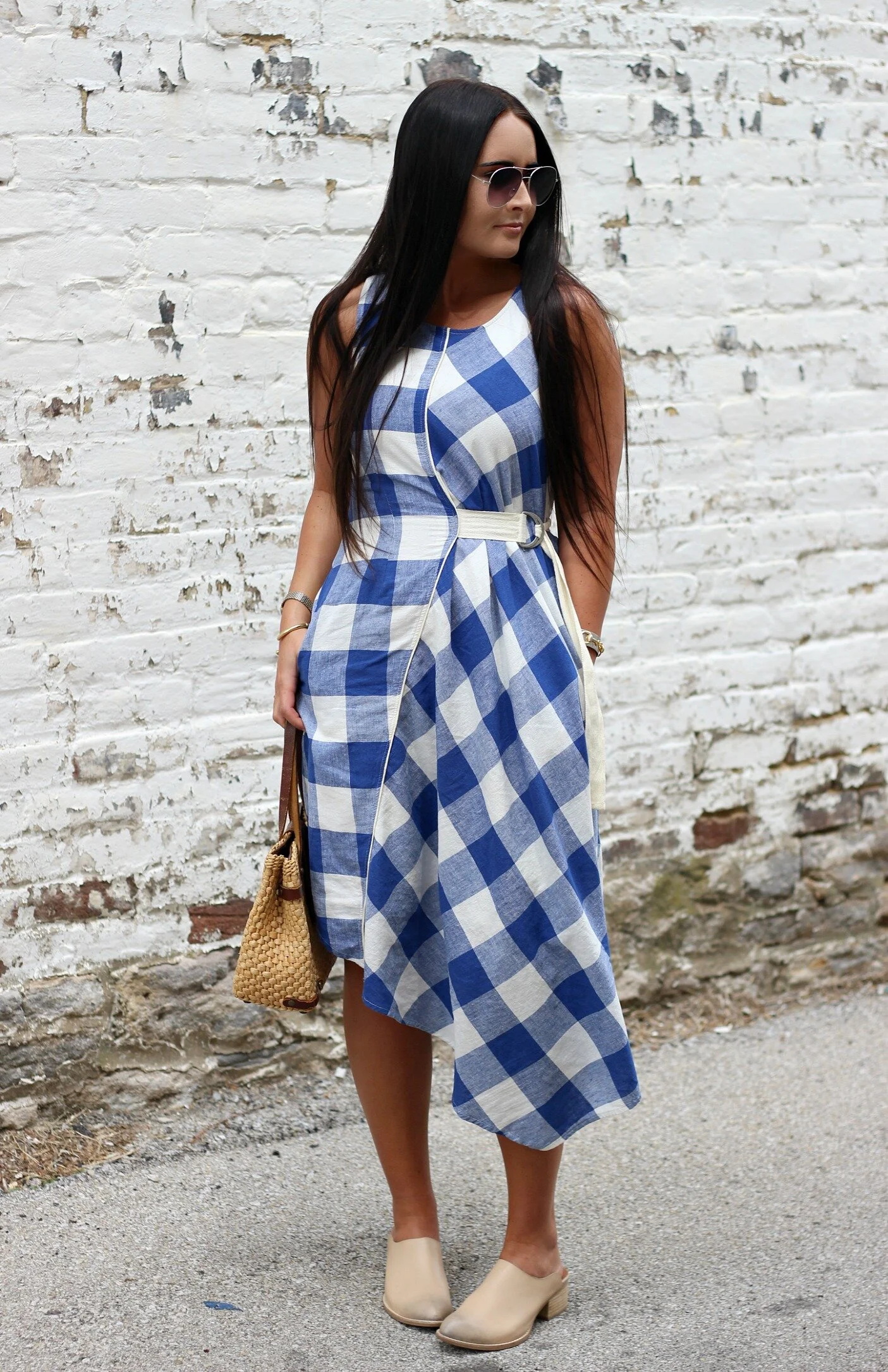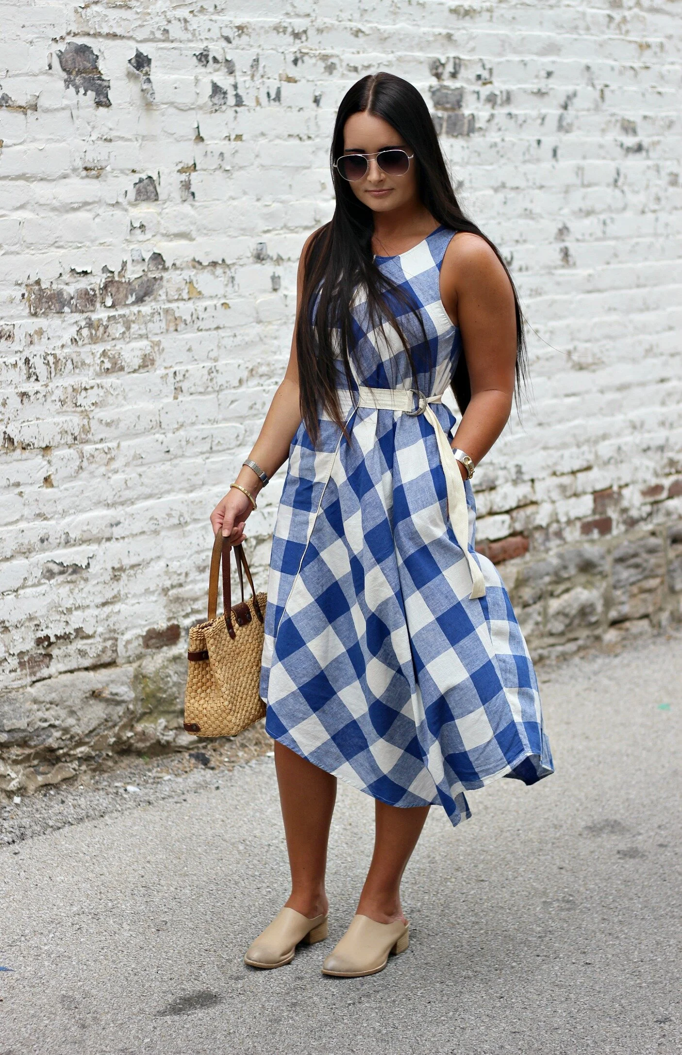 Belted Gingham Dress: Anthropologie | Barrington Leather Mules: Sbicca via Amazon | Basket Purse: Vintage (similar here) | Bangles: Vintage + Lela Ray Jewelry | Sunglasses: Miss Molly Vintage