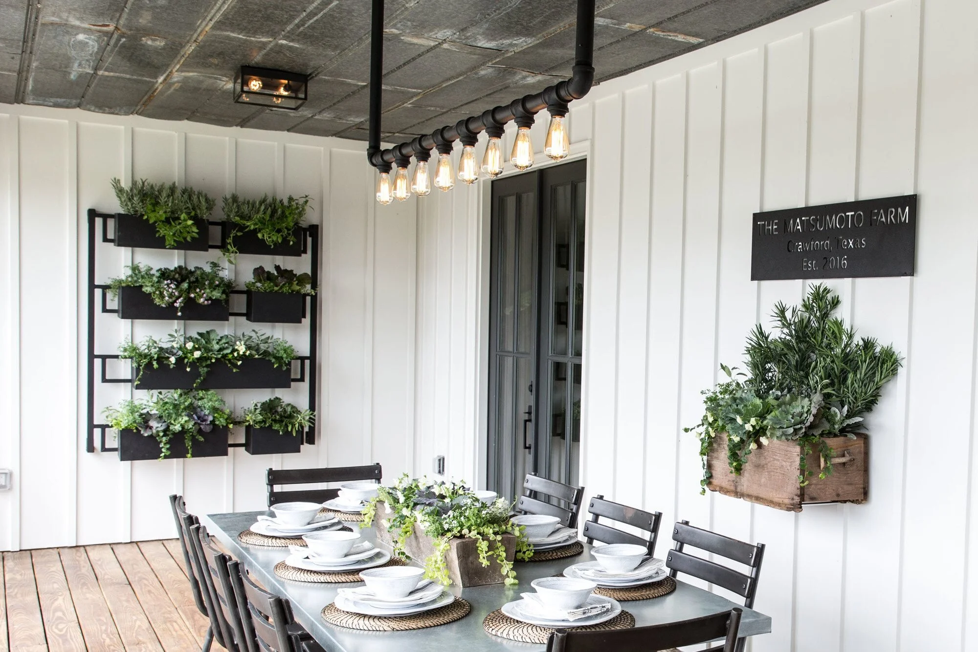 My favorite part of this renovation was definitely the outdoor dining room! I especially loved the materials used in this space: the old tin roof tiles on the ceiling, white beadboard on the walls, and reclaimed wood planks as the floor. I was also just a little too excited to see that Joanna used a light fixture out here that I have several of in my home (the flush mount you see below)! I really loved the custom-made industrial pipe chandelier they designed for over the table too! The metal wall planters are the perfect wall art for an outdoor space and I love the contrast of the black against the bright white walls. I've linked lots of similar light fixtures + wall planters below: