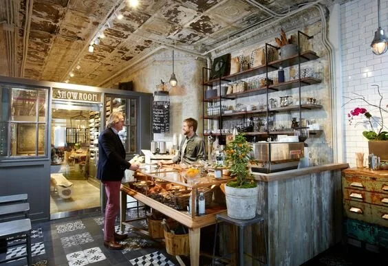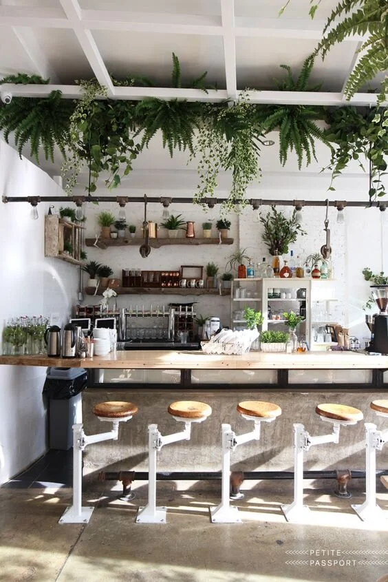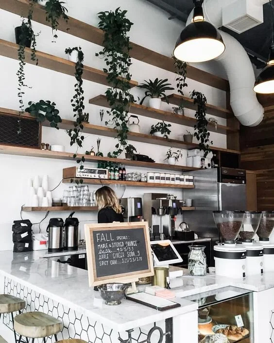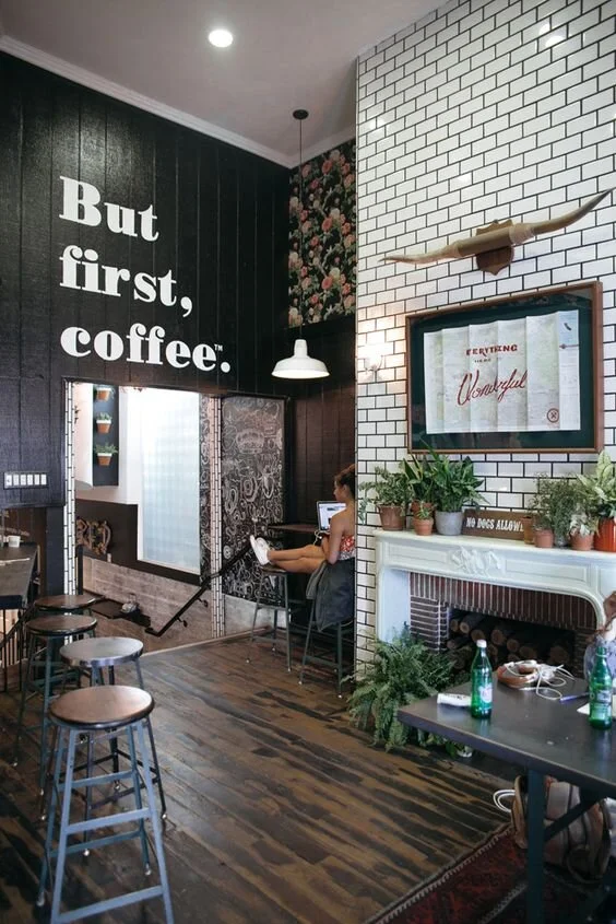 What I envision for our space is something cozy, unique, that perfectly blends the original historical character of the building with modern design. I want this shop to be unlike anything else in Kentucky and I will probably be way too picky over every detail, but in the end I hope we have something that draws people from all around central Kentucky. Thankfully I have the world of Pinterest to collect inspiration after inspiration for my design of this space and I may just have a few too many ideas at the moment! In the coming weeks I will start narrowing down my choices and work towards a more concrete design plan so I can start choosing flooring, fixtures, and lighting. I wanted to share a few of my coffee shop inspirations so that you could get a little mini preview of what I'm picturing for this space! Take a look at my favorites below and let me know what you think- which details stand out to you and what elements would you love to see at Rise + Grind?