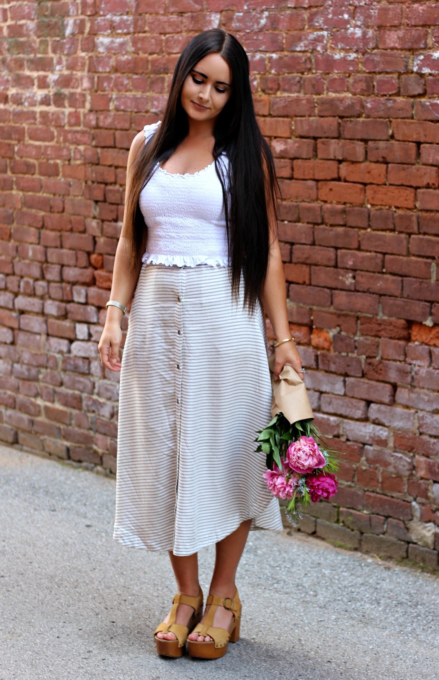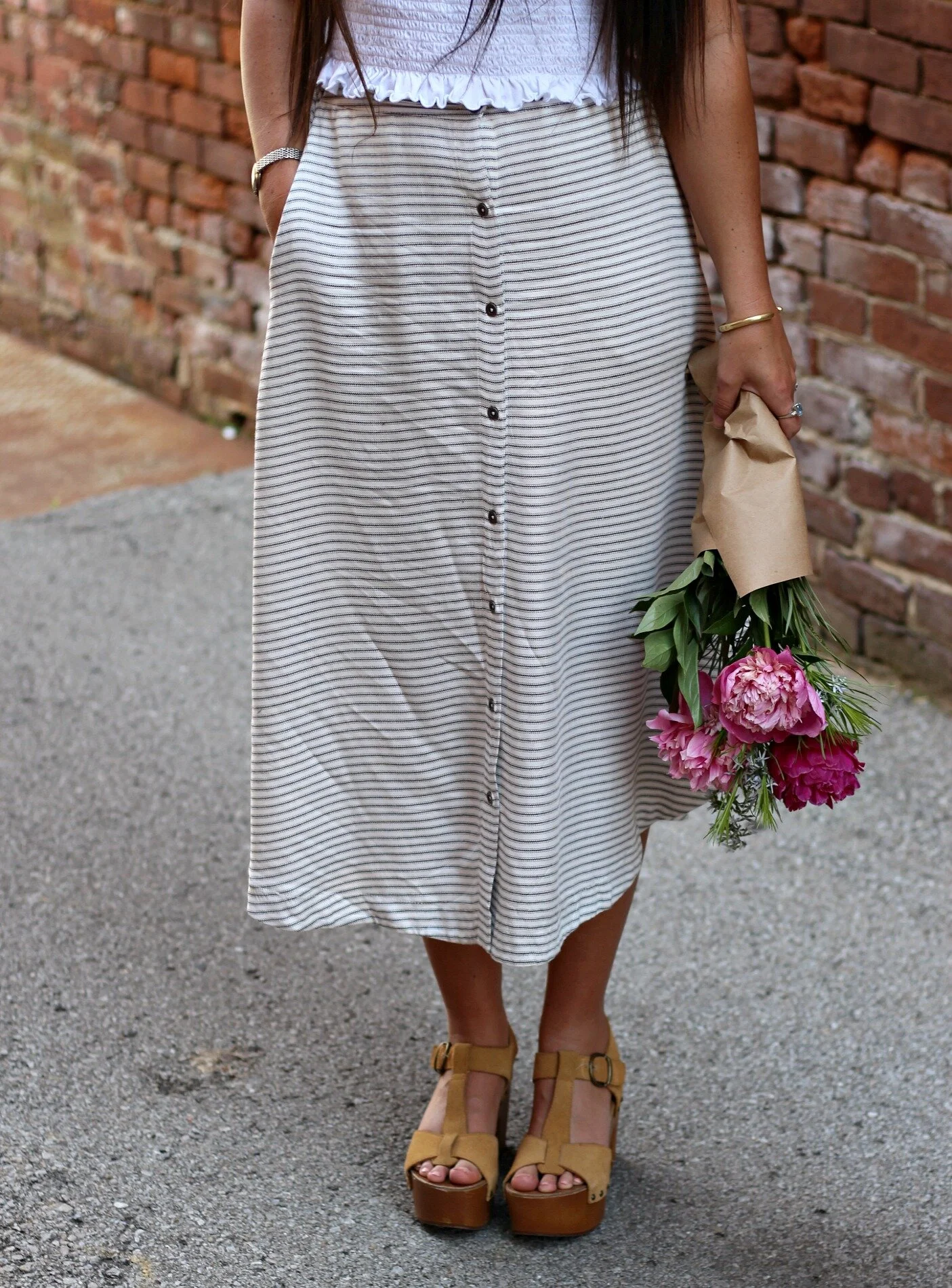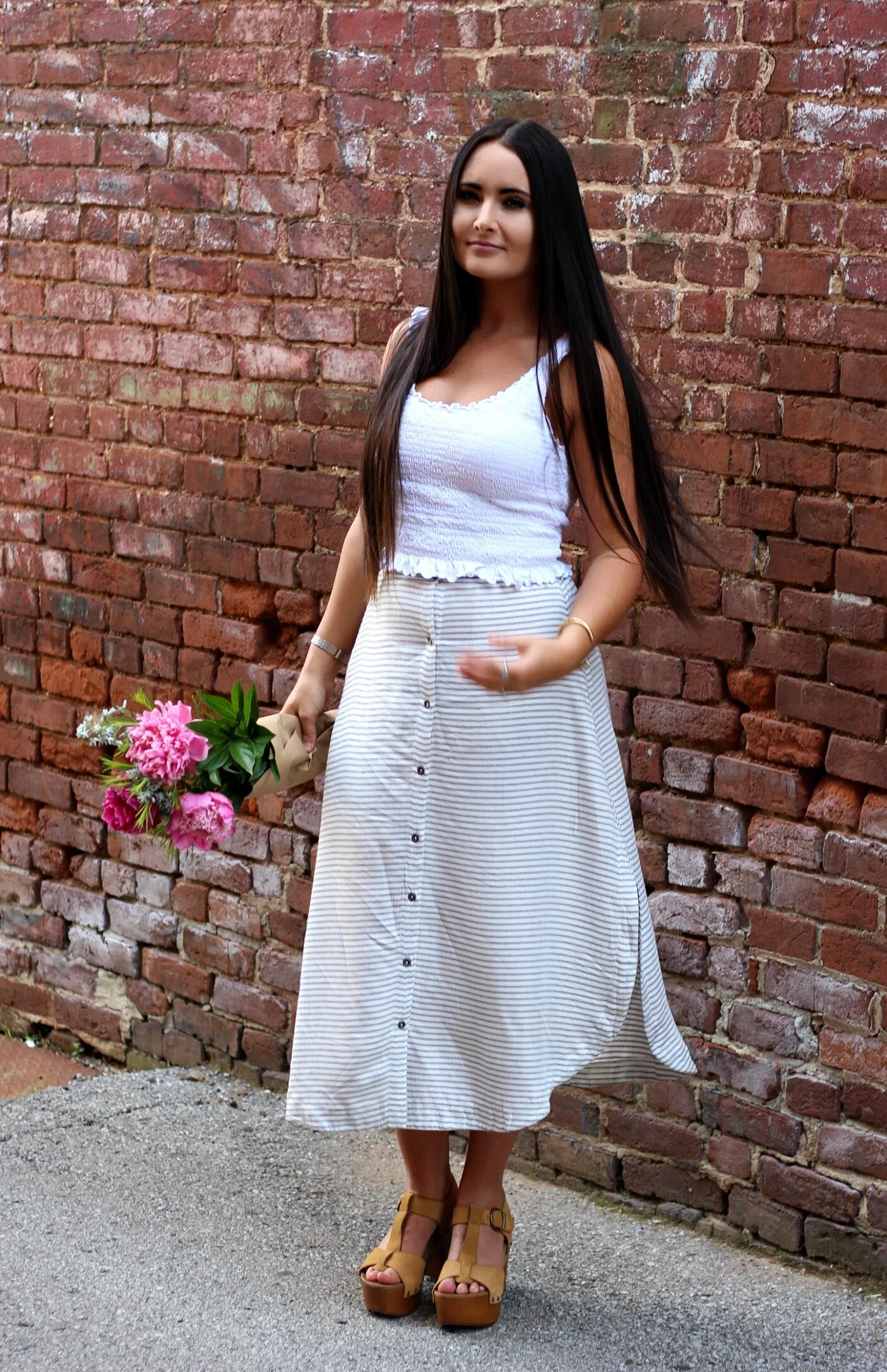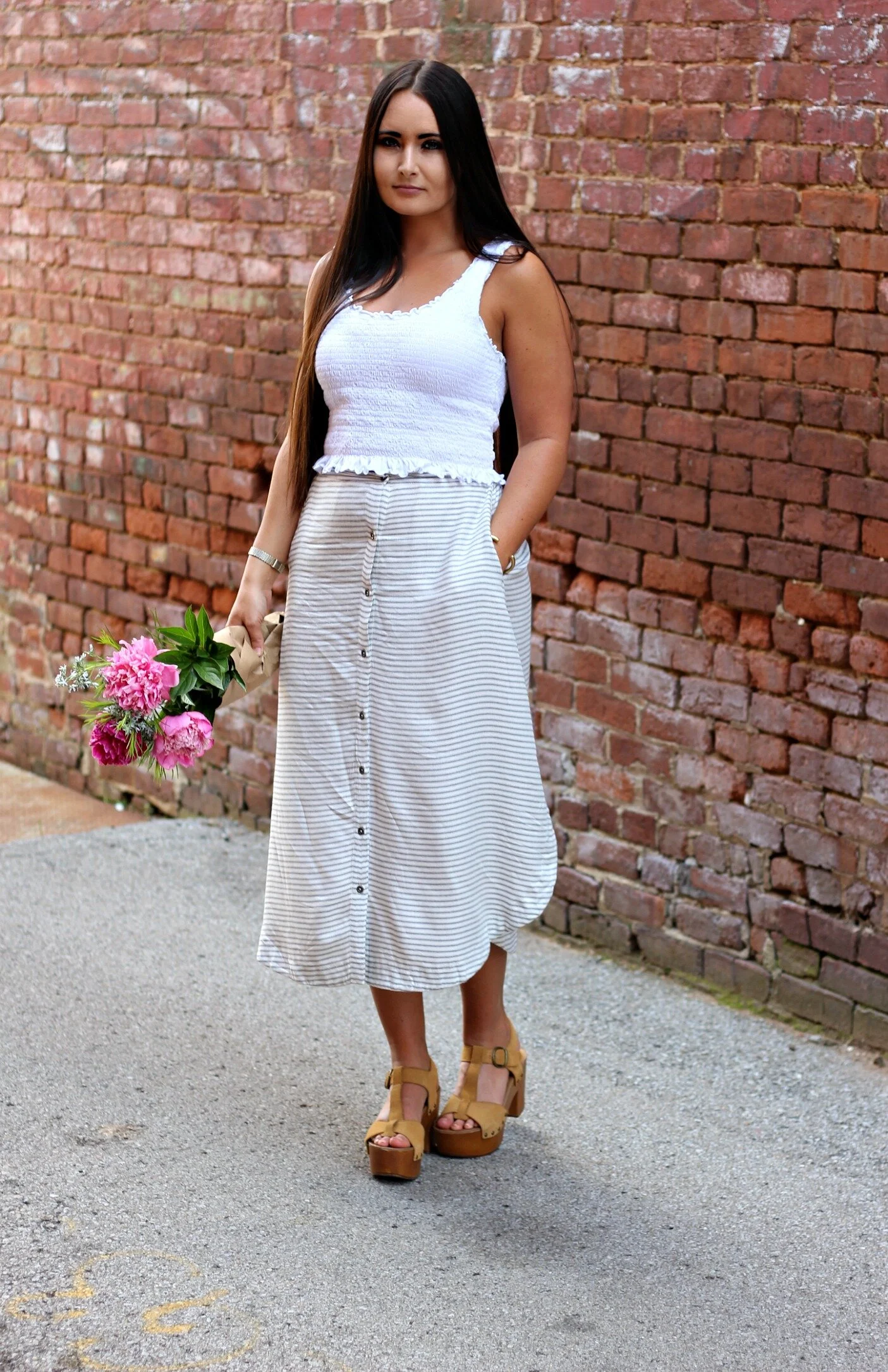 I've developed an obsession for simple white summer blouses and crop tops and this one from Anthropologie just might take the cake! It looks exactly like a sweet vintage top from the 70's which is probably why I love it so much! This smocked tank also comes in 3 other colors and fits true to size (it has a lot of stretch to it so sizing is pretty flexible!). I paired it with a simple + casual striped midi skirt from Target. I love the button front detail and super soft cotton material- perfect for dressing up or down! Both of these basics are must-have pieces for mixing and matching all season and they epitomize laid-back summer style! I've linked them all above + at the end of this post for you to shop!
