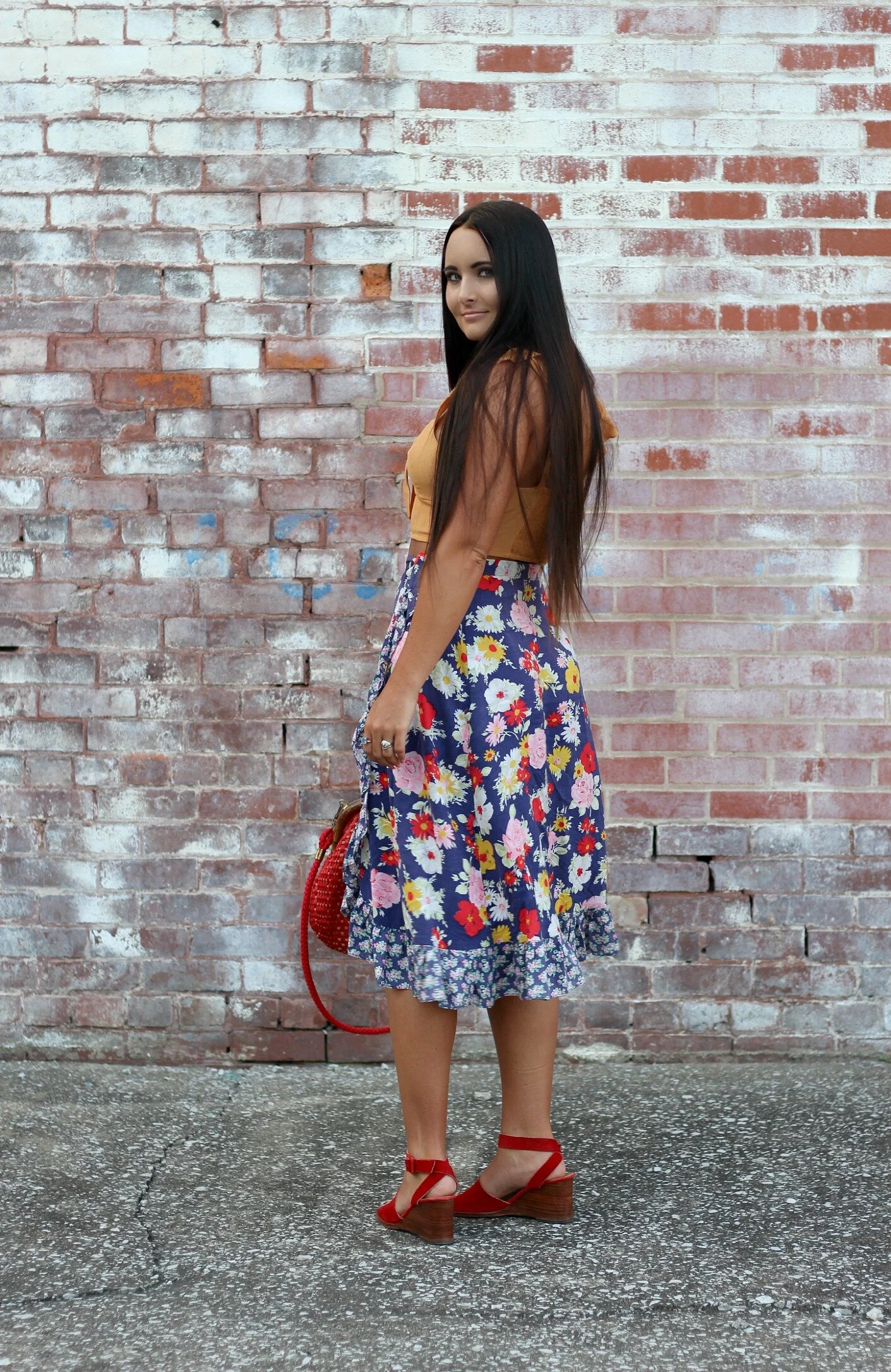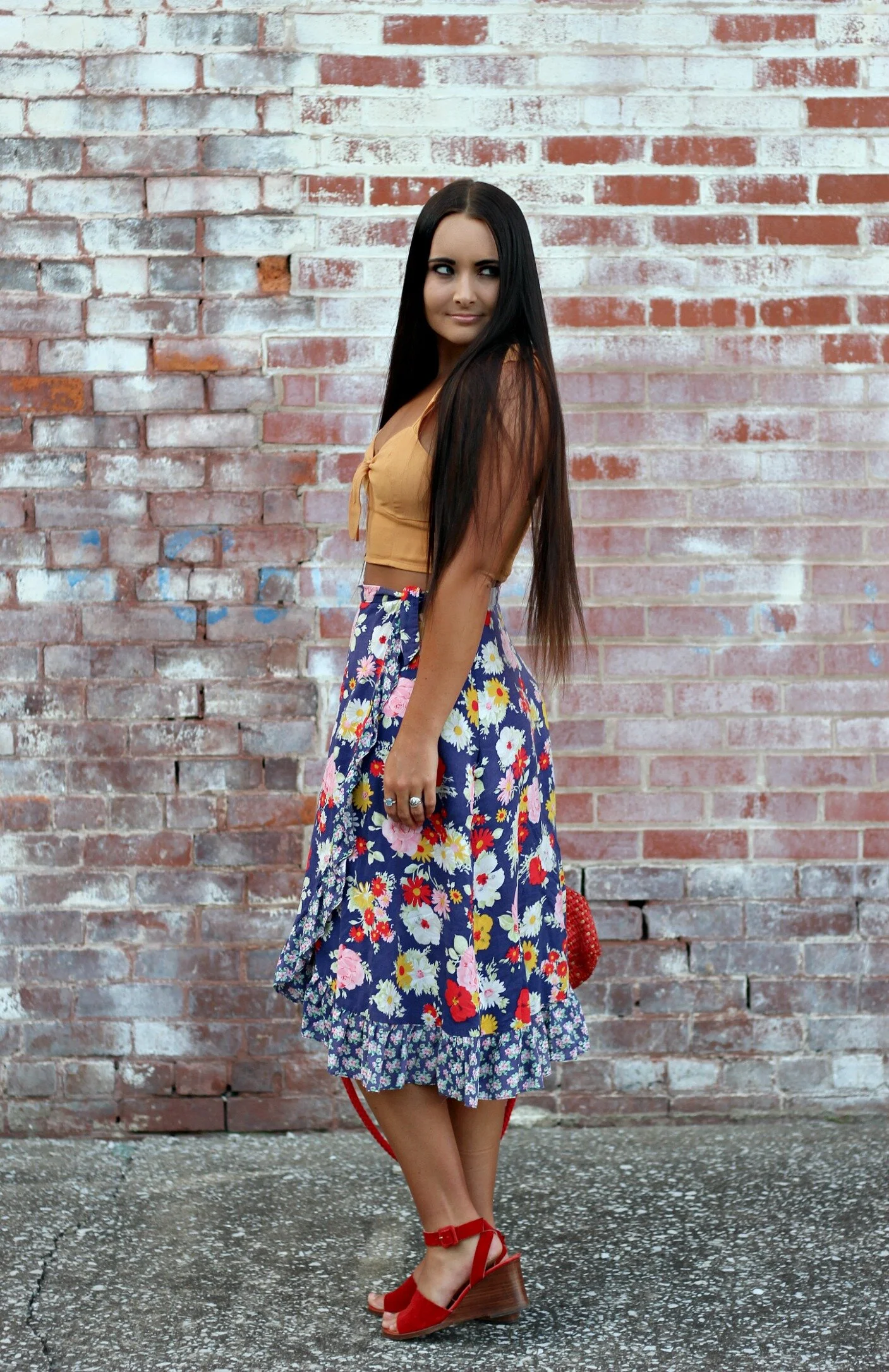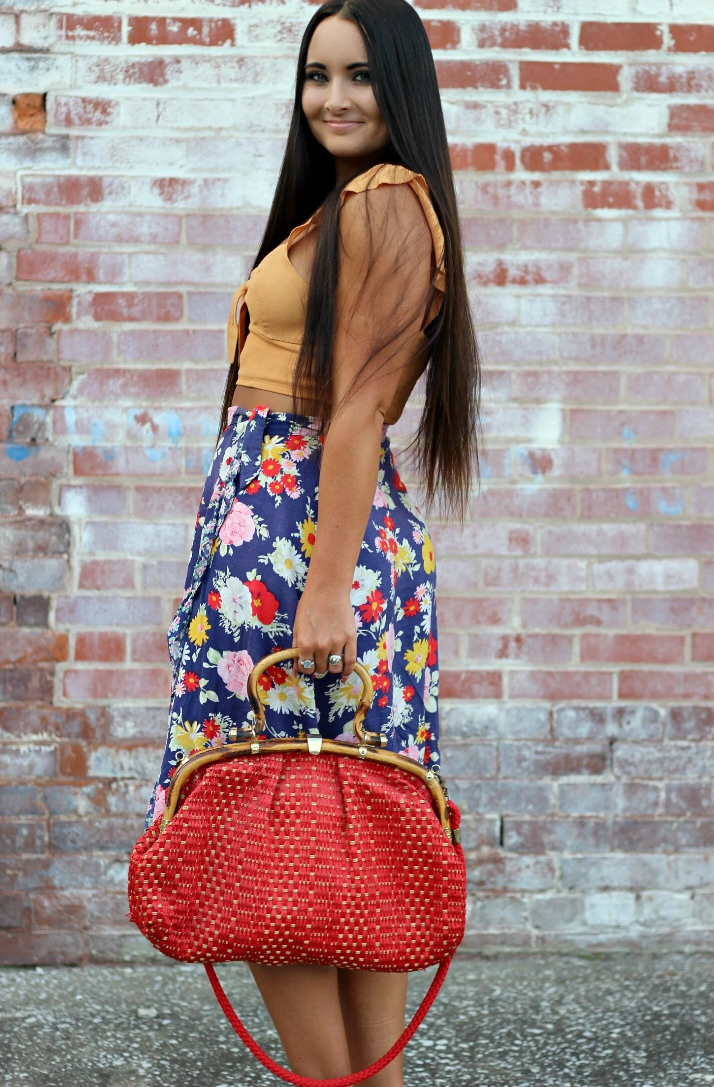 Floral wrap skirt: Vintage-thrifted (similar here) | Tie-front crop top: Forever 21 (old-similar here) | Red wedges: Street Scene Vintage (similar here) | Red woven purse: Vintage- thrifted