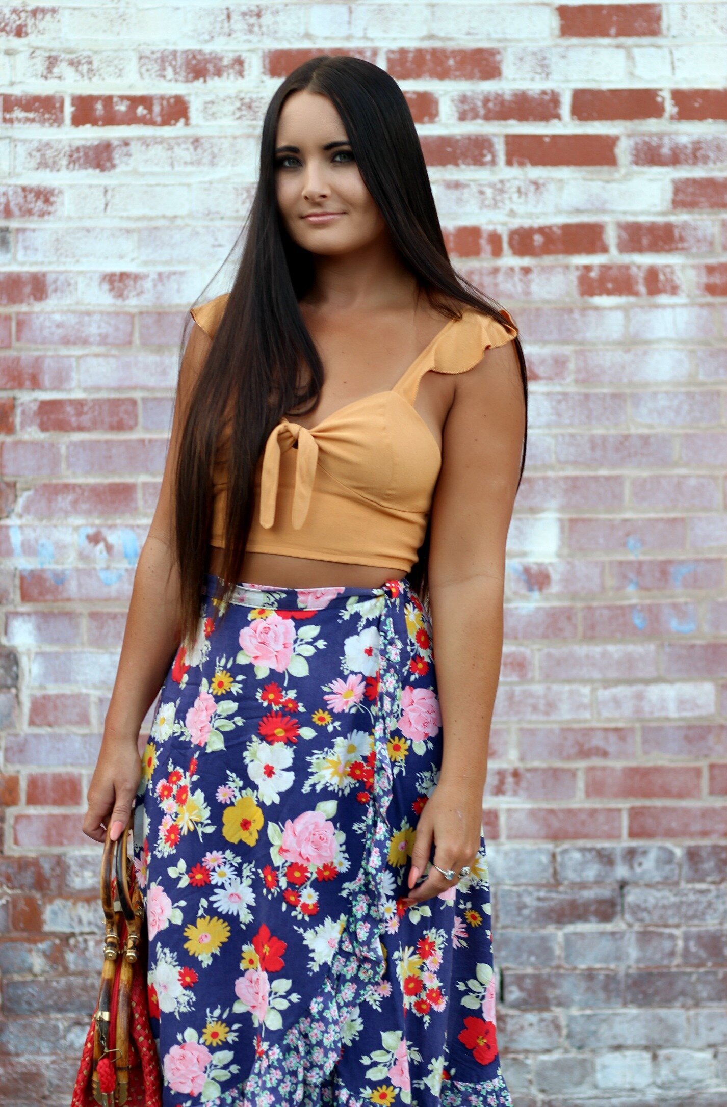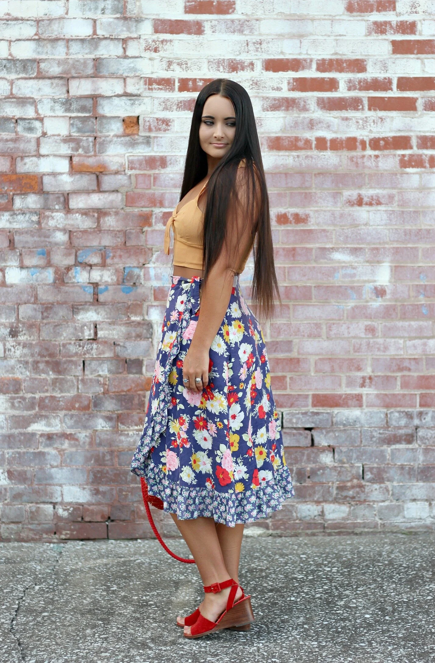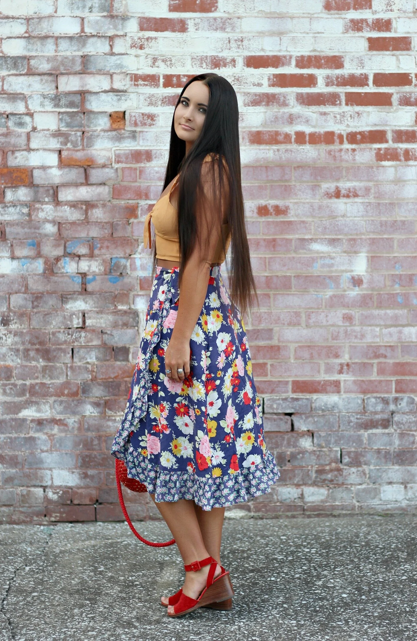 Floral wrap skirt: Vintage-thrifted (similar here) | Tie-front crop top: Forever 21 (old-similar here) | Red wedges: Street Scene Vintage (similar here) | Red woven purse: Vintage- thrifted