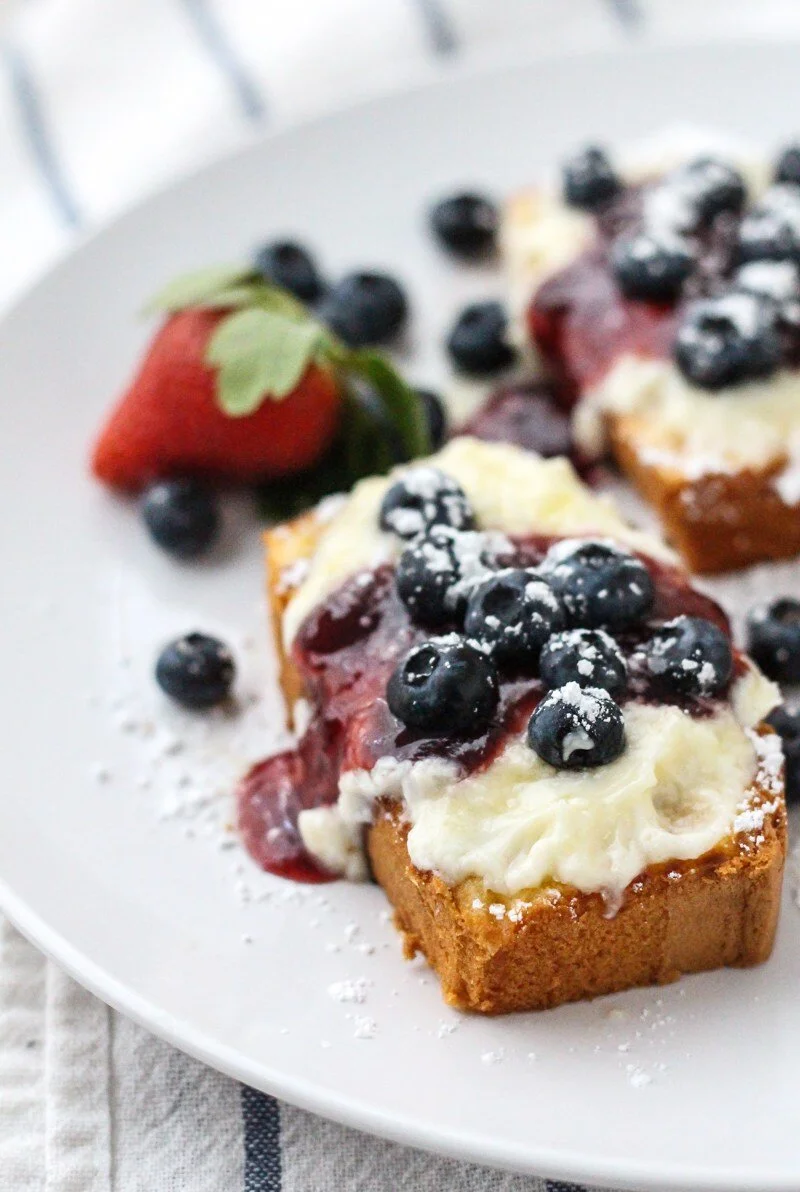 Layers of fresh peaches, blueberries, strawberries, cream cheese whipped cream, and fluffy angel food cake make such a bright + beautiful dessert that is also perfect for sharing in mason jars! Get the full recipe here.
