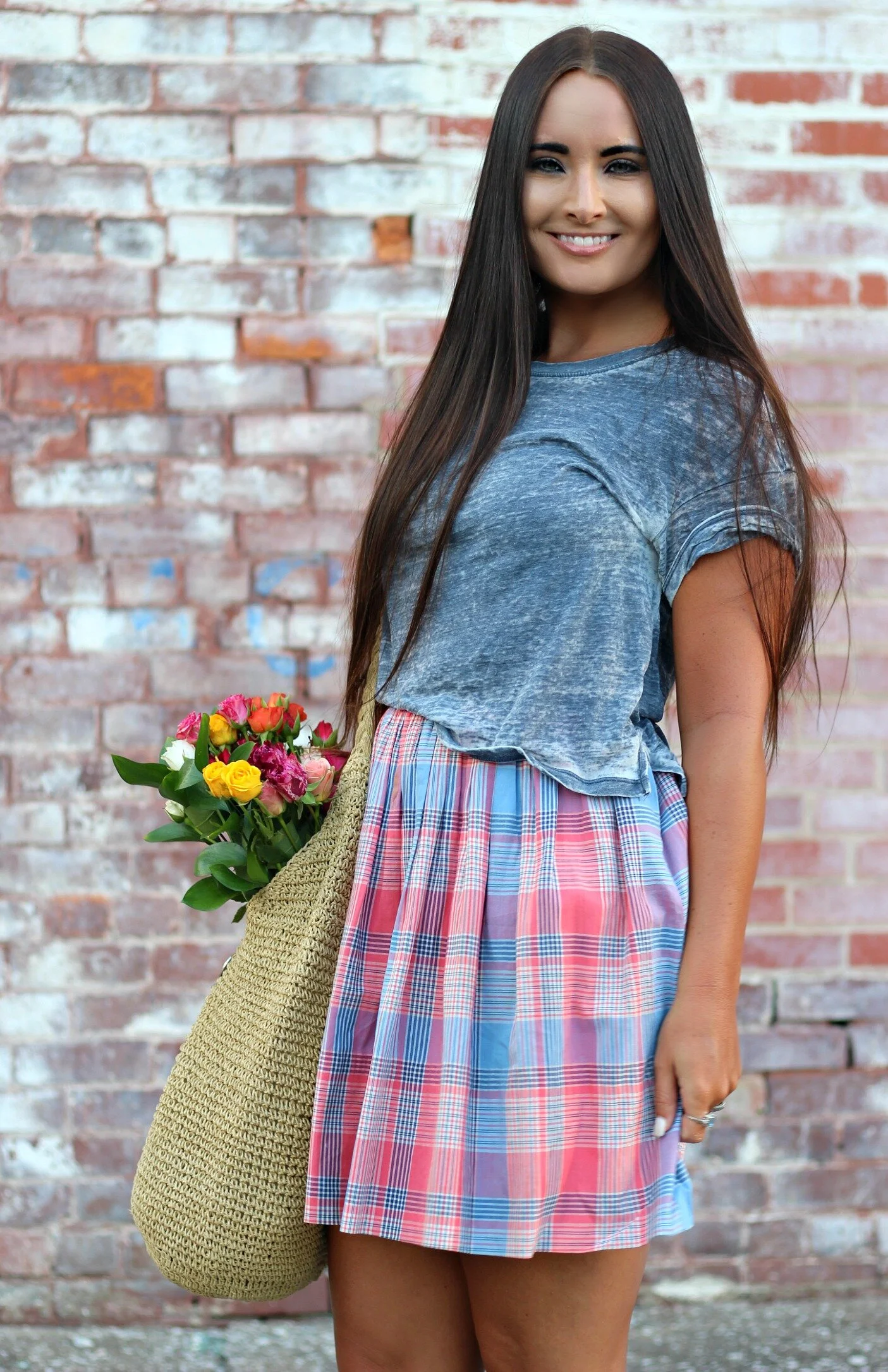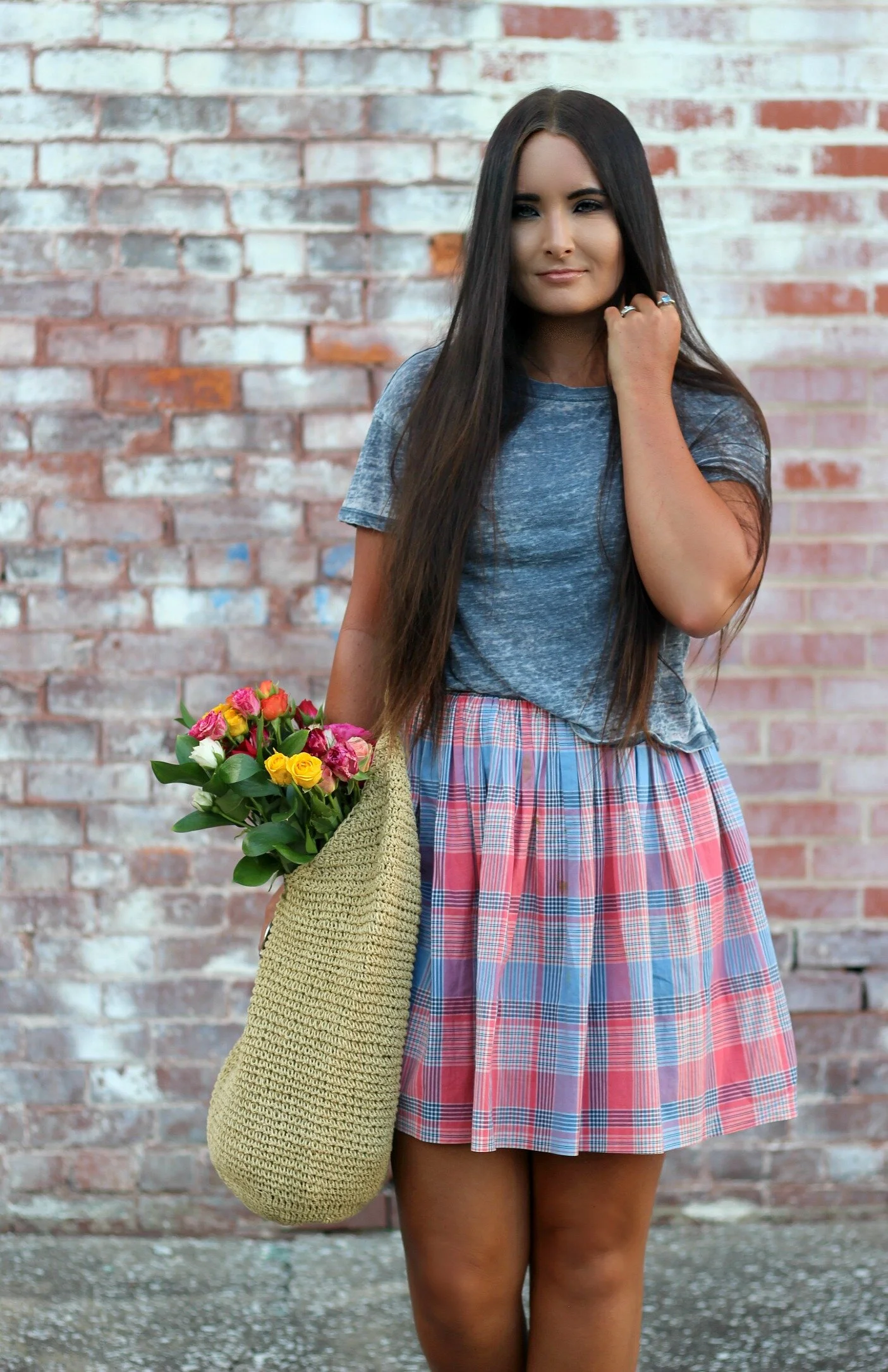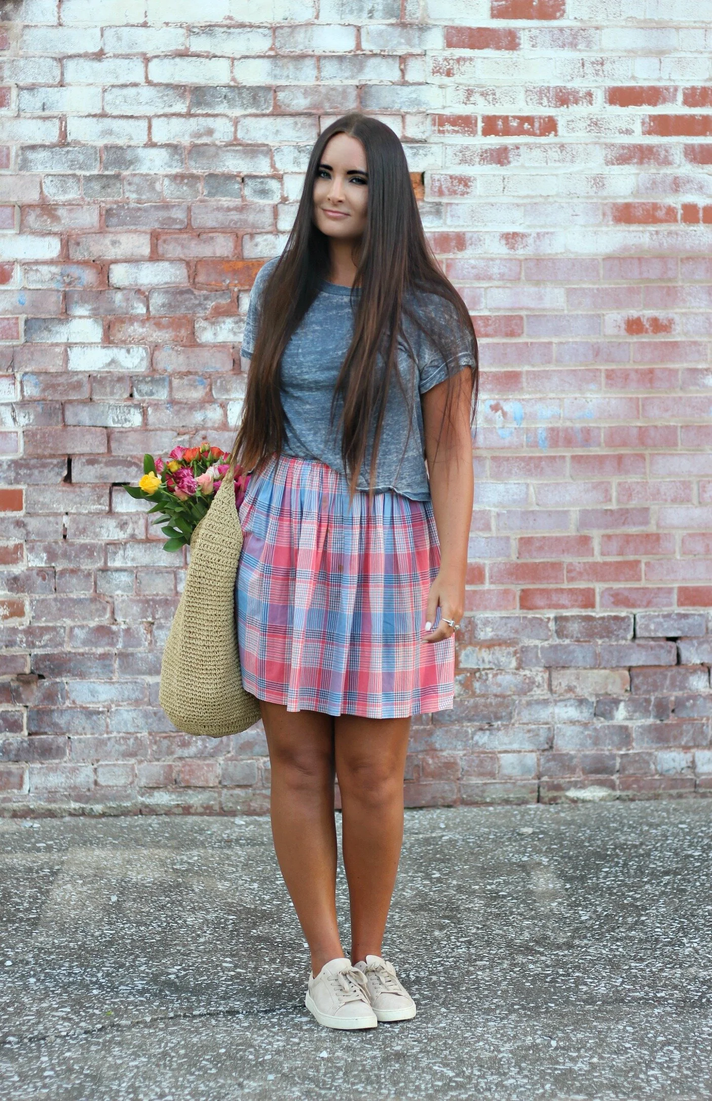 Obviously I can't get enough of my vintage printed skirts lately and this combo pretty much sums up my ideal summer weekend outfit! I love pairing more casual staples like a distressed tee + sneakers with my favorite girly vintage skirts. This one is several years old but the shorter length + vintage plaid will make it one of my favorites for years to come! I've linked lots of similar skirts, tees, and my fave (and most comfy) summer sneakers from Frye at the end of this post for you to shop!