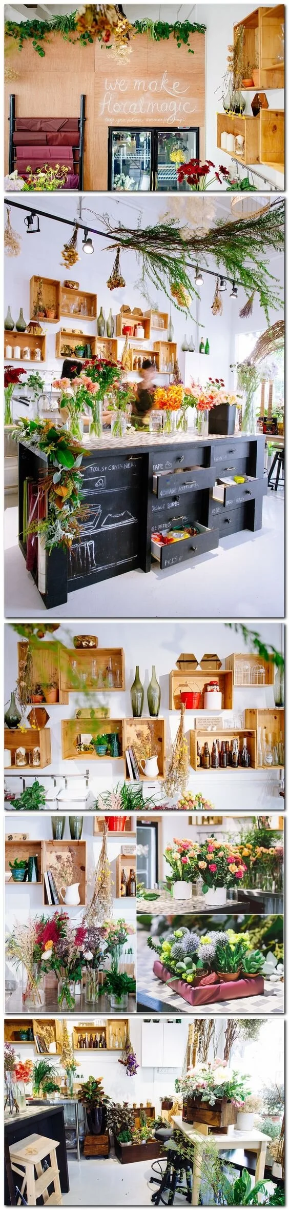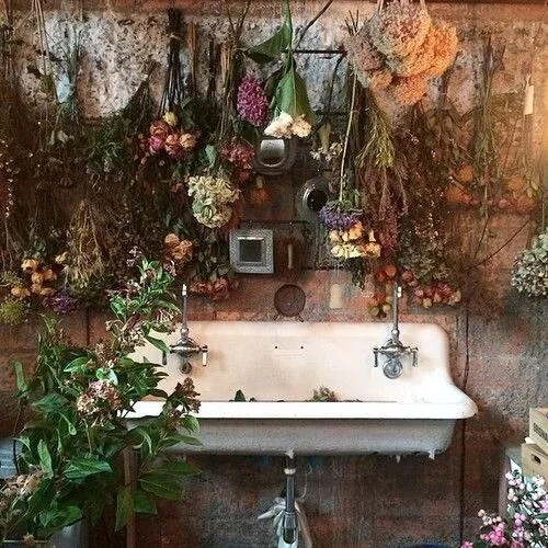 If you follow my projects and home decor, you know I am plant and flower crazy, so I felt like this passion just had to be included in my latest venture. We are planning to have a large open trough-style sink to anchor the space and give it that old-fashioned flower shop feel. Besides that I'd love to have layers of shelves and mismatched metal buckets and containers to hold all the stems, bouquets, and greenery. I've gathered up a few of my favorite inspirations for this space below. Let me know which are you favorite and what you would love to see incorporated into this space!