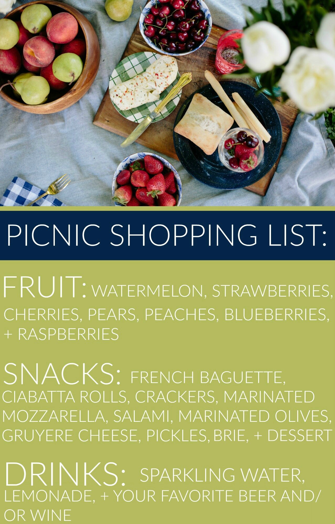 Nothing says summer like a picnic spread full of bright and colorful fruit,  gingham galore, and lots of snacks + light bites to share.  It's also a perfect excuse to get outside with friends and family and enjoy a meal in the sunshine or even under the stars.  I've made your picnic prep super easy by putting together a list of easy to transport picnic foods that also require zero prep so they're ready to pack straight from the grocery!  You'll also find my list of picnic essentials to help you set up the prettiest summer spread around!  Grab both of these printable lists below and then you're ready to pack away- happy picnicking!