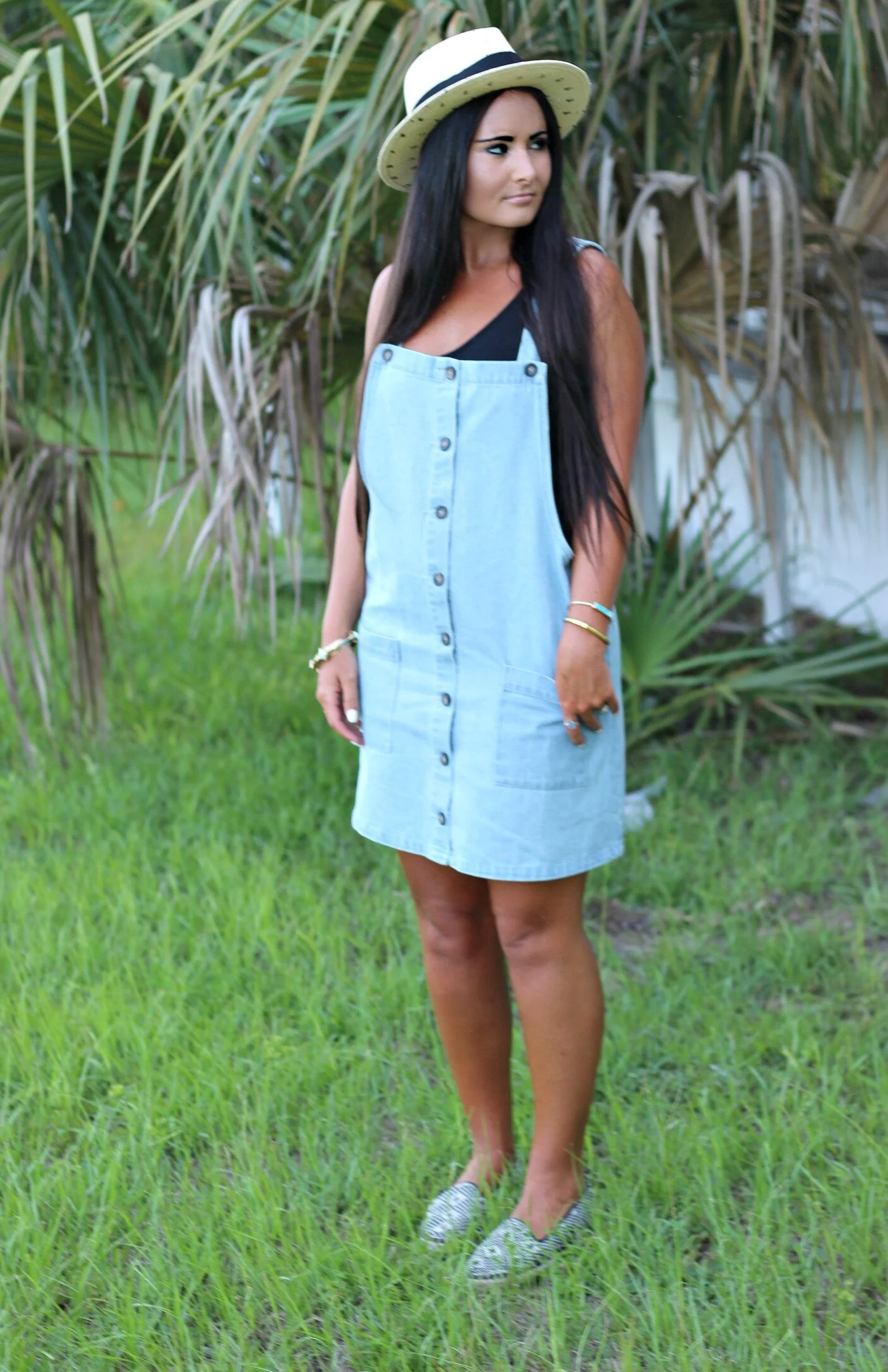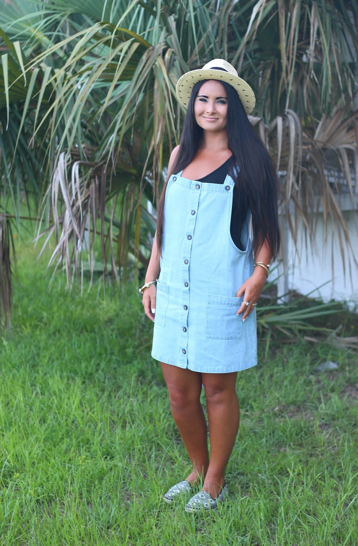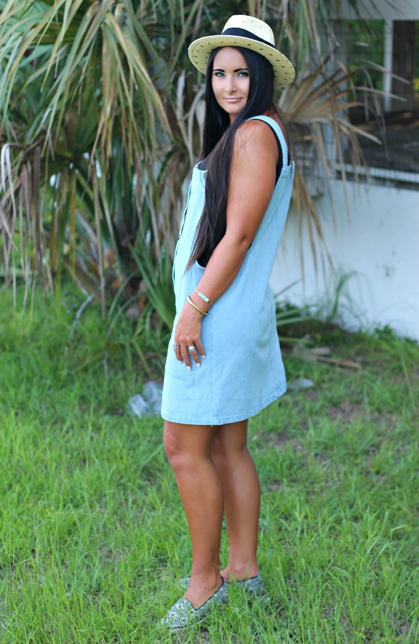 Denim dress: c/o Blush Box + Co. | Straw hat: Worn + Co. | Black bodysuit: Target (similar here) | Espadrilles: Target