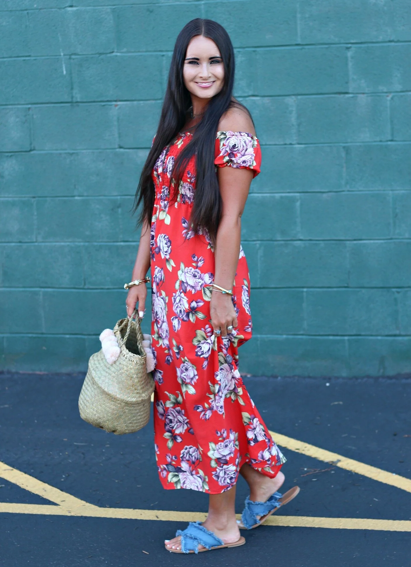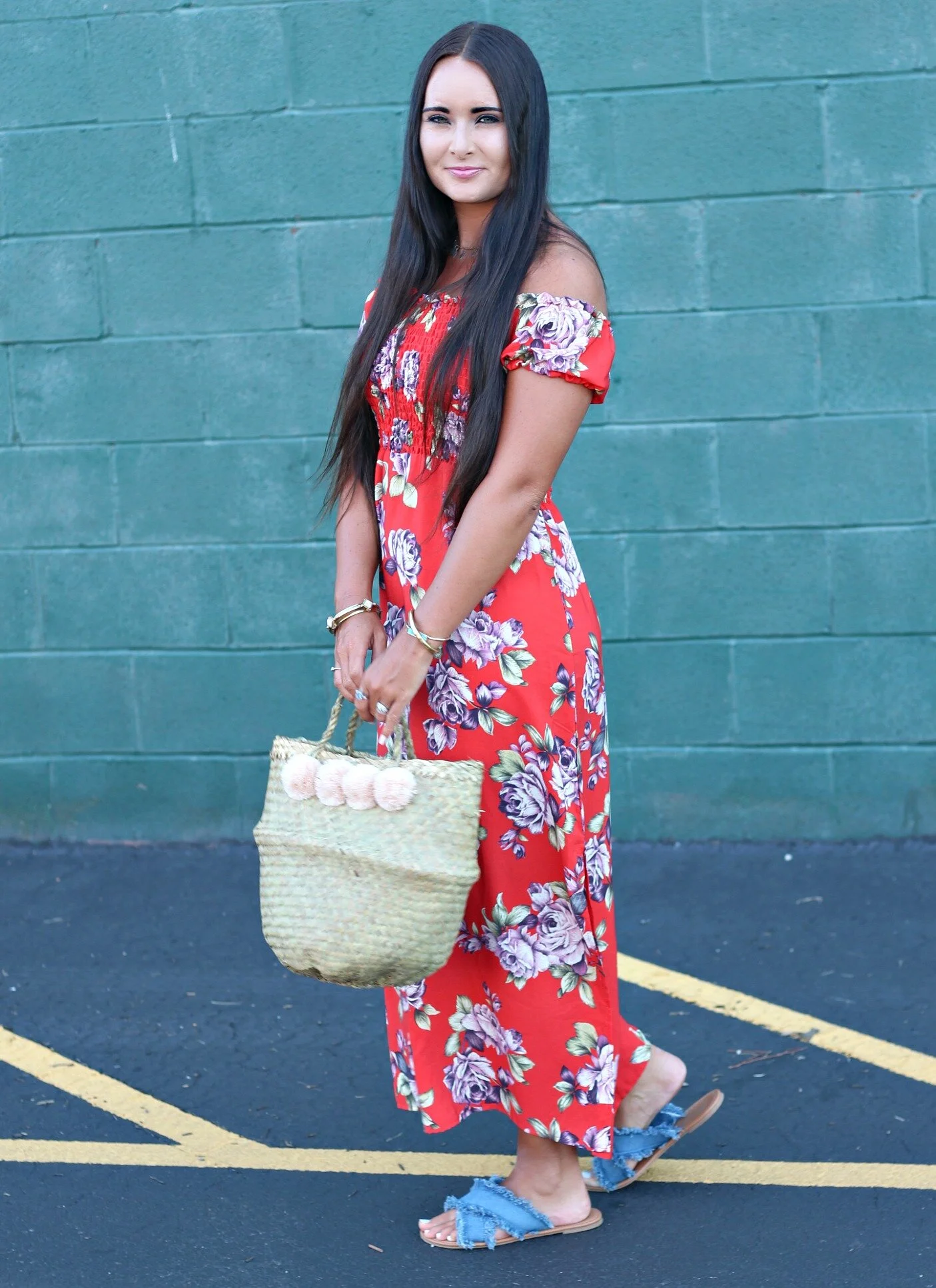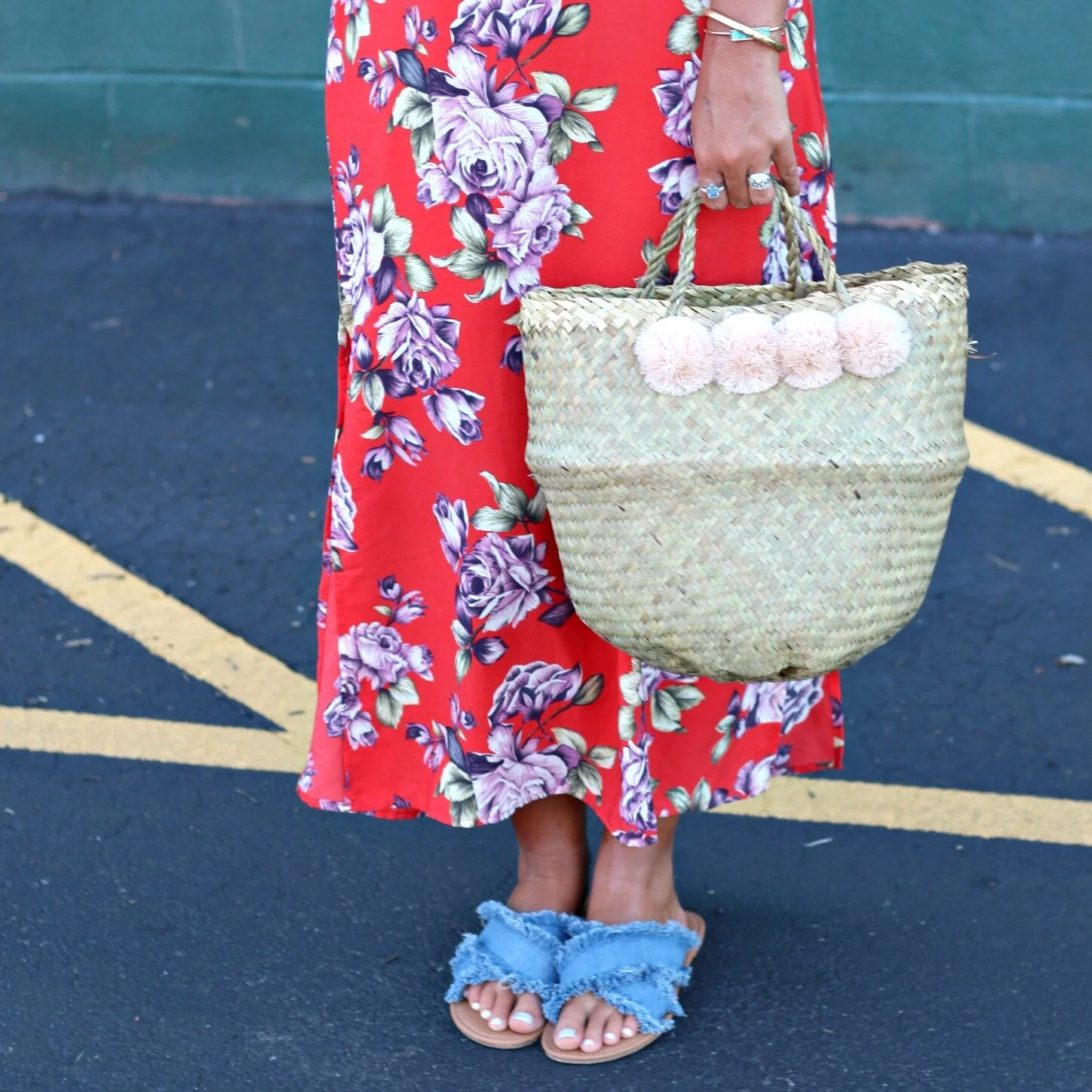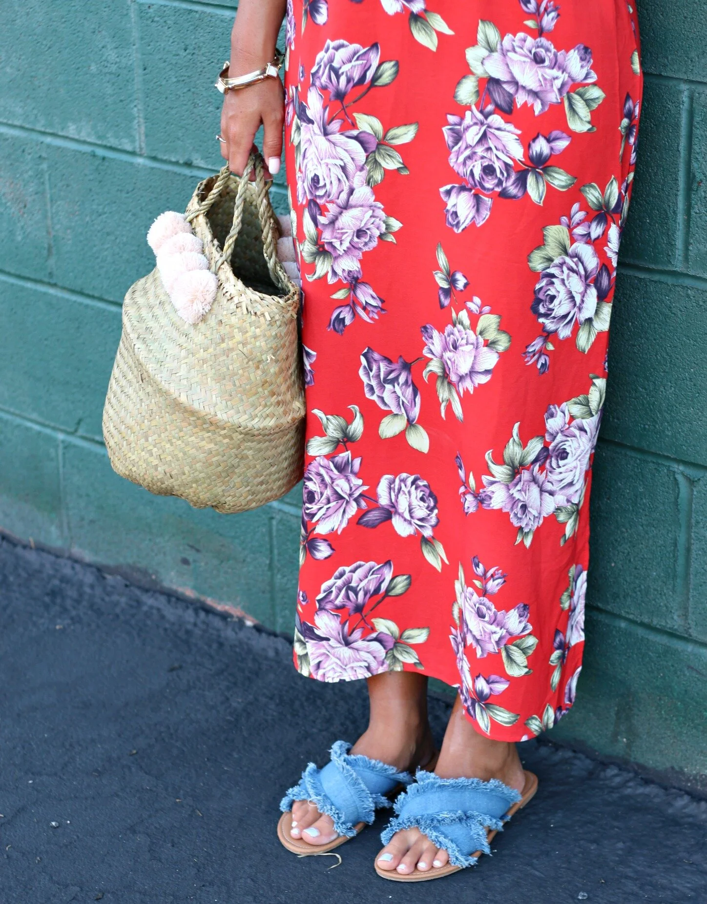 Floral maxi dress: TJMaxx (similar here) | Pom-pom basket purse: Xinh + Co. (small size) | Raw-hem denim sandals: SheIn | Necklace: Street Scene Vintage | Bangles: Vintage