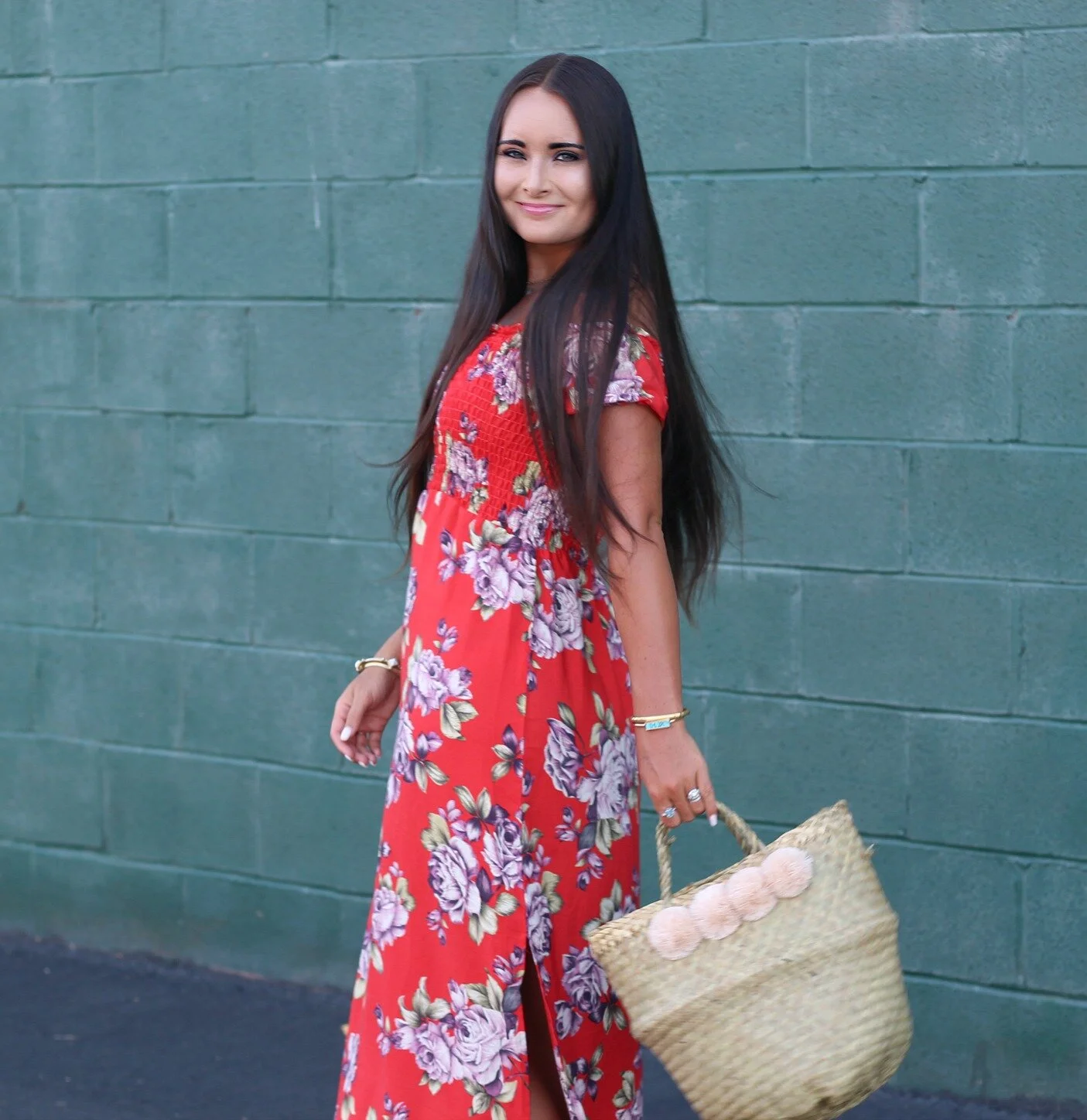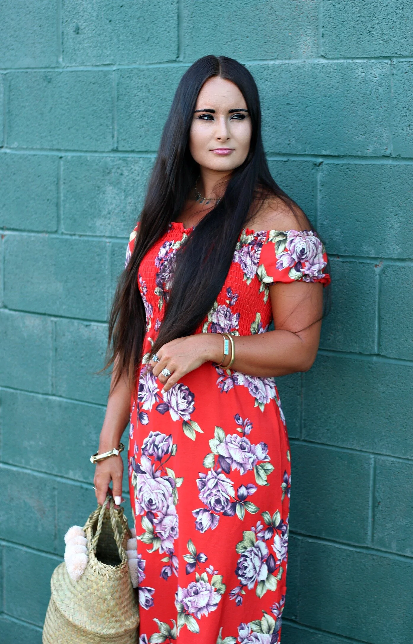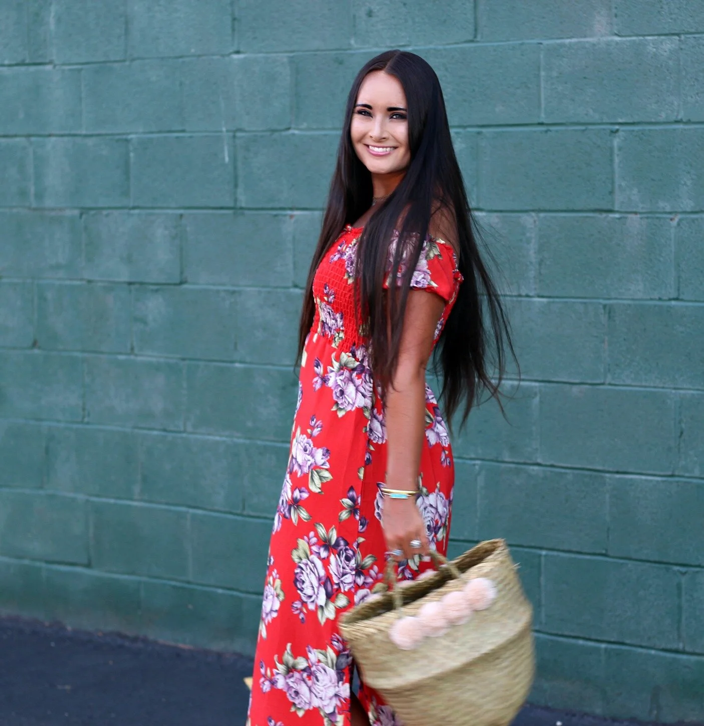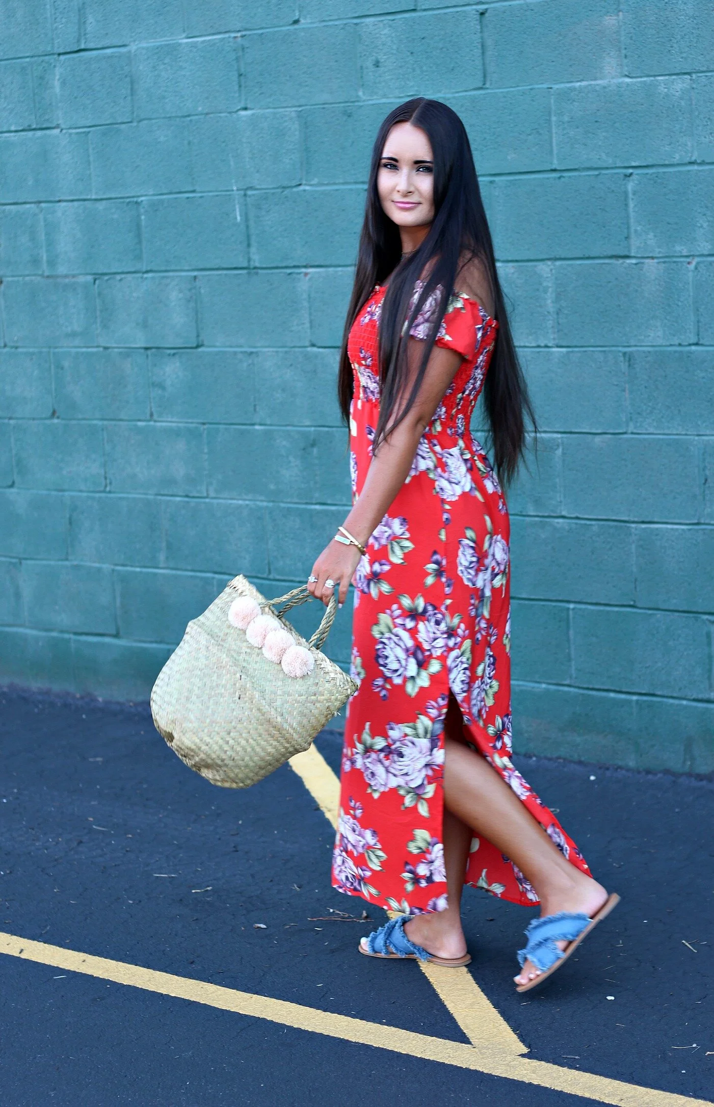 Floral maxi dress: TJMaxx (similar here) | Pom-pom basket purse: Xinh + Co. (small size) | Raw-hem denim sandals: SheIn | Necklace: Street Scene Vintage | Bangles: Vintage