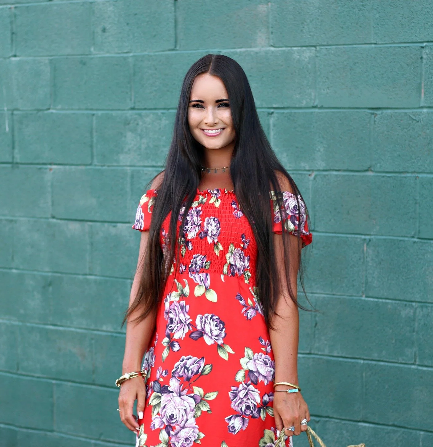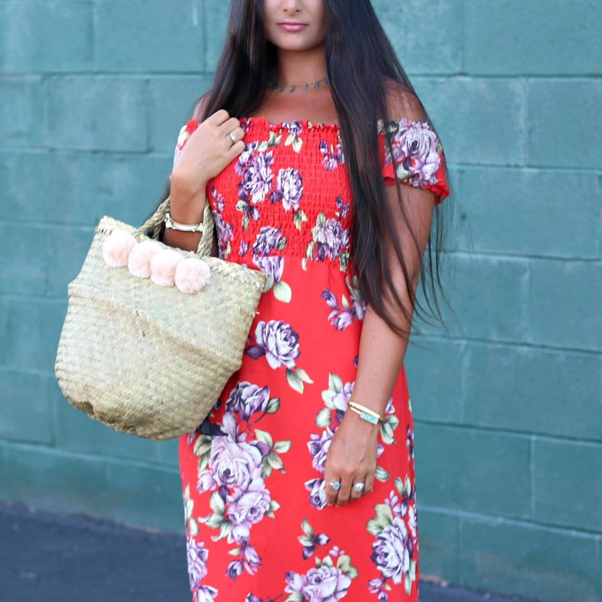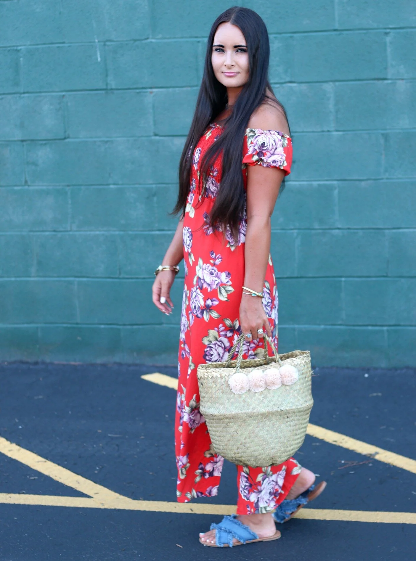We all know that good ol' TJMaxx is feast or famine when it comes to selection, and I can always count on it to have the MOST amazing selection when I'm NOT looking to buy anything! That was the case this past week when I stopped in to look at the home decor and got completely sucked in to the amazing collection of floral dresses and summer tops! The racks were literally overflowing with pieces and I was so overwhelmed, I did not even get to look through everything! I don't know if all the stores have gotten such an influx of inventory lately, but I would suggest heading over and checking out your nearest store just in case! This floral maxi was just one of the items I snagged (AND it was on clearance too!). I love the smocked top and off the shoulder silhouette plus it's a super casual and light material that can be dressed up or down easily. I paired it with two of my favorite summer accessories: these denim flip-flops and this amazing pom-pom straw bag! You can shop all these items and some more similar picks at the end of this post!
