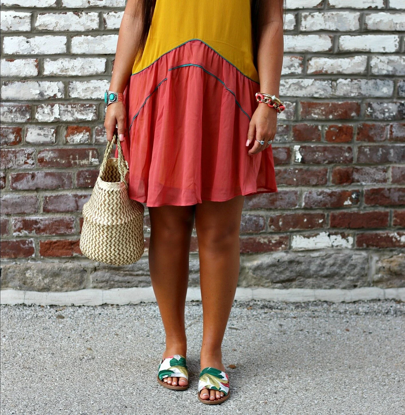 Colorblock Dress: Target | Floral Slides: TJMaxx (similar here) | Basket Tote: Miss Molly Vintage (milk stripe | mini size) | Bracelets: Vintage