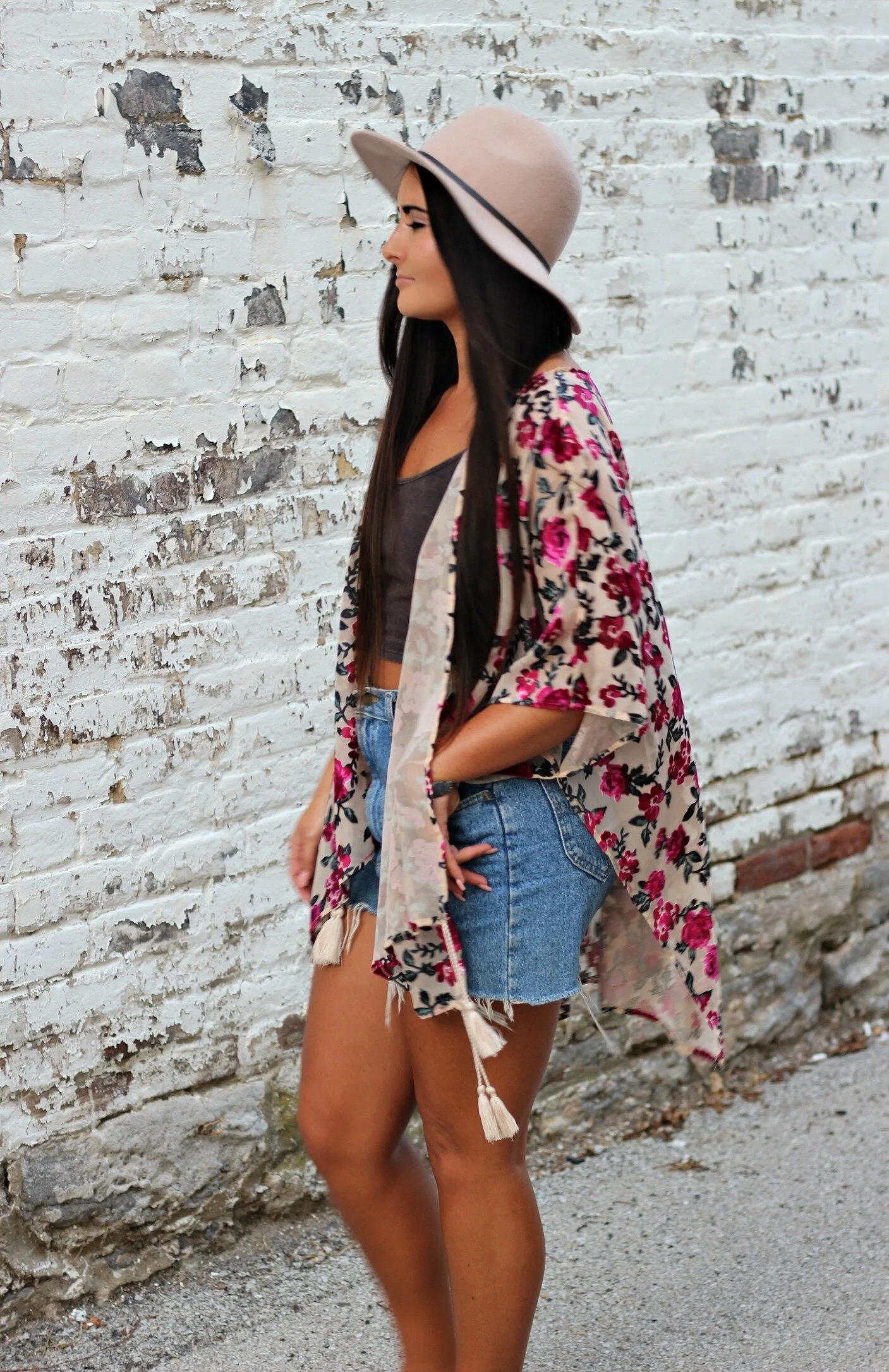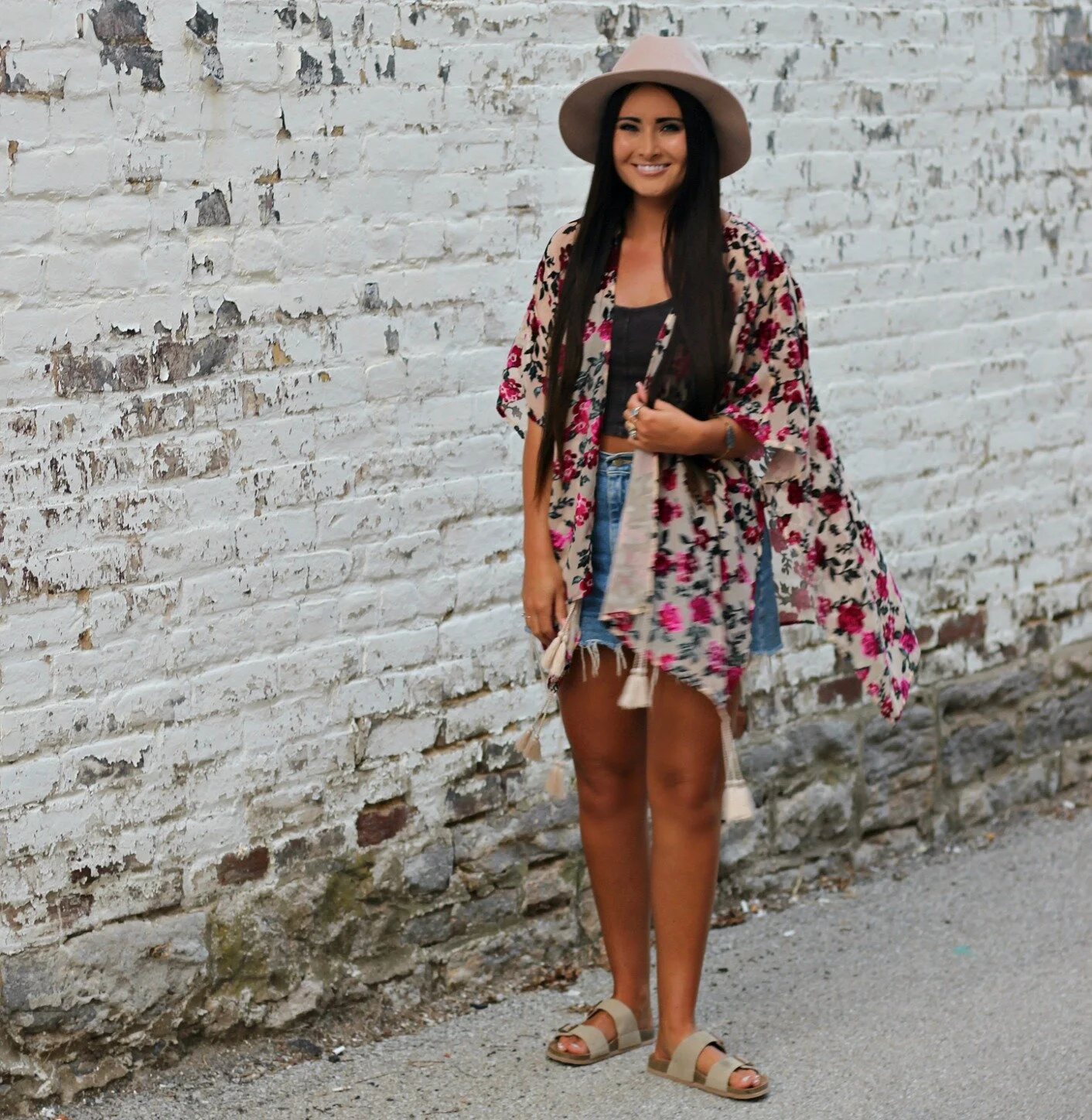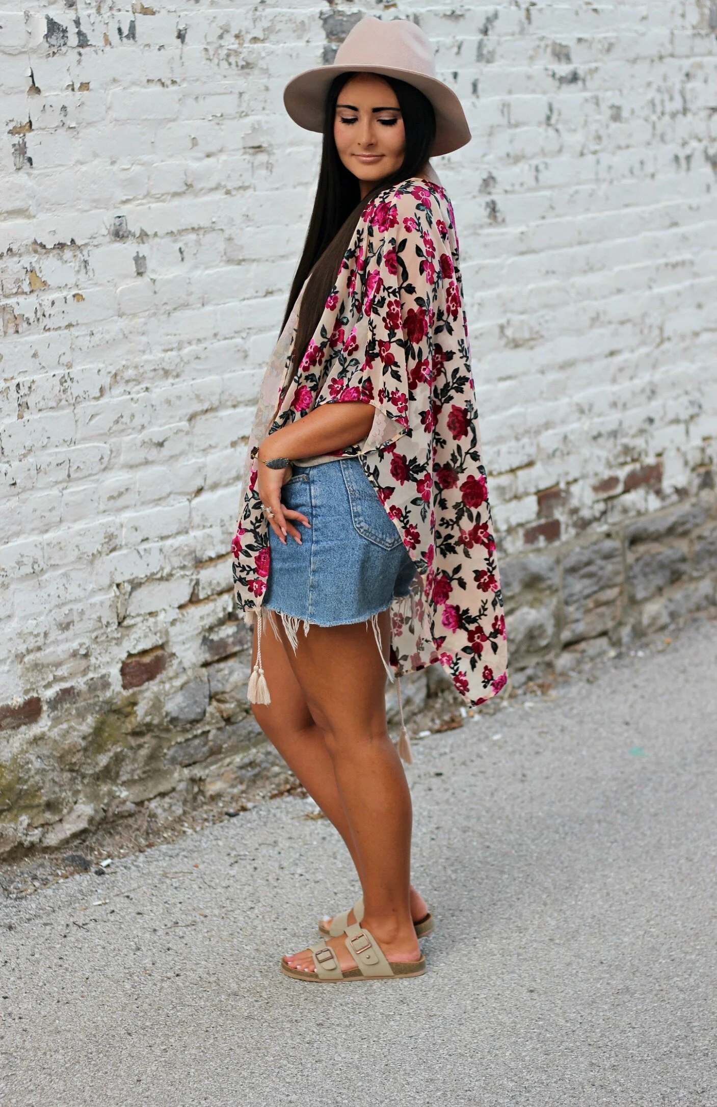 If there's one piece that can help your wardrobe effortlessly transition from summer into fall, it's the kimono. This piece is perfect for throwing on over a simple tank or crop top and cut-off shorts (like I'm wearing here) in late summer, but also looks great with jeans, slouchy sweaters, or knit dresses and boots come fall. It's an ideal layering piece that is light, flowy, and super flattering to all body types. I loved this one from TJMaxx because of the velvety material (so vintagey looking!), tassel details, and bold colors. I look forward to pairing this with cozy knits + fall neutrals in the coming months too. I've linked tons of similar floral velvety kimonos and more of my outfit details for you to shop above + below!