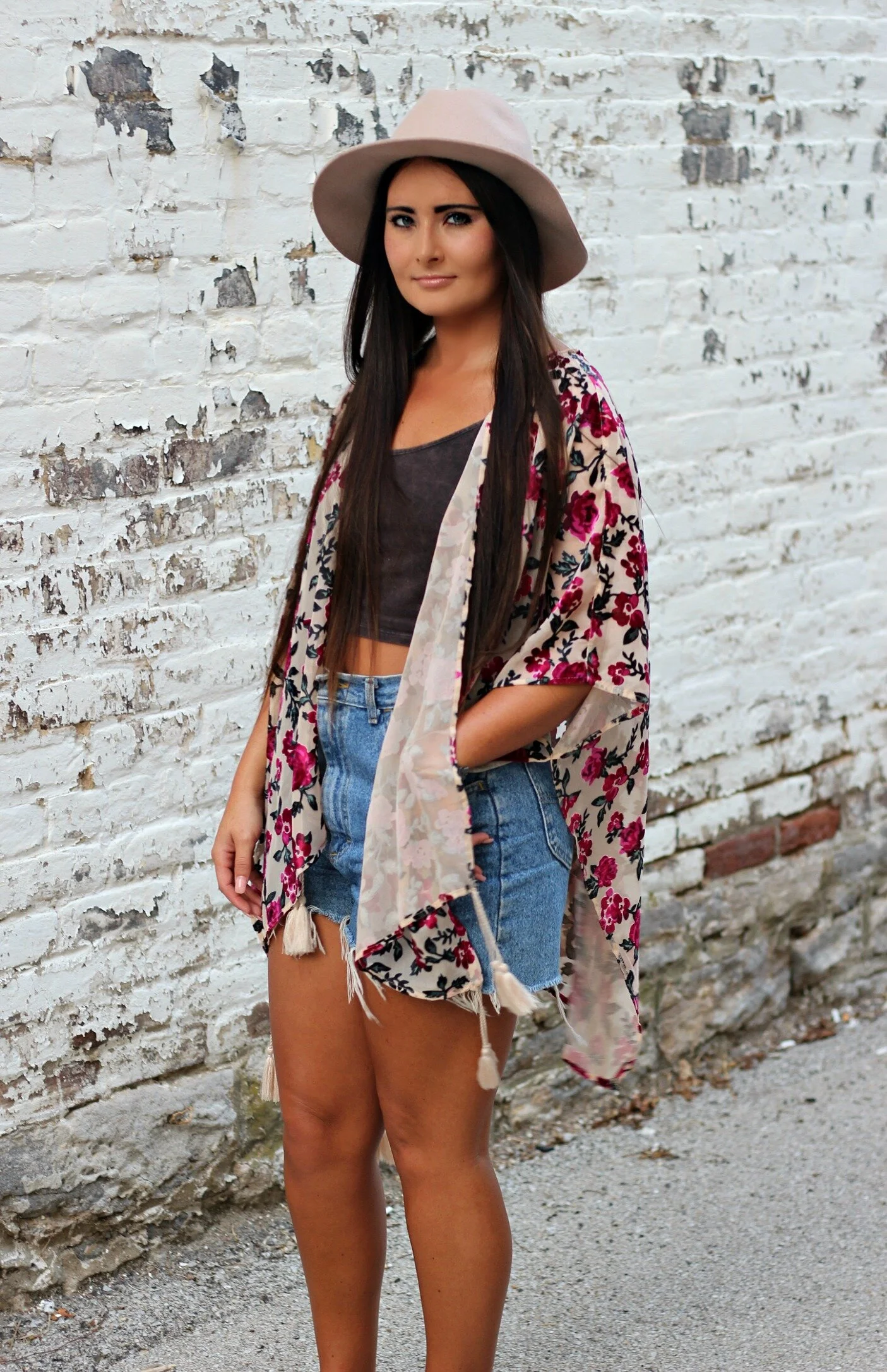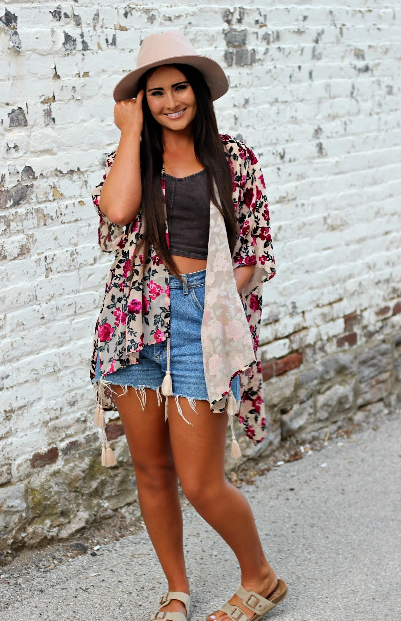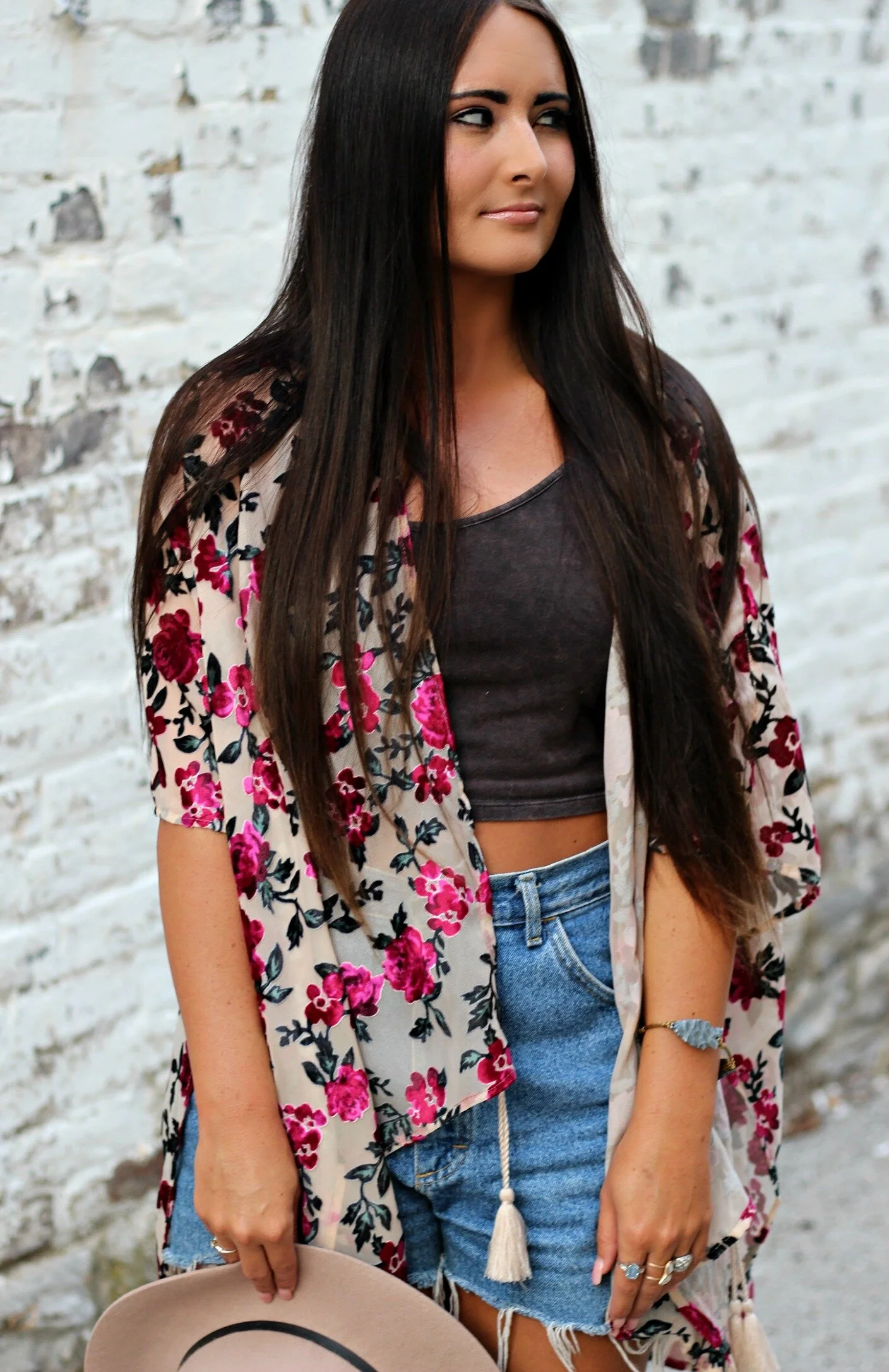 If there's one piece that can help your wardrobe effortlessly transition from summer into fall, it's the kimono. This piece is perfect for throwing on over a simple tank or crop top and cut-off shorts (like I'm wearing here) in late summer, but also looks great with jeans, slouchy sweaters, or knit dresses and boots come fall. It's an ideal layering piece that is light, flowy, and super flattering to all body types. I loved this one from TJMaxx because of the velvety material (so vintagey looking!), tassel details, and bold colors. I look forward to pairing this with cozy knits + fall neutrals in the coming months too. I've linked tons of similar floral velvety kimonos and more of my outfit details for you to shop above + below!