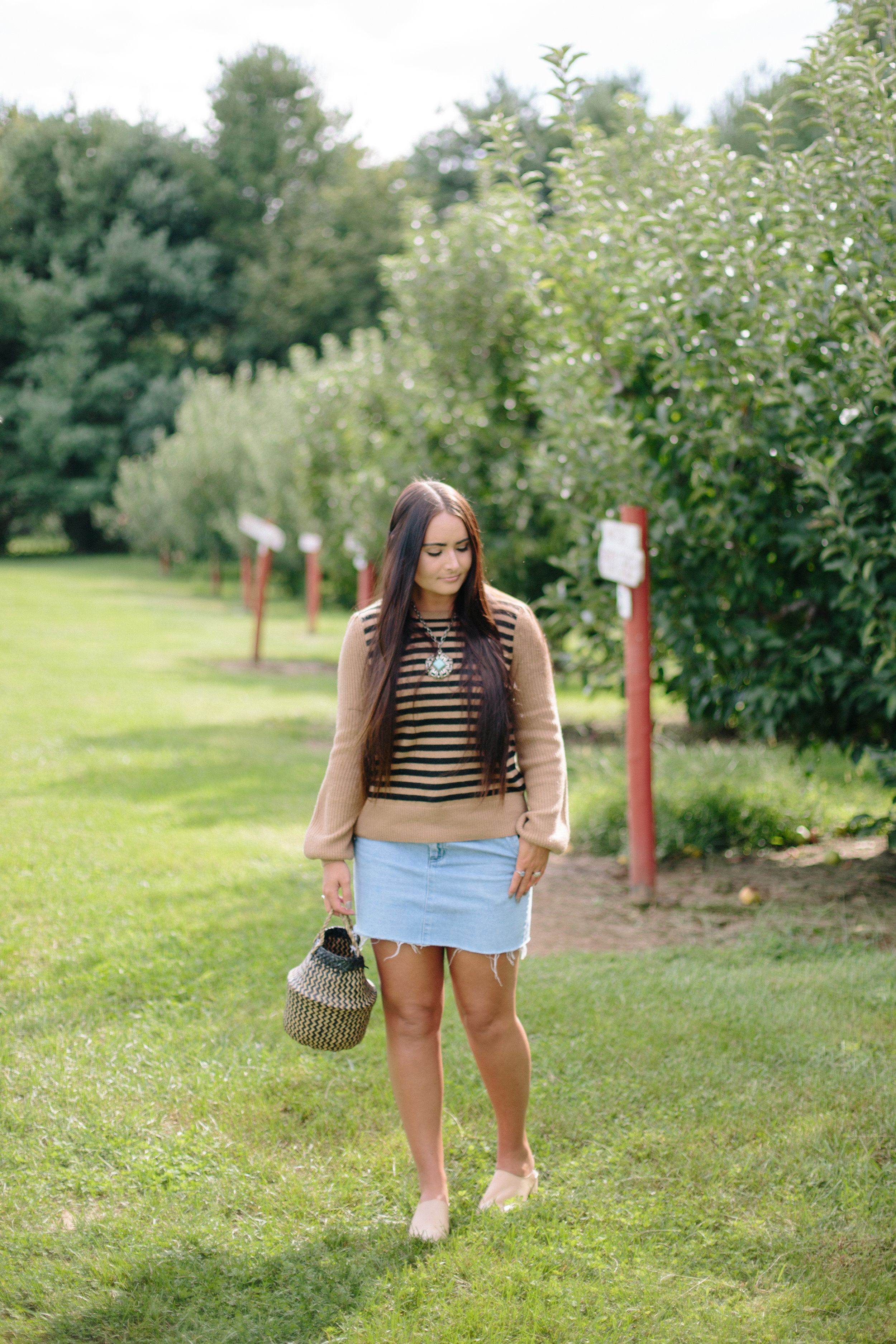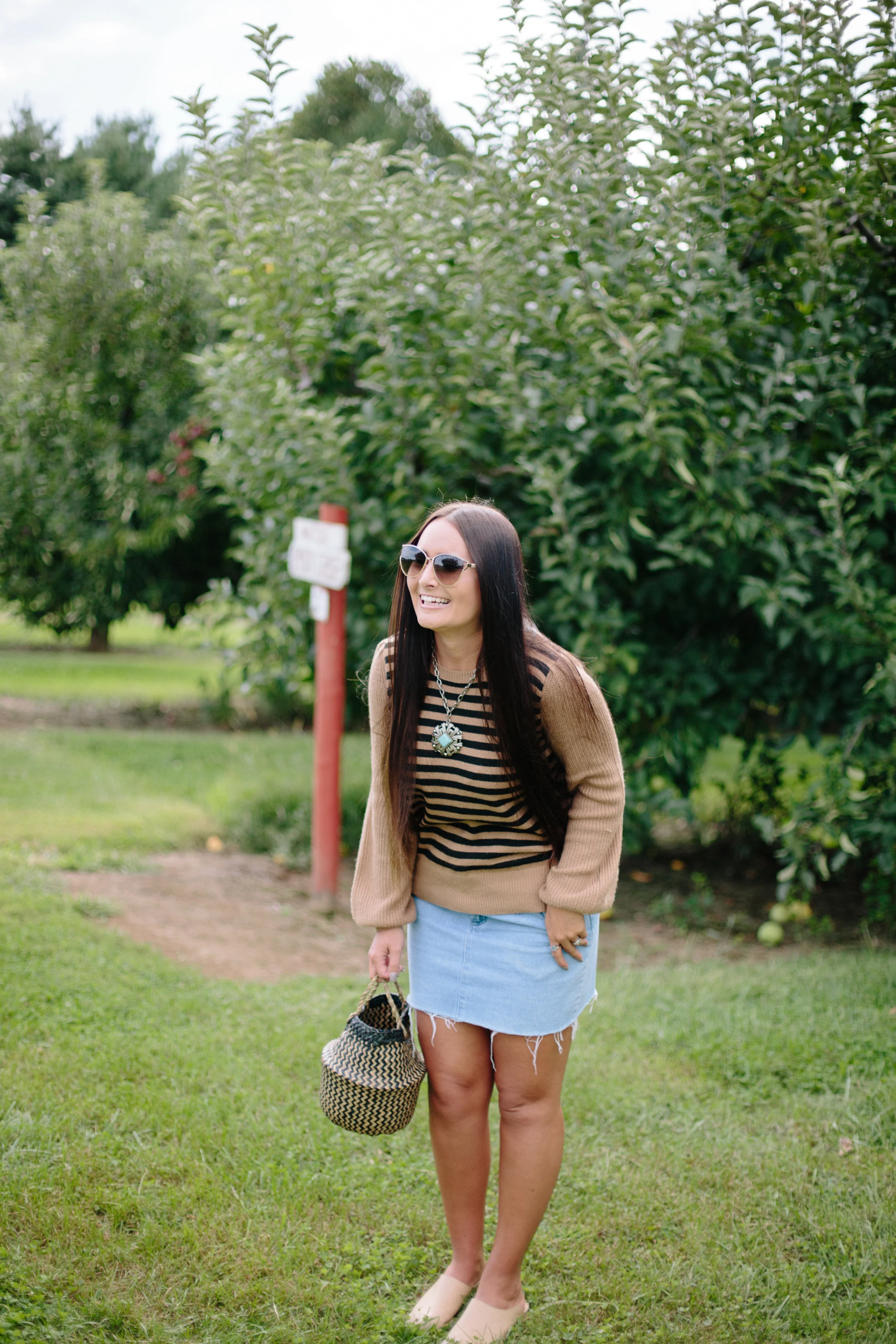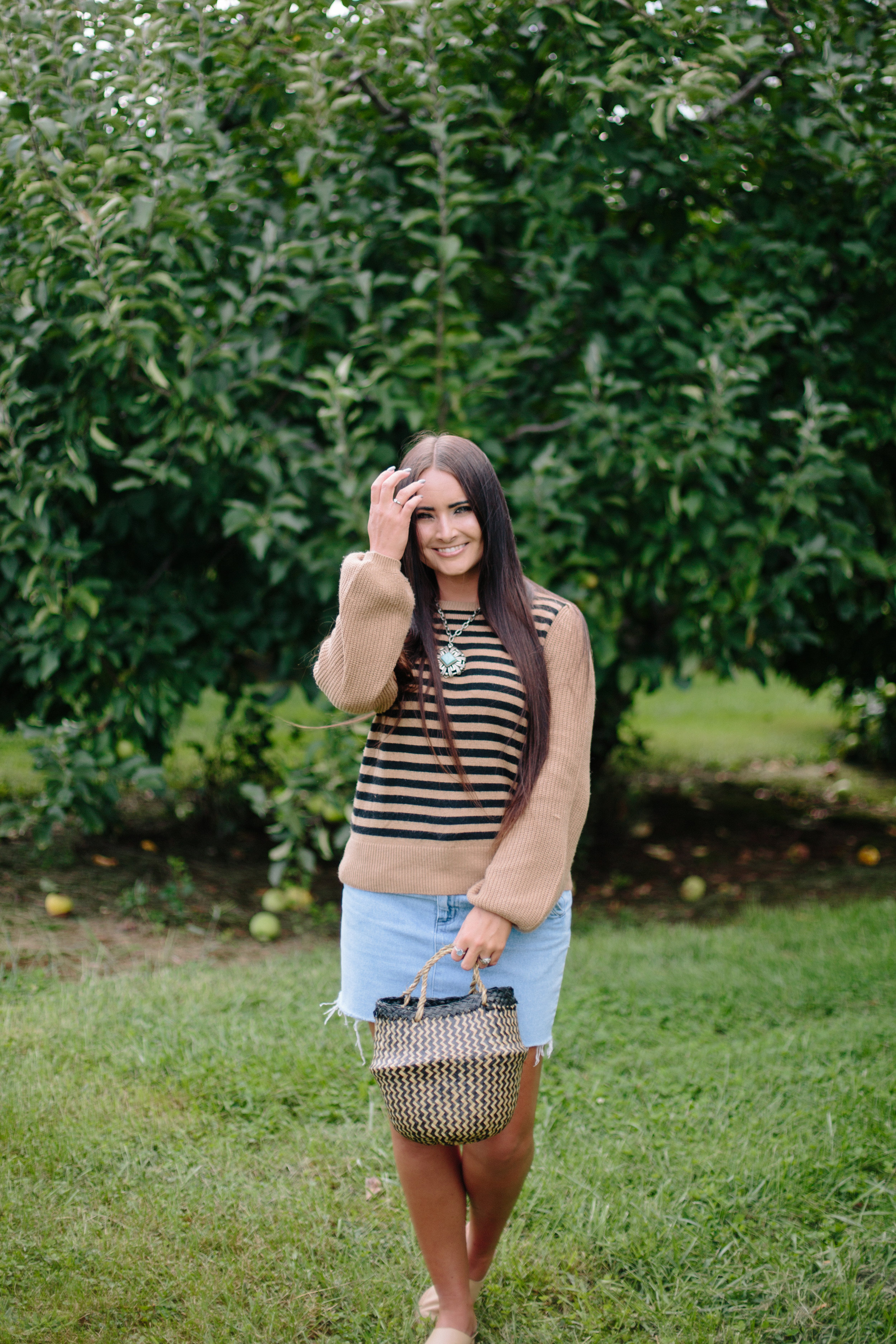 Last week I made my first (of many) trips to the local orchard to kick off September! The weather this past week could not have been more perfect in Kentucky and I was feeling all the autumn vibes. I was thrilled to be able to break out some sweaters a few days and this striped one is a new favorite! It's one of the newest pieces from the Who What Wear fall collection at Target and I'm obsessed with the unique silhouette and preppy style. It has flowy billowed sleeves a crewneck, and a chunky, cozy knit material. Perfect for dressing up or down (and totally perfect for work too!) and it's also under $30. I've linked this piece along with the rest of my outfit details for you to shop above + below!