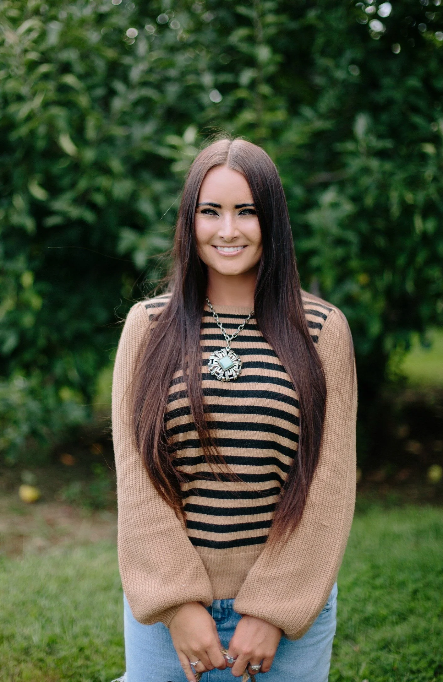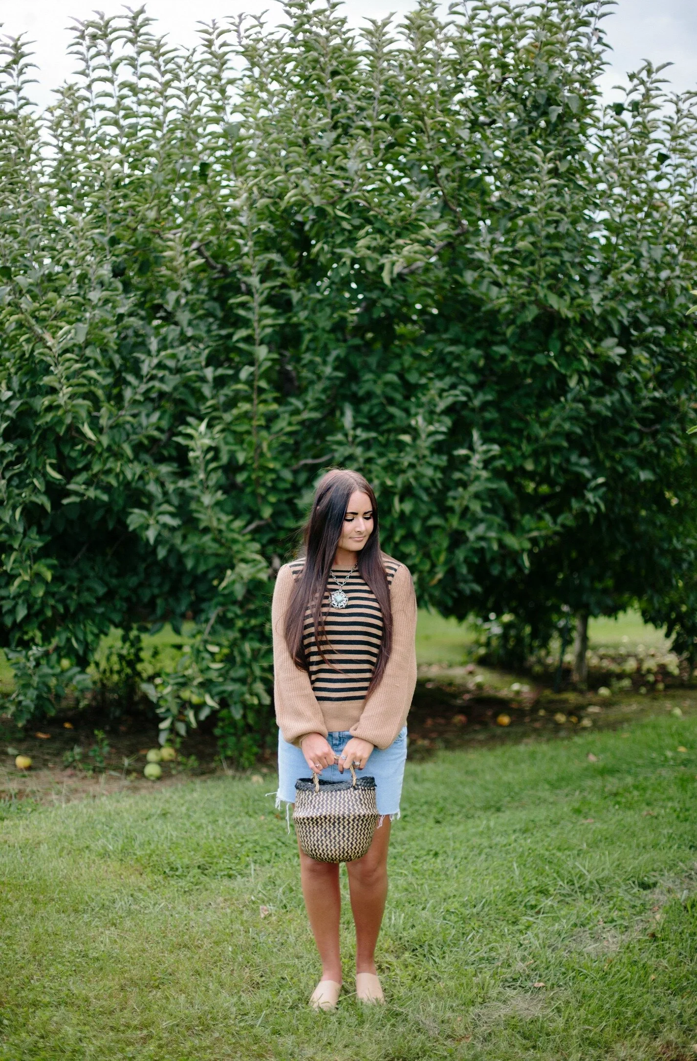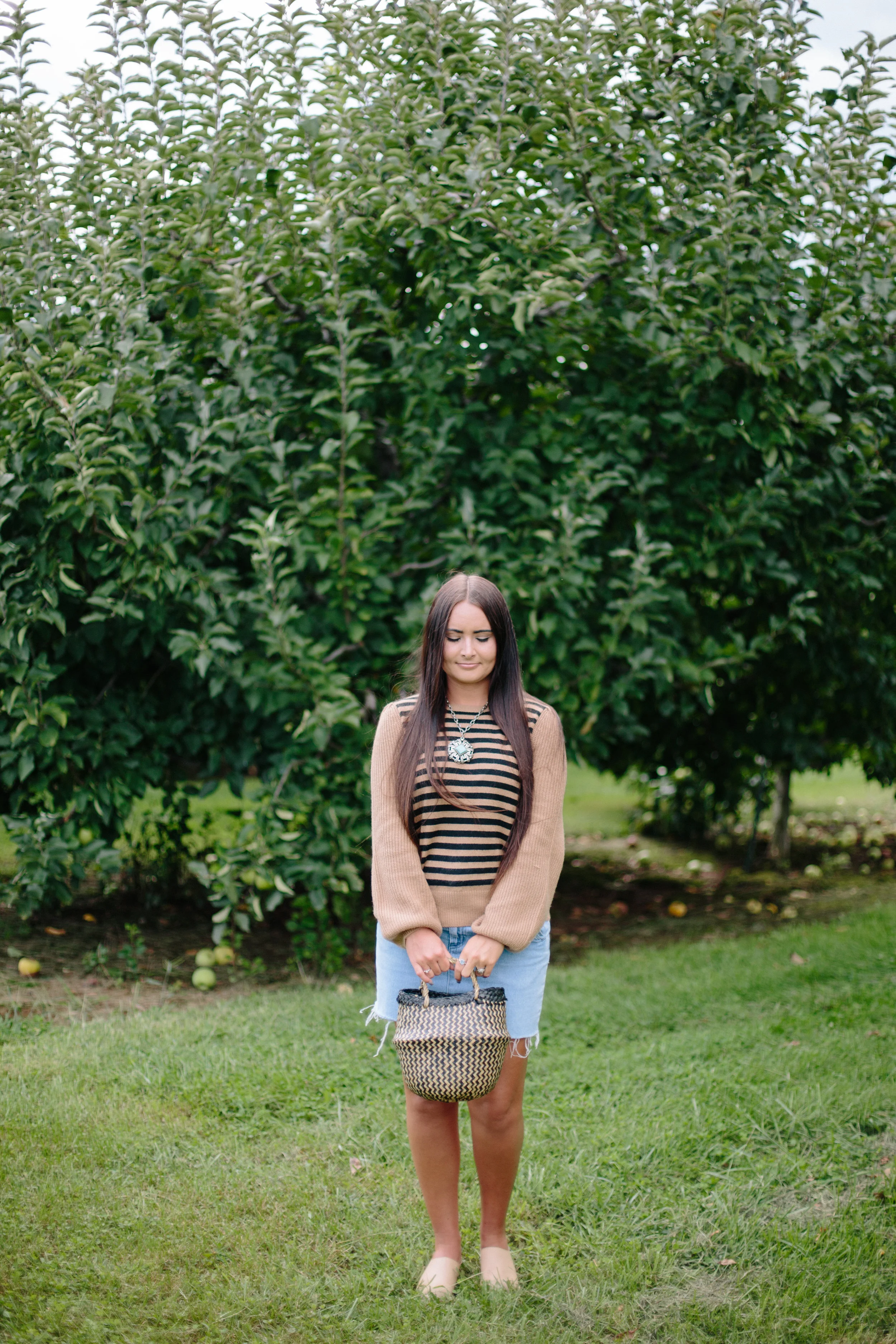 Last week I made my first (of many) trips to the local orchard to kick off September! The weather this past week could not have been more perfect in Kentucky and I was feeling all the autumn vibes. I was thrilled to be able to break out some sweaters a few days and this striped one is a new favorite! It's one of the newest pieces from the Who What Wear fall collection at Target and I'm obsessed with the unique silhouette and preppy style. It has flowy billowed sleeves a crewneck, and a chunky, cozy knit material. Perfect for dressing up or down (and totally perfect for work too!) and it's also under $30. I've linked this piece along with the rest of my outfit details for you to shop above + below!