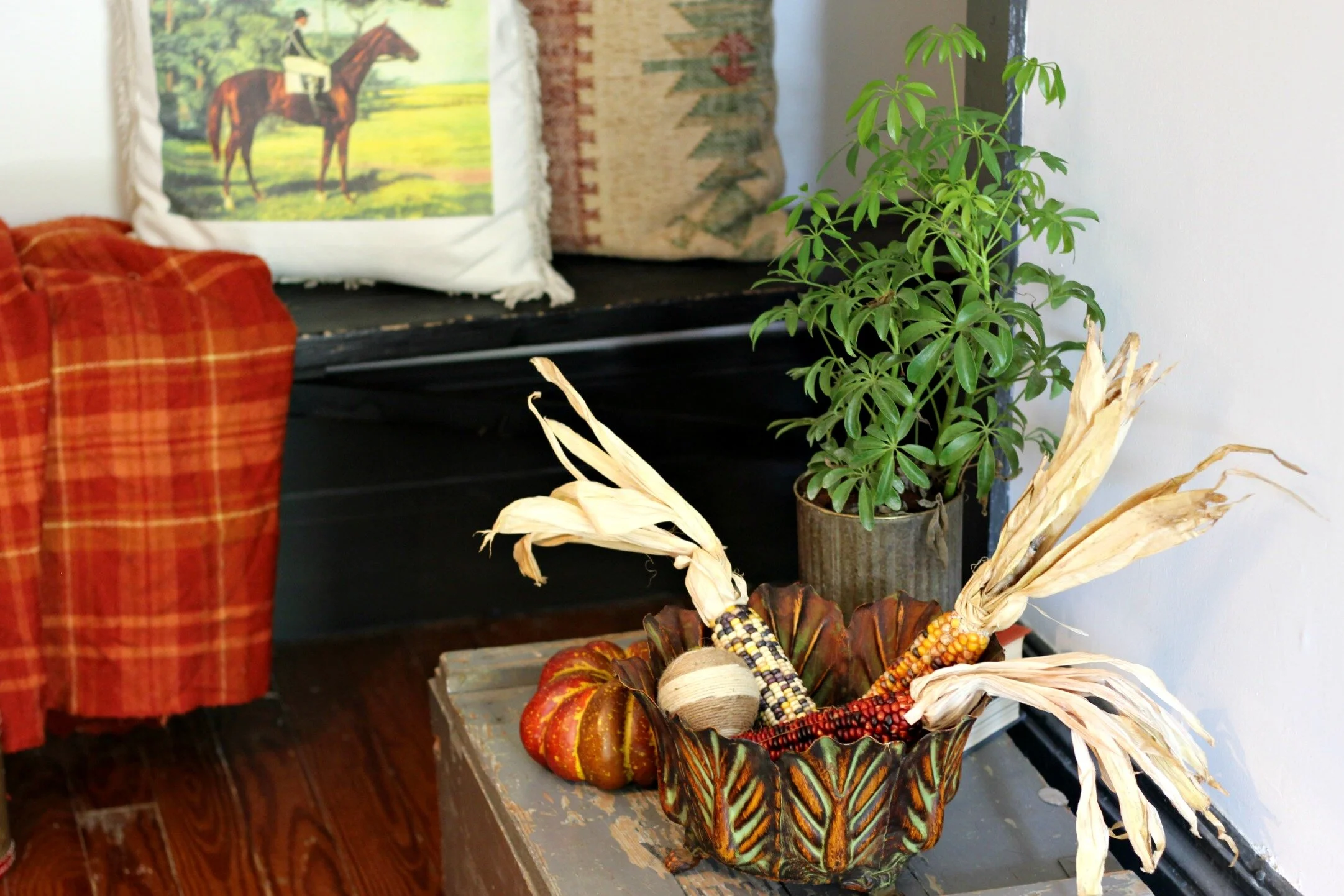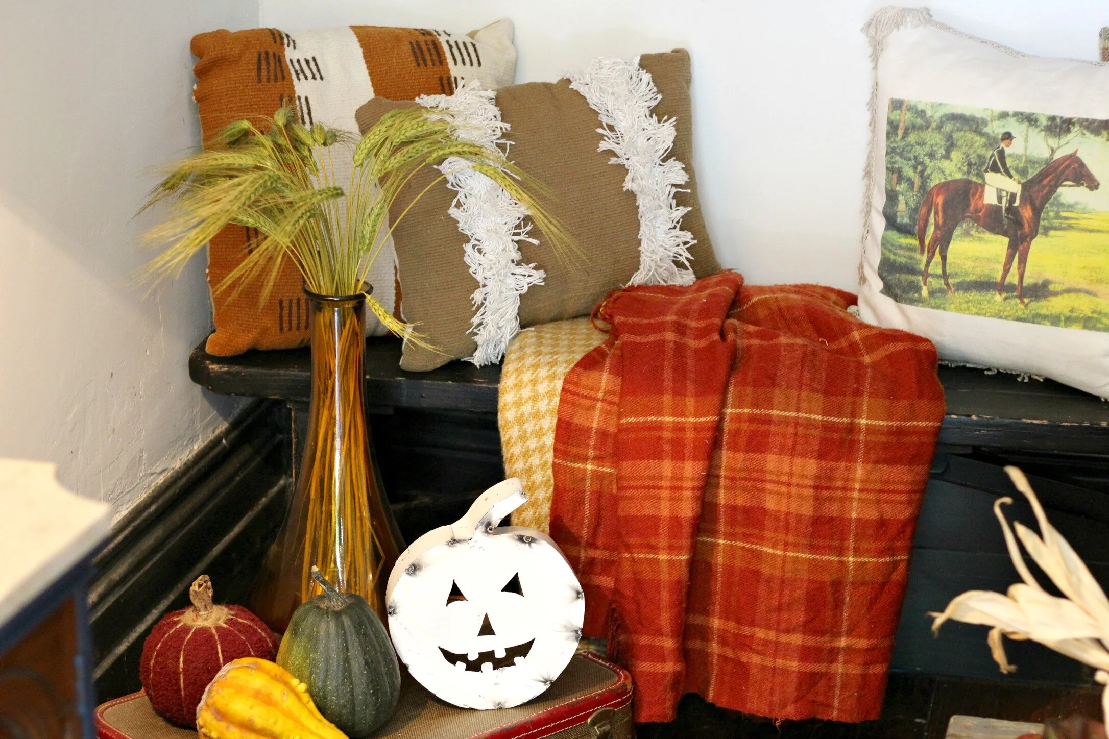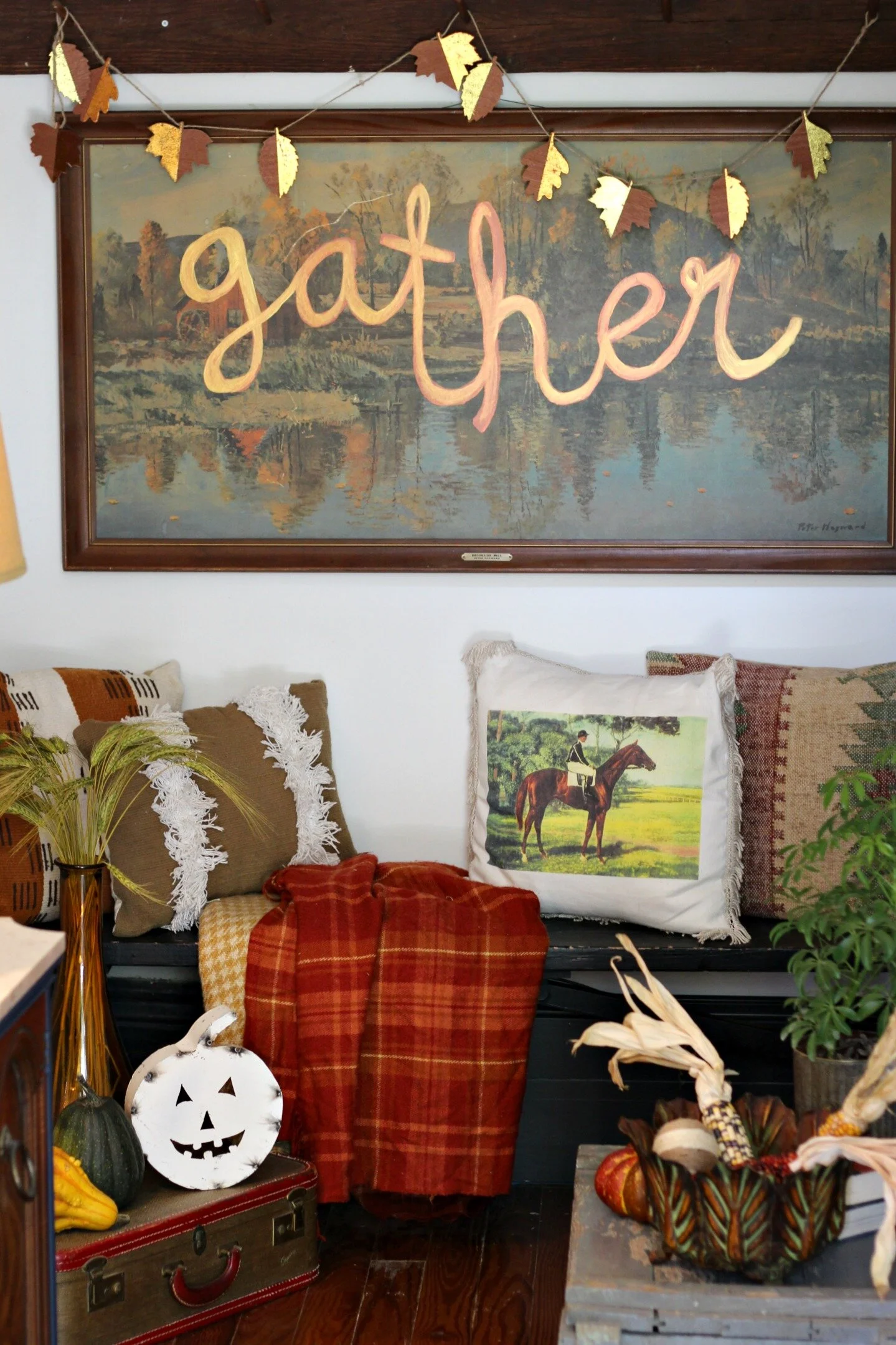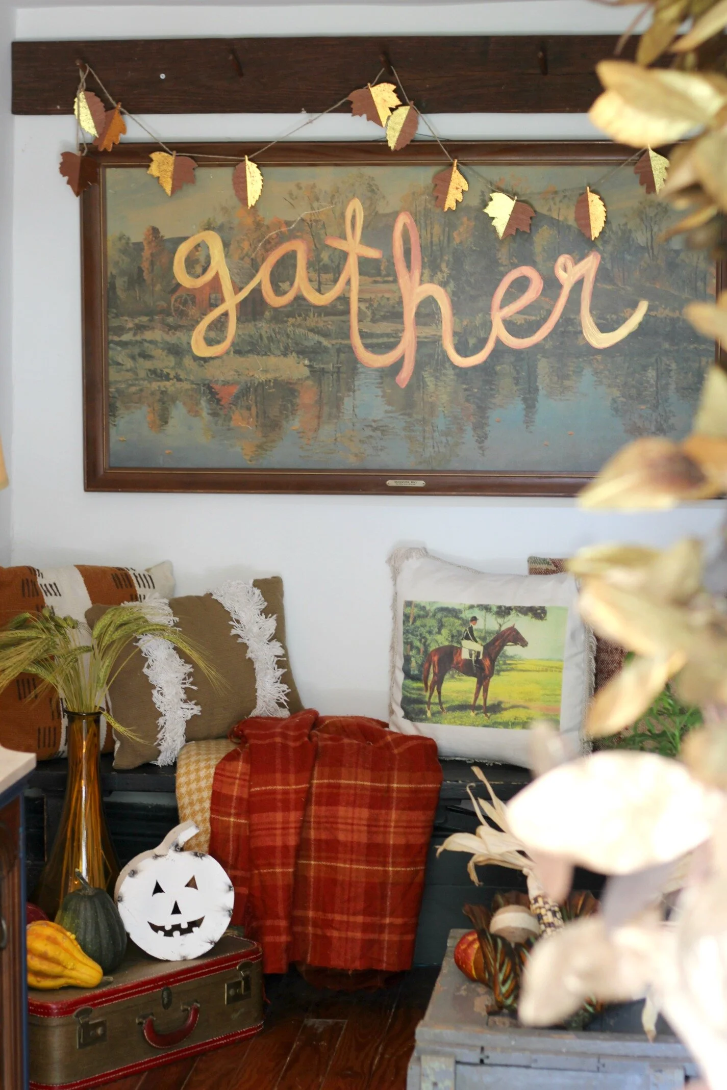 Leaf garland: Target (old) | Plaid blankets + horse pillow: thrifted | Fringe pillow: Target (old) | Suitcase: Thrifted | Amber vase: Marshall's | White metal jack-o-lantern: Sarah Smith Salvage