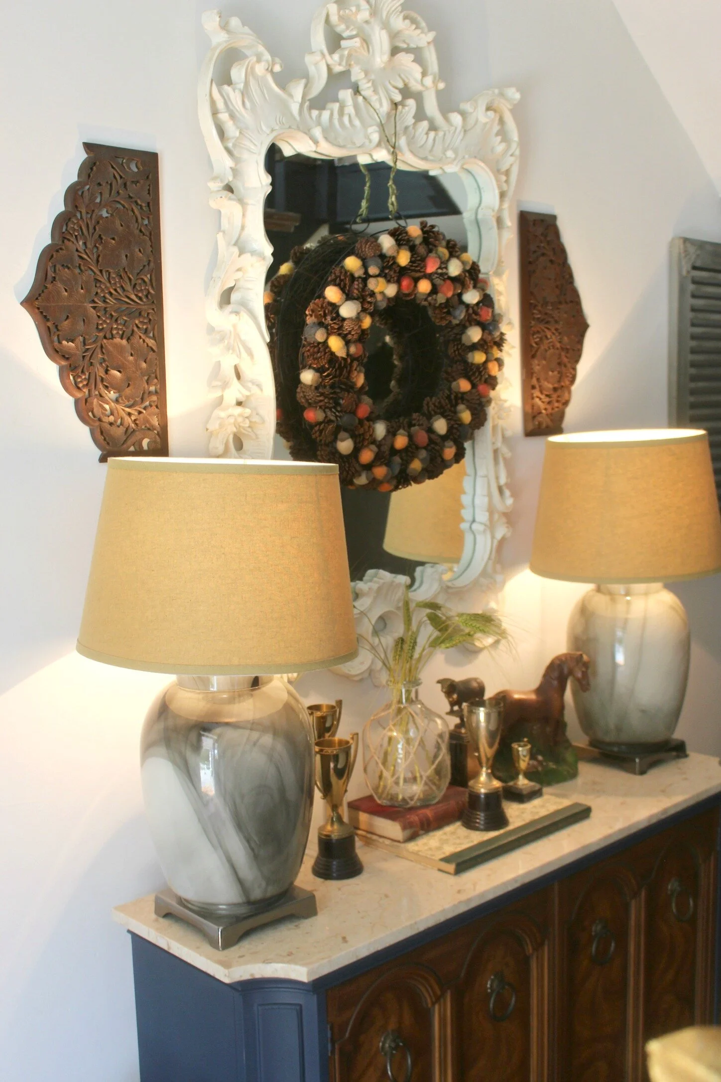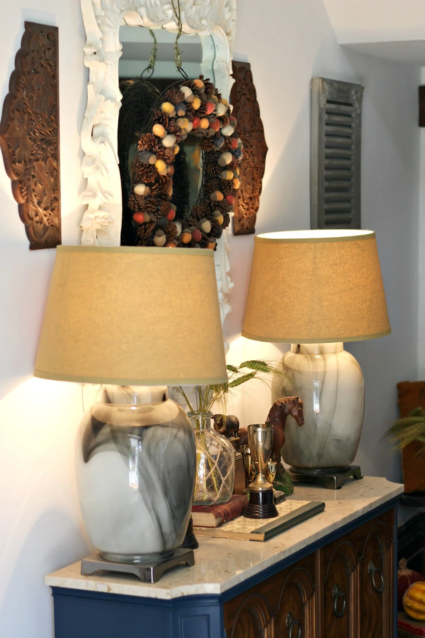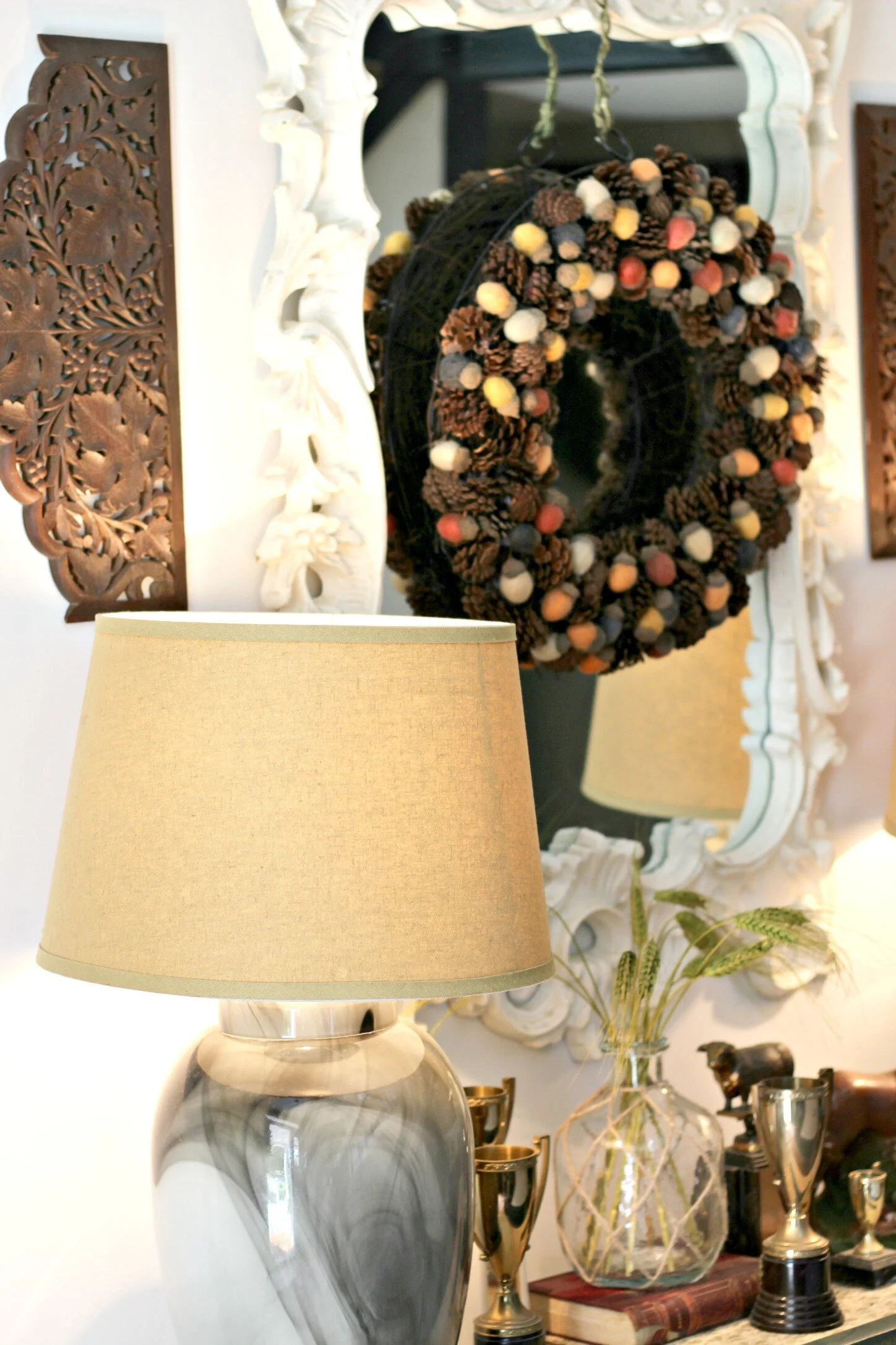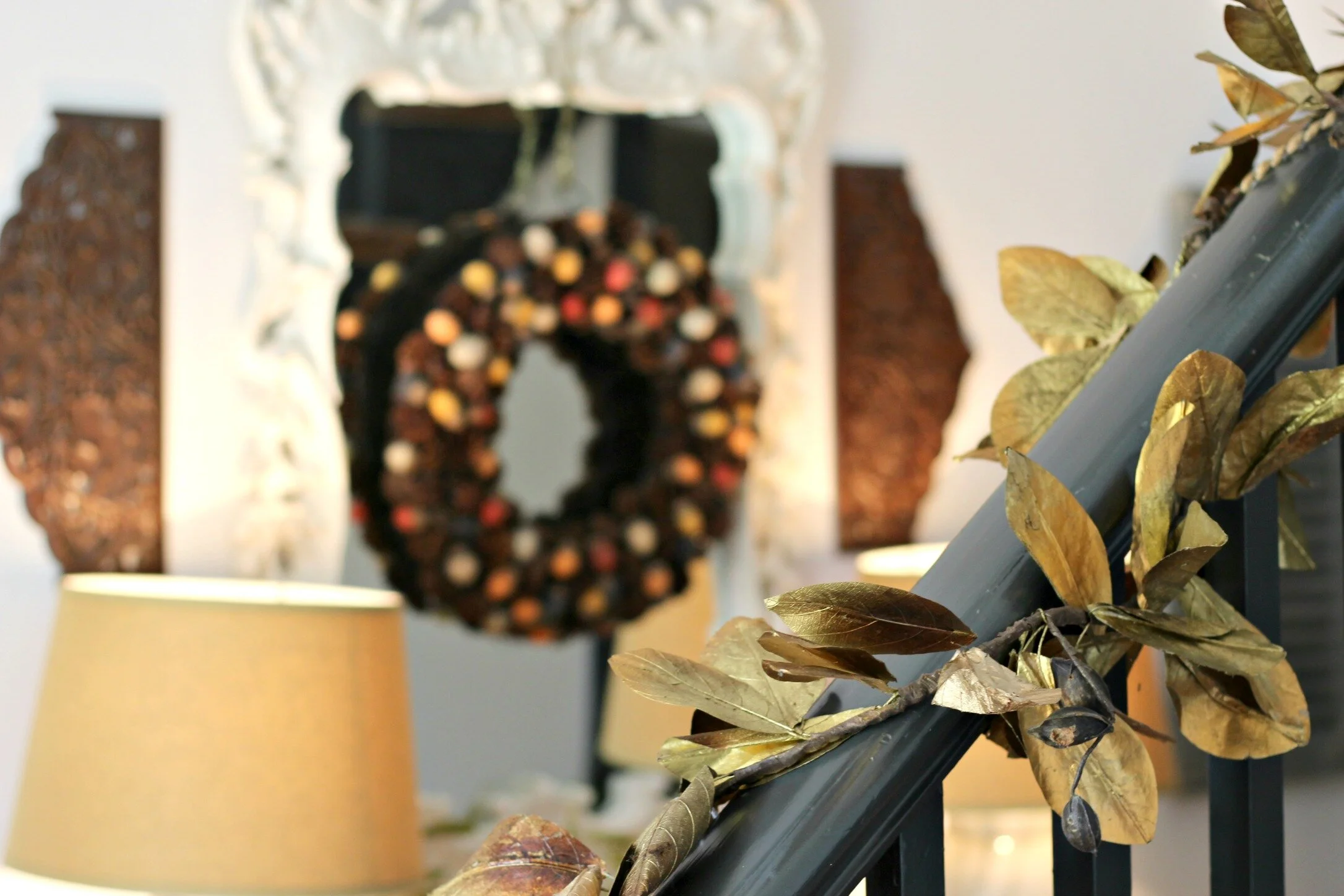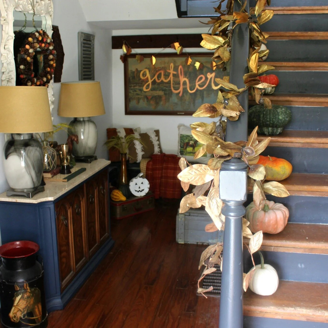 Gold magnolia garland: thrifted (similar here) | "Gather" fall painting: DIY here | Lamps: Peddlers Mall Stores | Multi-color acorn garland: Target (old)