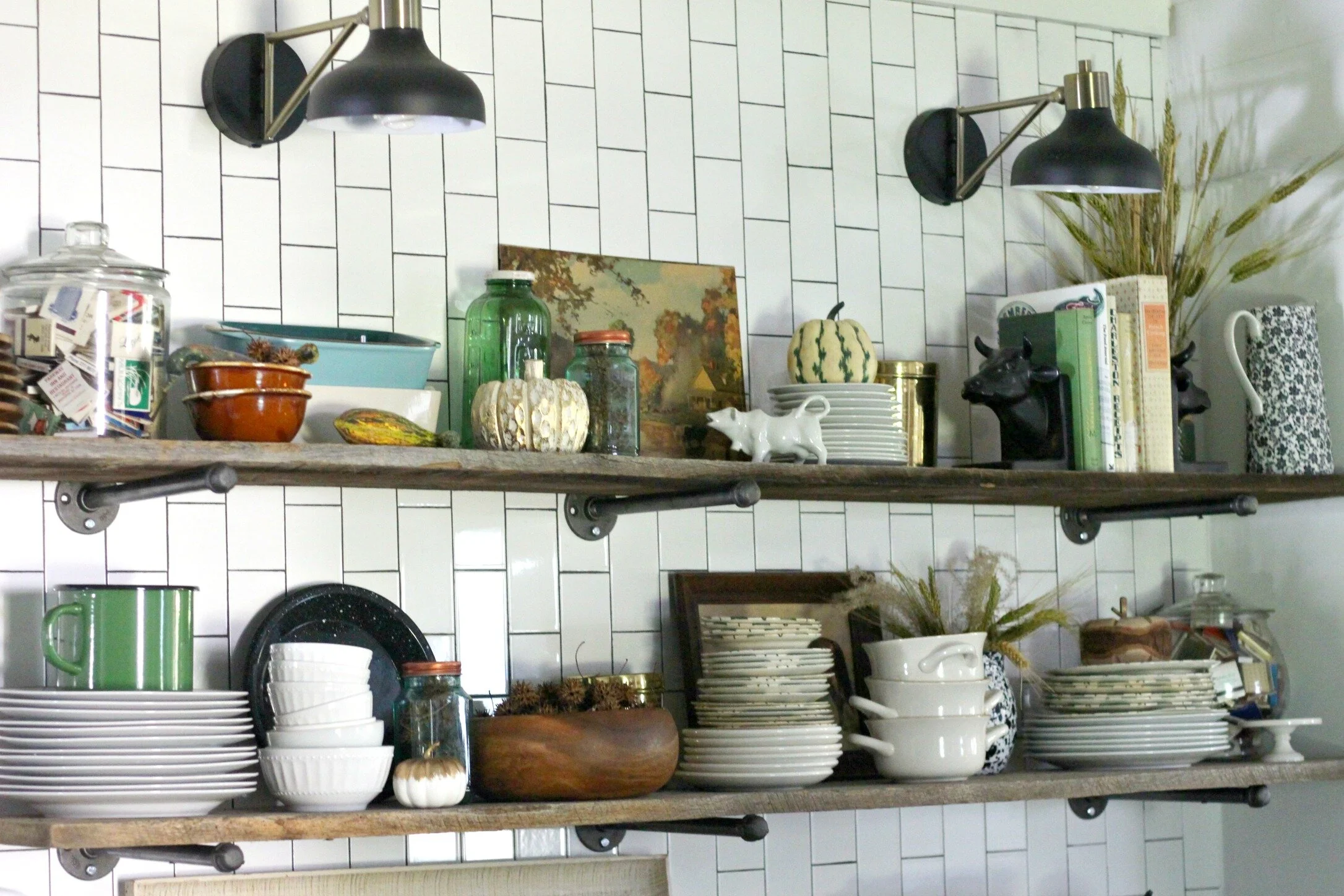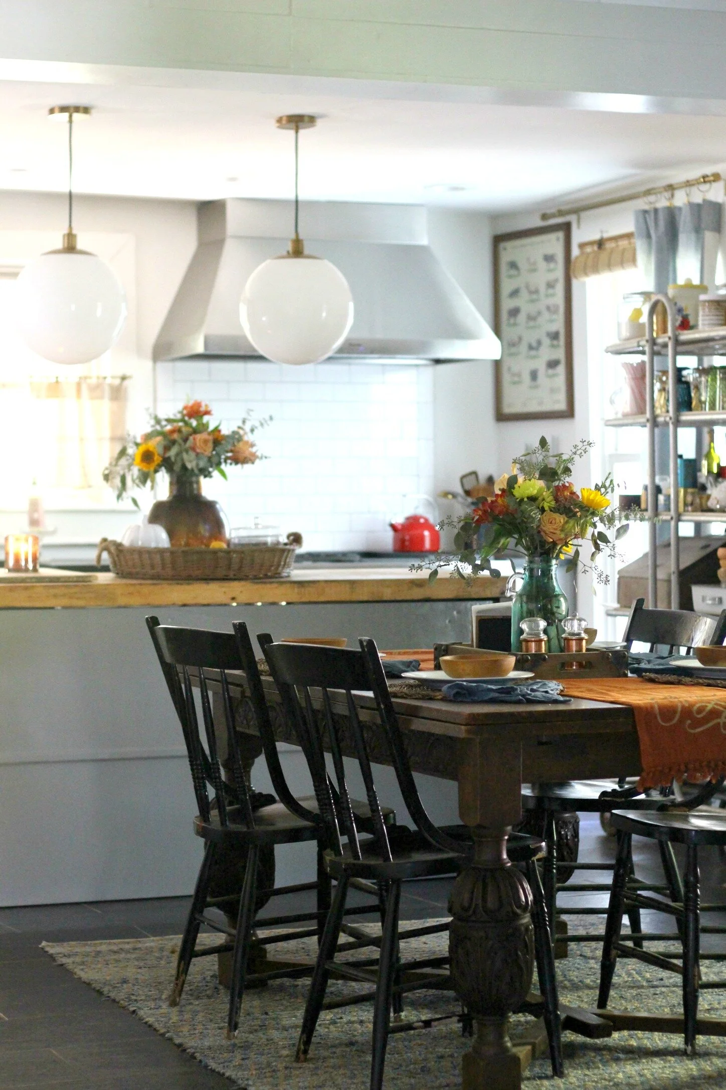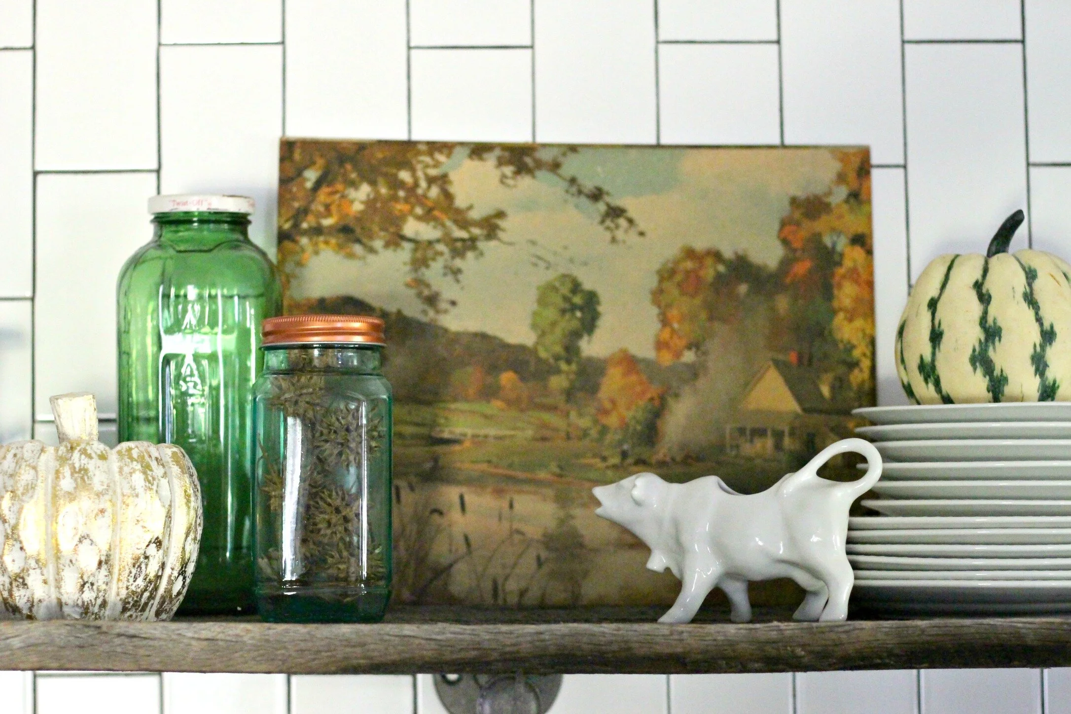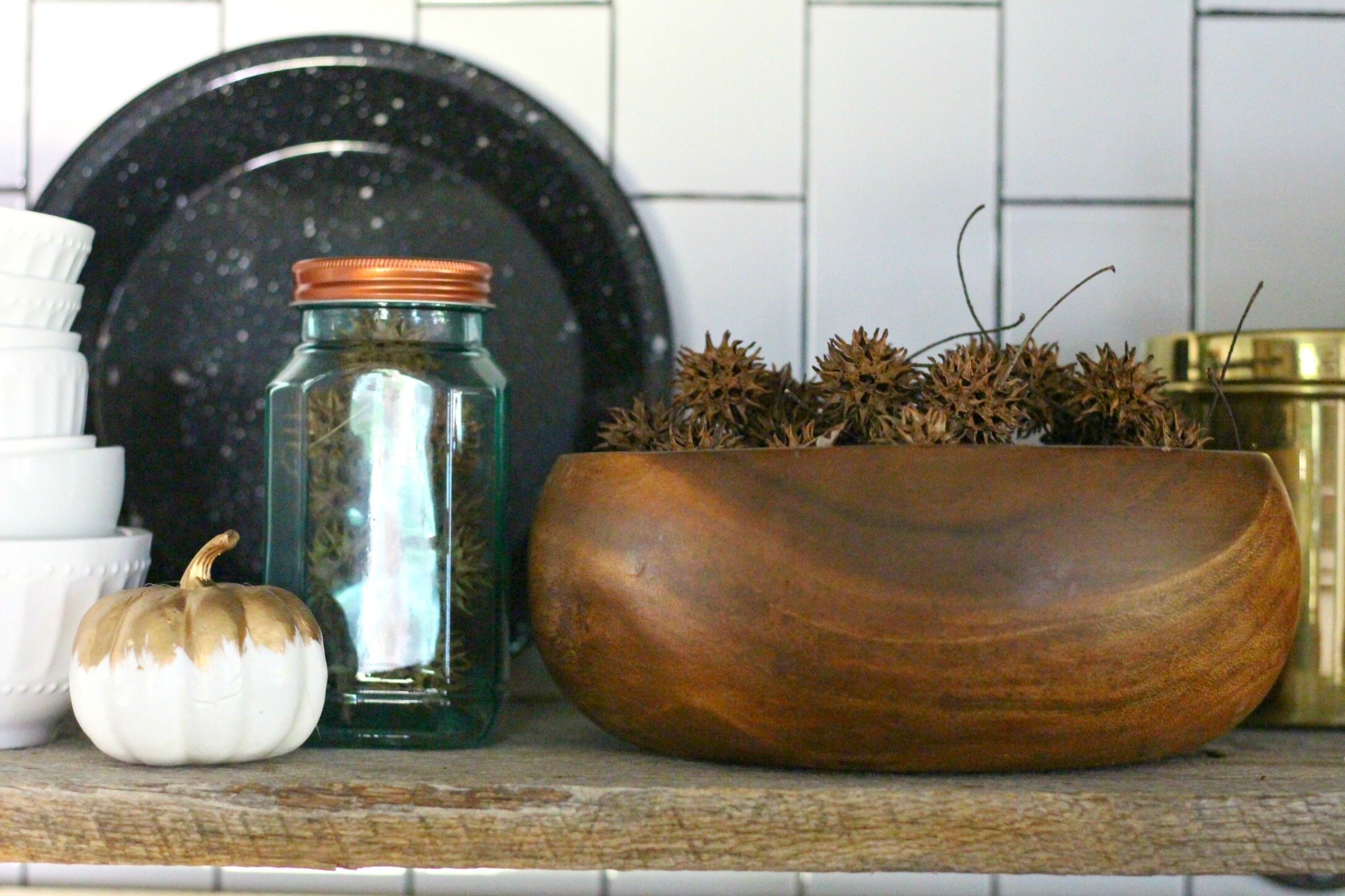 Happy fall y'all! I'm so excited to share some more of my fall decor and today I'll be showing you my kitchen. I always enjoy adding some fall touches to our open shelving wall in here and some garland and wreaths to our corner fireplace. I try to reserve all my brightest fall decor for this space, since I have a lot of vintage kitchenware that tends to come in bright, kitschy colors. Pops of turquoise, orange, and yellow are mixed with lots of black and white as well as brass and gold touches. I always like to have fresh flowers in the kitchen too and Trader Joe's always has the best fall flowers every year. Some of my other vases, pitchers, and jars throughout the room are filled with wheat or faux leaf stems. I love the simple and natural feel of those arrangements and how much warmth they add to the space. As always most all my decor is thrifted, or a mix of Homegoods and Target. You can find more details on all our kitchen fixtures and renovation here. I've also linked a lot of those items, as well as similar fall decor for you to shop below! If you have any questions about anything not mentioned- feel free to ask!