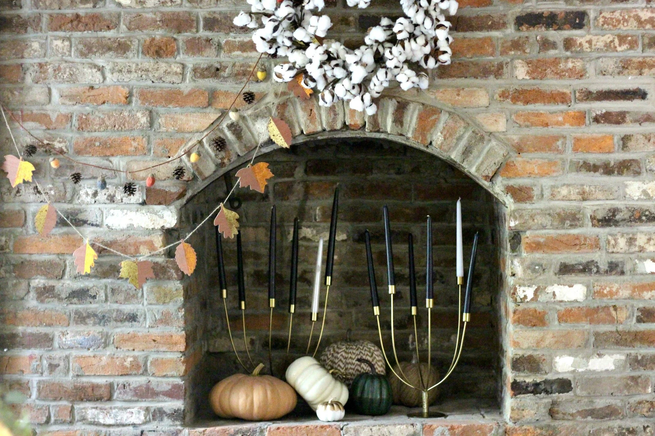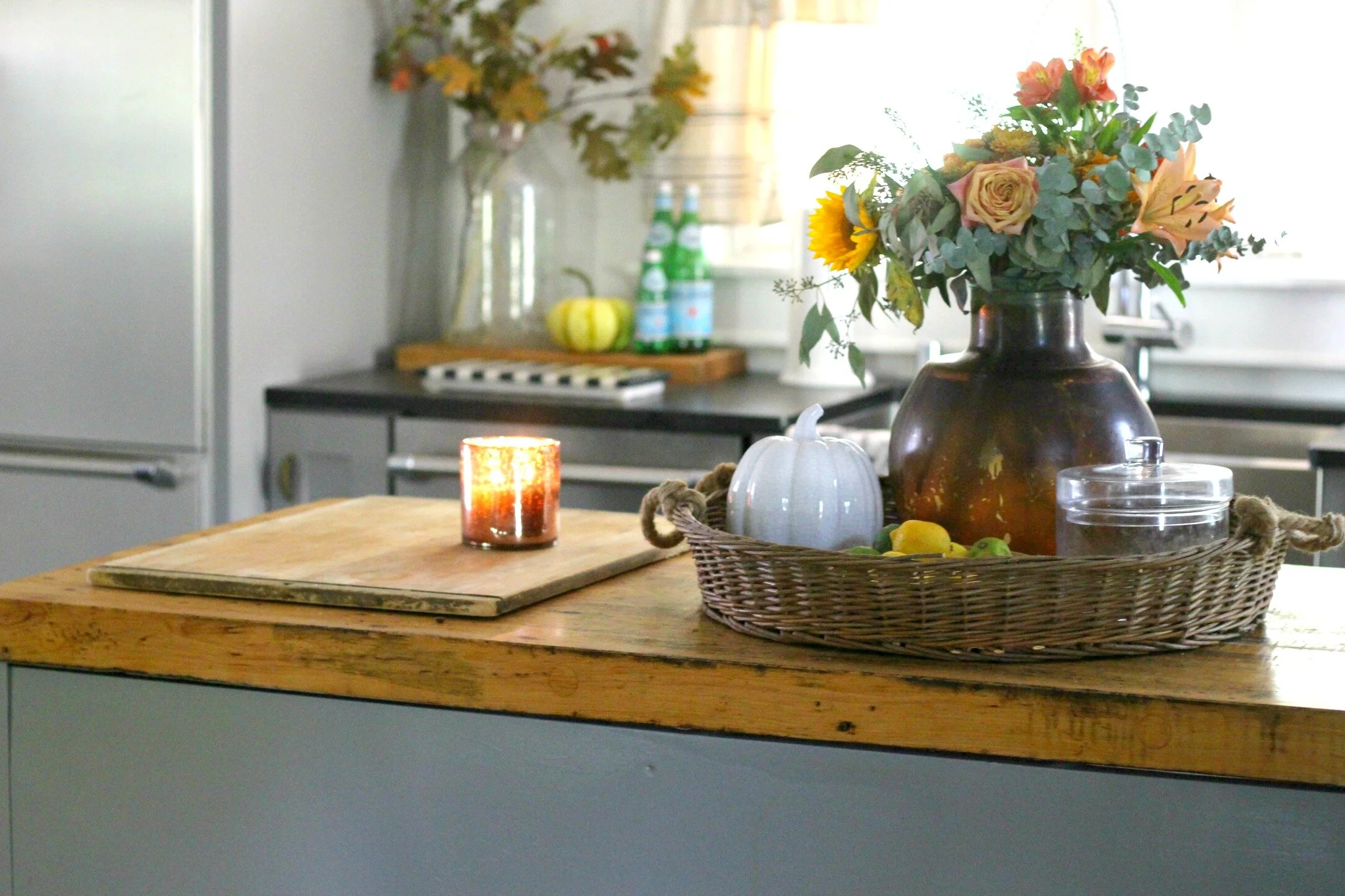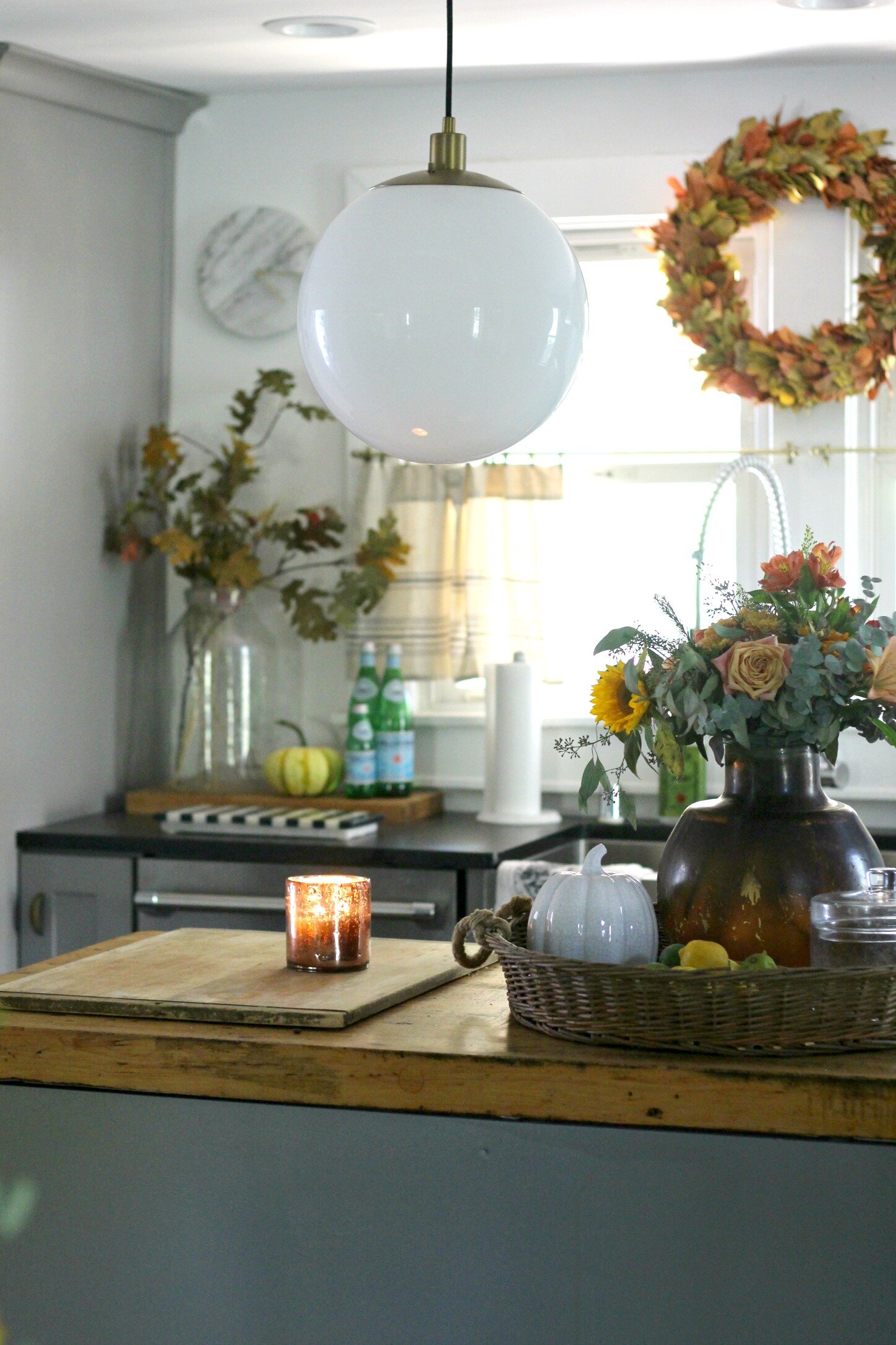 Happy fall y'all! I'm so excited to share some more of my fall decor and today I'll be showing you my kitchen. I always enjoy adding some fall touches to our open shelving wall in here and some garland and wreaths to our corner fireplace. I try to reserve all my brightest fall decor for this space, since I have a lot of vintage kitchenware that tends to come in bright, kitschy colors. Pops of turquoise, orange, and yellow are mixed with lots of black and white as well as brass and gold touches. I always like to have fresh flowers in the kitchen too and Trader Joe's always has the best fall flowers every year. Some of my other vases, pitchers, and jars throughout the room are filled with wheat or faux leaf stems. I love the simple and natural feel of those arrangements and how much warmth they add to the space. As always most all my decor is thrifted, or a mix of Homegoods and Target. You can find more details on all our kitchen fixtures and renovation here. I've also linked a lot of those items, as well as similar fall decor for you to shop below! If you have any questions about anything not mentioned- feel free to ask!
