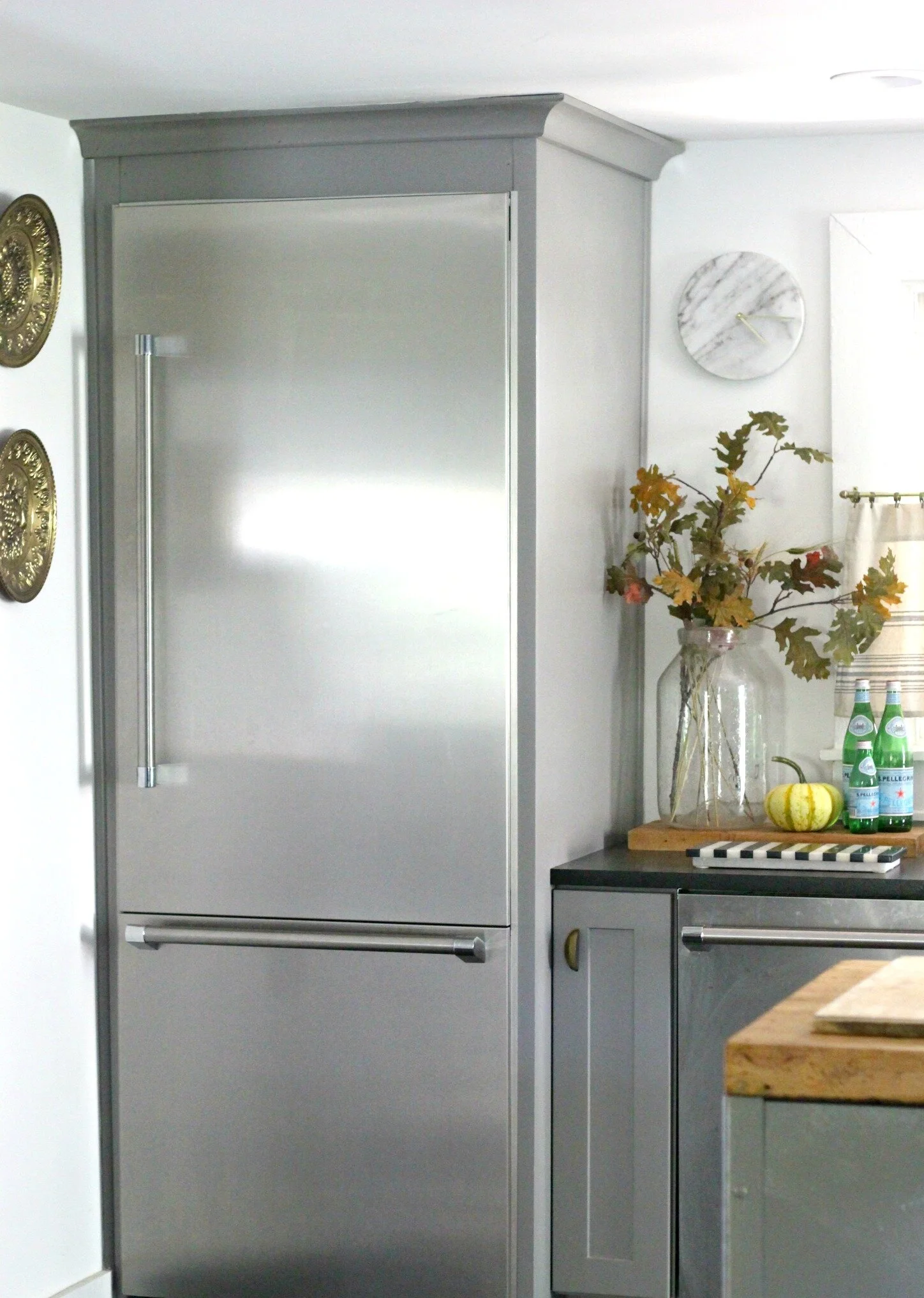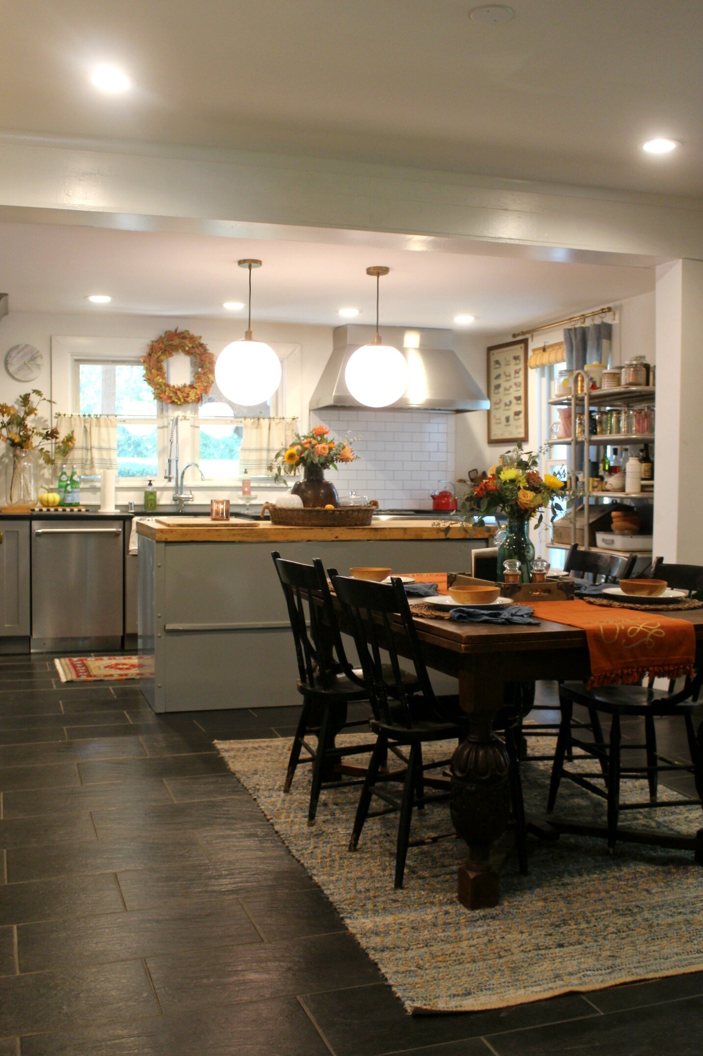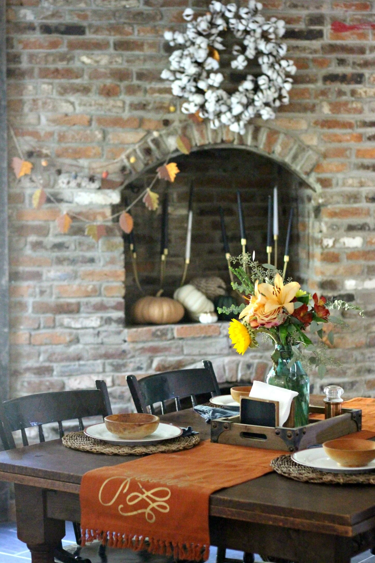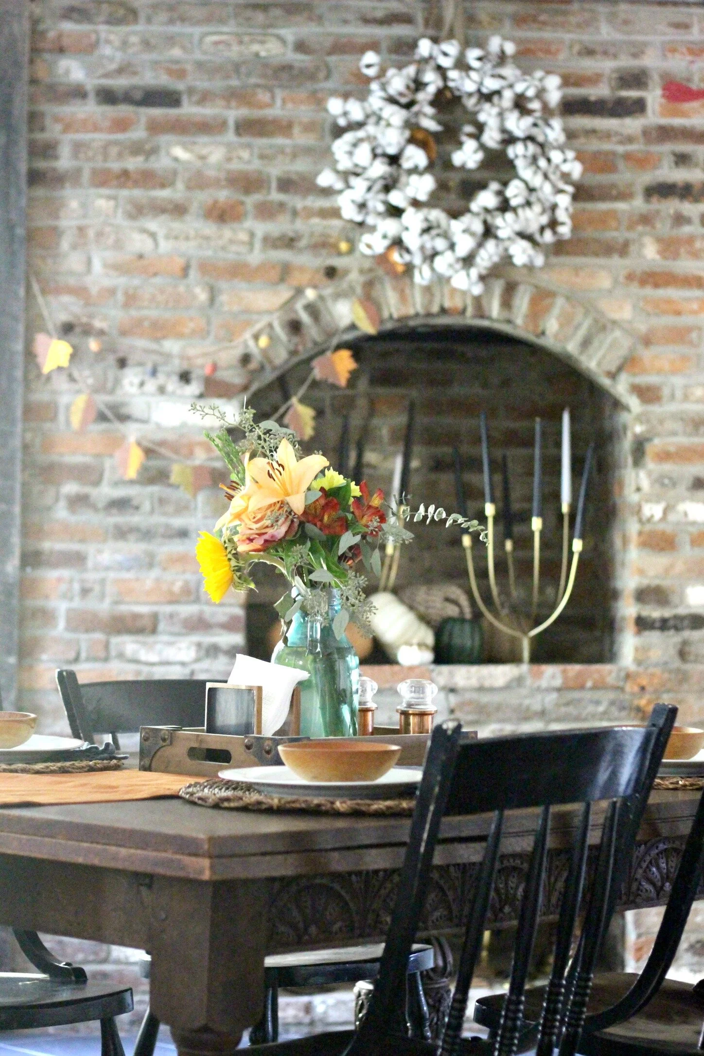 Happy fall y'all! I'm so excited to share some more of my fall decor and today I'll be showing you my kitchen. I always enjoy adding some fall touches to our open shelving wall in here and some garland and wreaths to our corner fireplace. I try to reserve all my brightest fall decor for this space, since I have a lot of vintage kitchenware that tends to come in bright, kitschy colors. Pops of turquoise, orange, and yellow are mixed with lots of black and white as well as brass and gold touches. I always like to have fresh flowers in the kitchen too and Trader Joe's always has the best fall flowers every year. Some of my other vases, pitchers, and jars throughout the room are filled with wheat or faux leaf stems. I love the simple and natural feel of those arrangements and how much warmth they add to the space. As always most all my decor is thrifted, or a mix of Homegoods and Target. You can find more details on all our kitchen fixtures and renovation here. I've also linked a lot of those items, as well as similar fall decor for you to shop below! If you have any questions about anything not mentioned- feel free to ask!