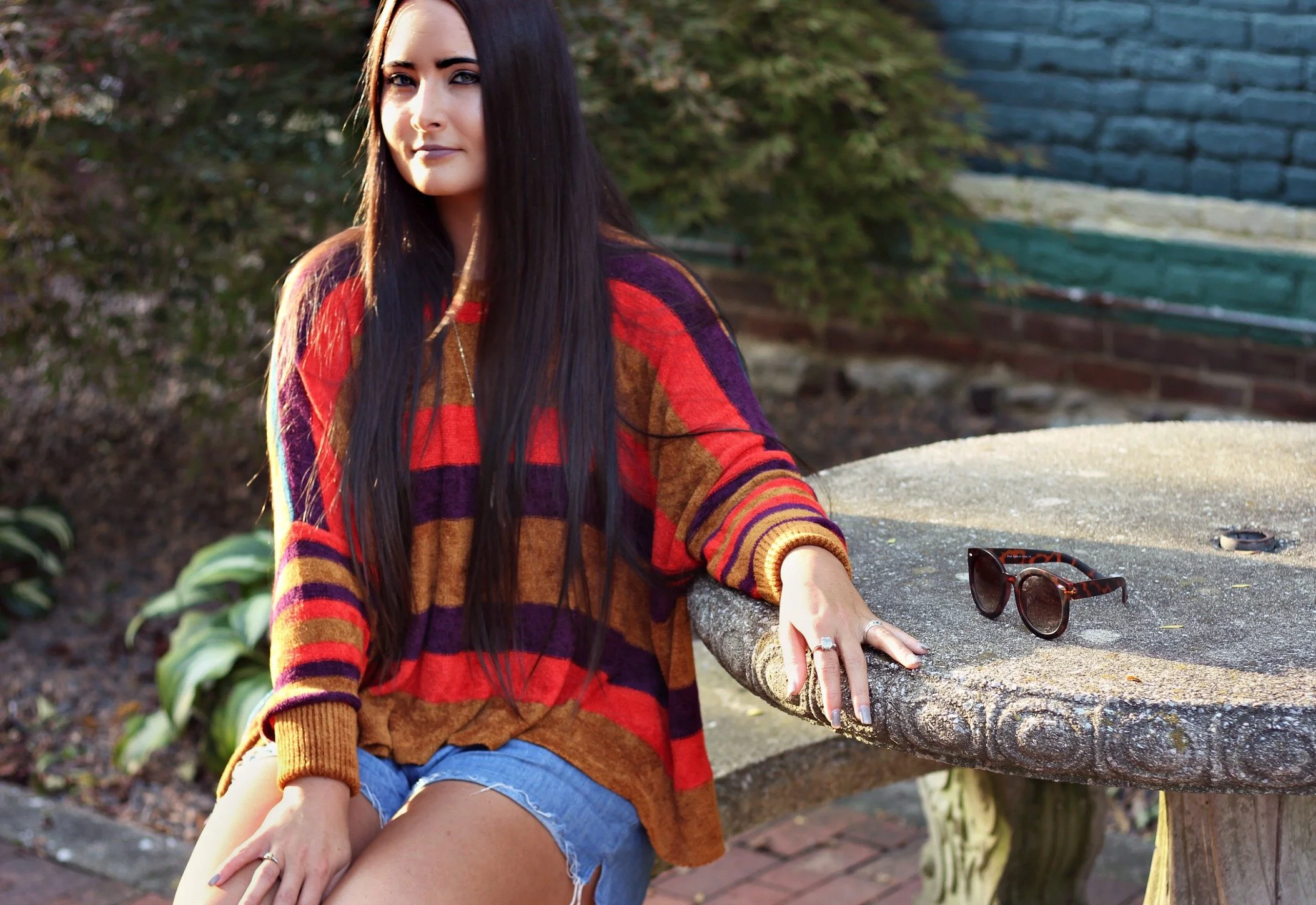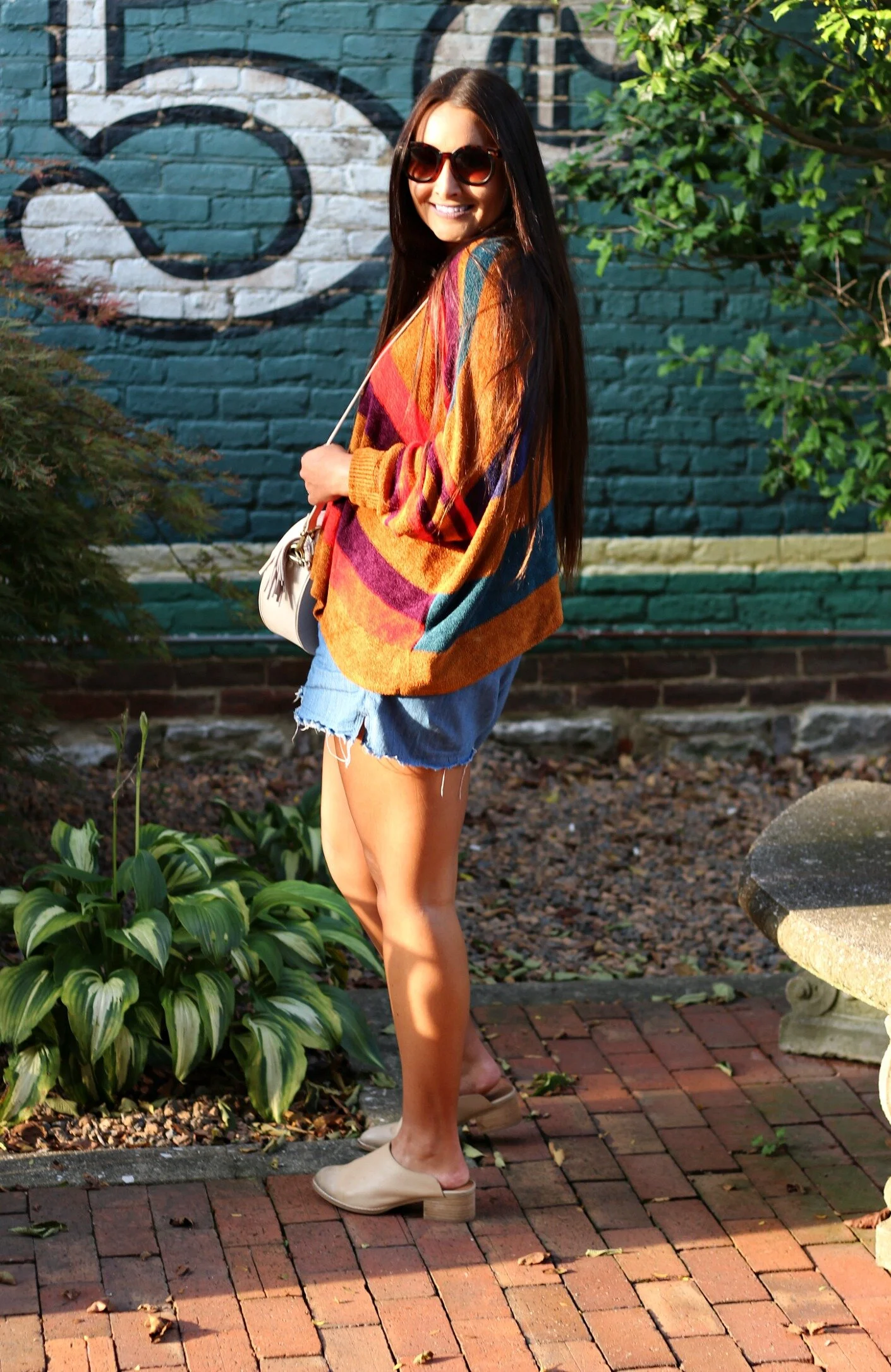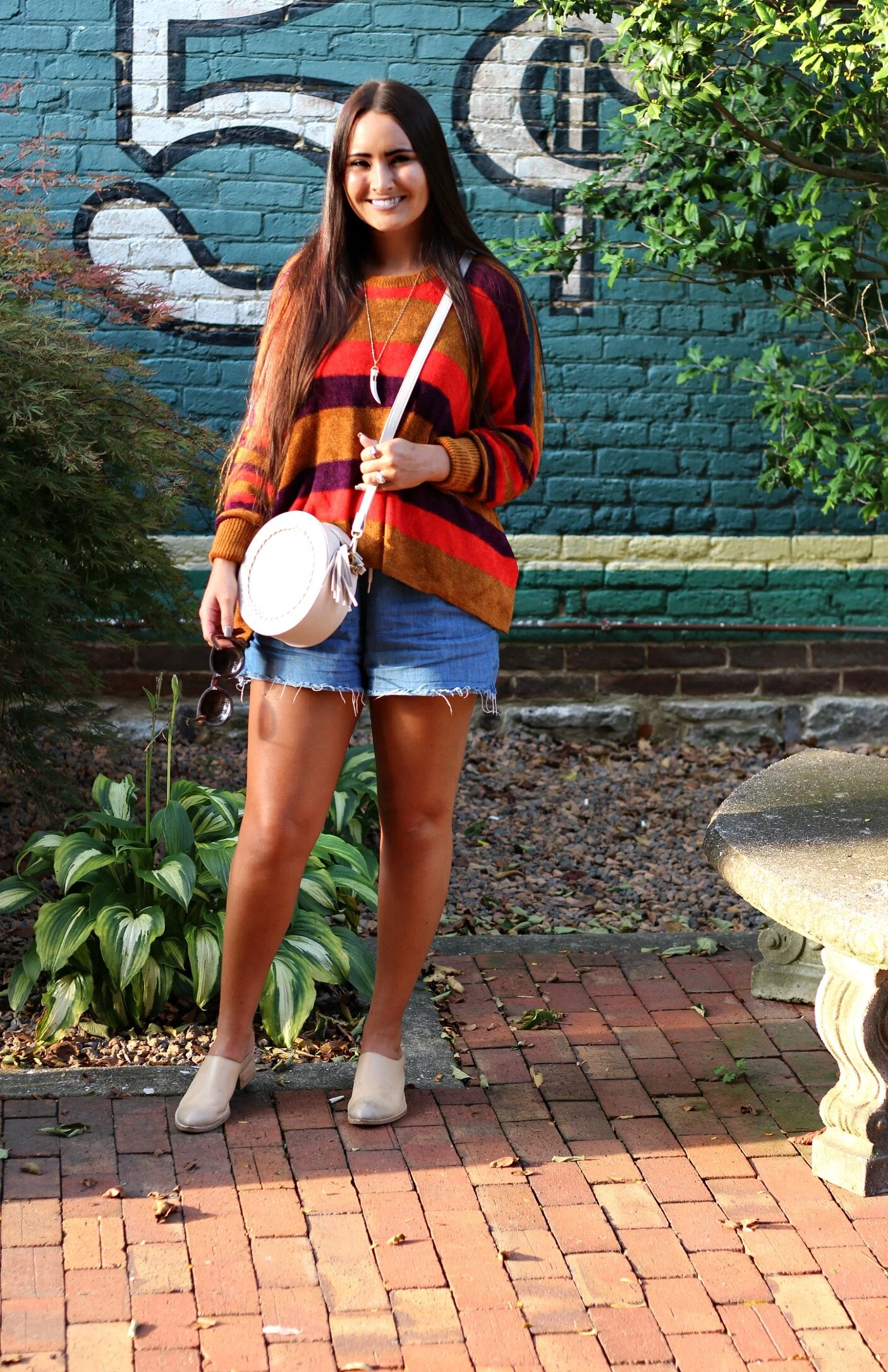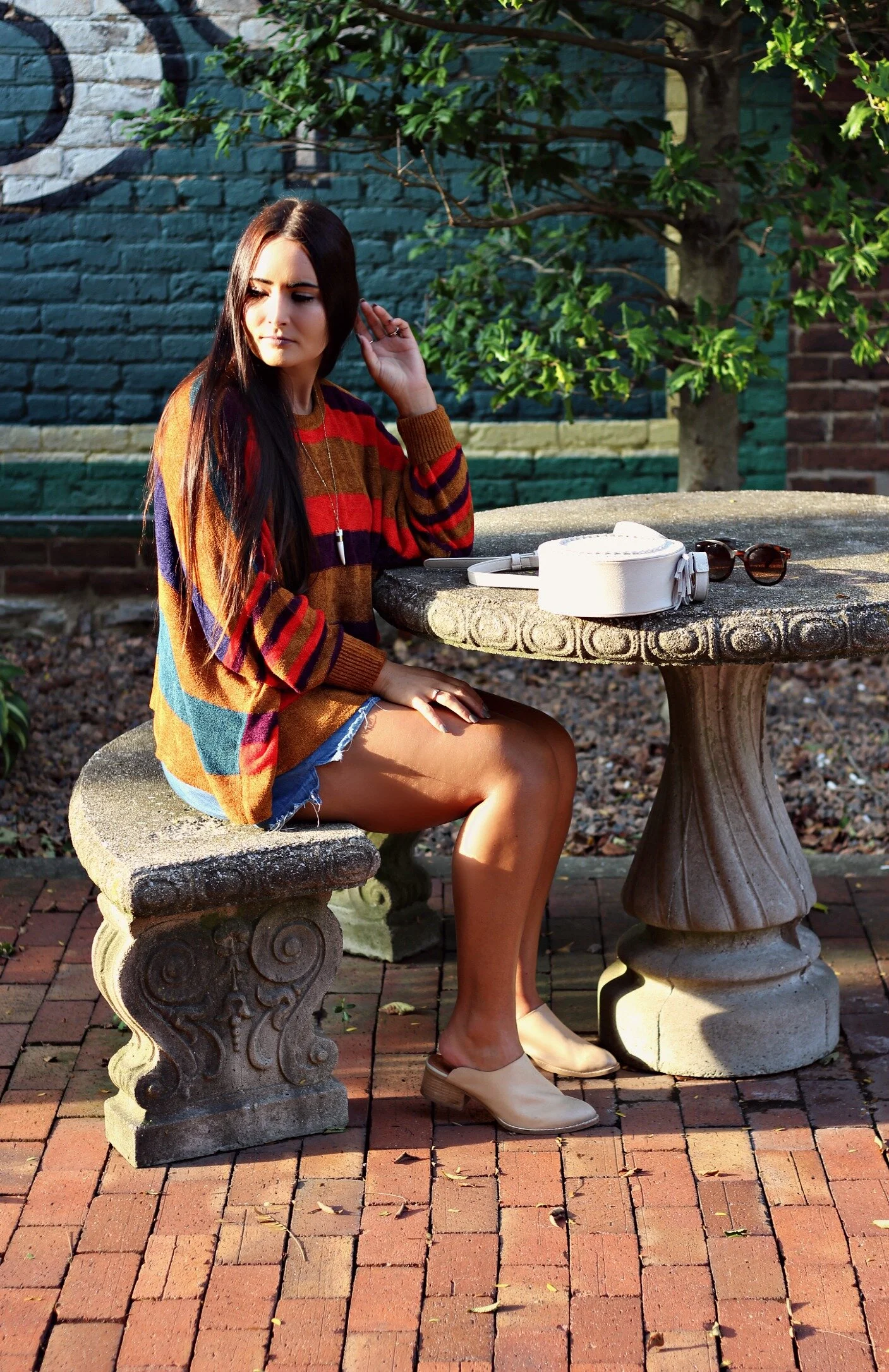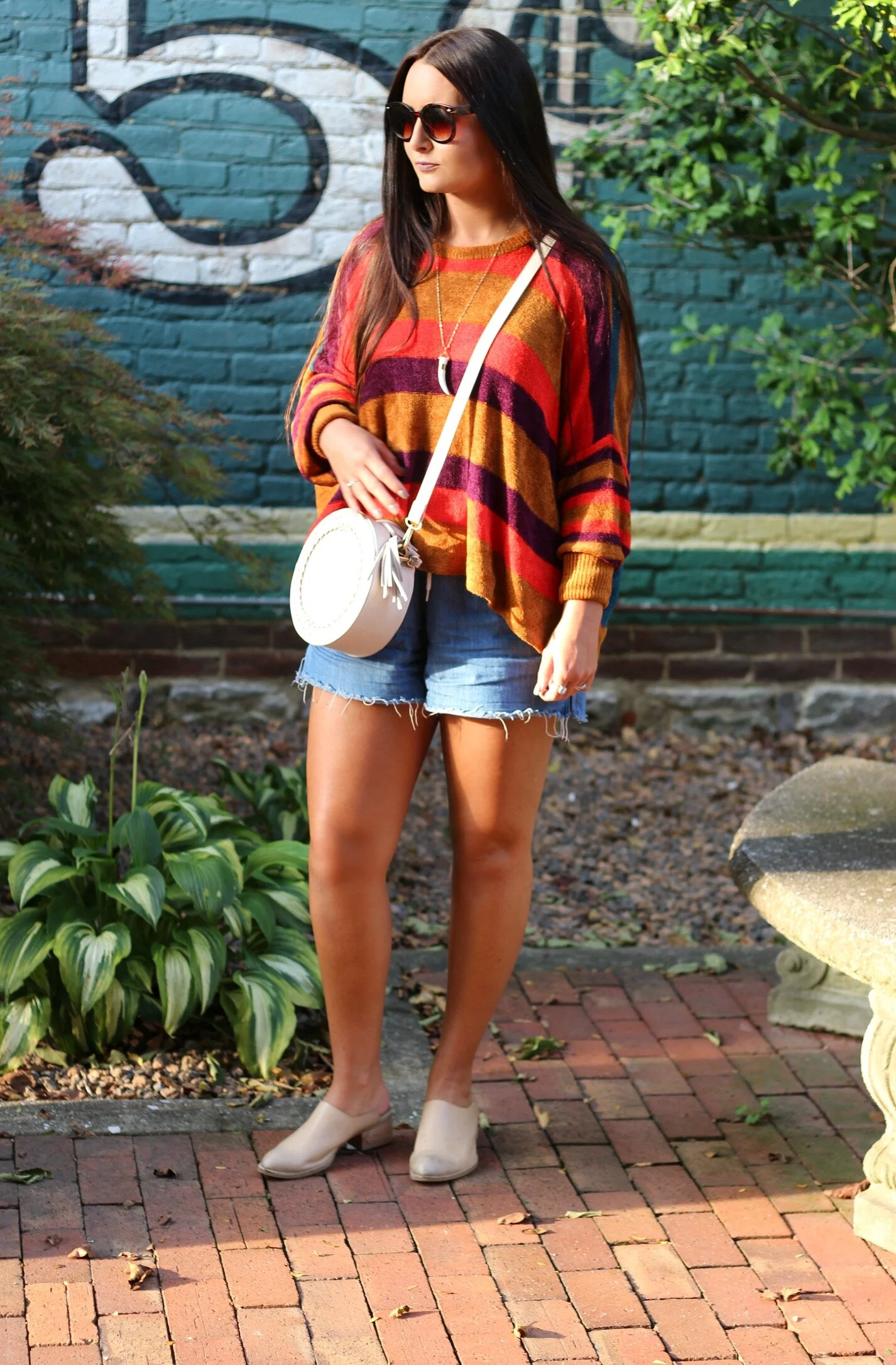Shorts + sweater weather = my favorite weather! We had the perfect slightly dreary and cool weather this weekend that felt like fall. Of course I wasted no time pulling on this cozy piece that I picked up at the Lexington Free People at their grand opening. I am not exaggerating when I say that this is the coziest, softest sweater ever and I especially love the 70's inspired striped print! The color combo is also perfect for fall and the fit is perfectly slouchy and flowy. I paired it with a few of my staple favorites: these chambray shorts from Madewell and leather mules. I've linked all my outfit details for you to shop above + below!
