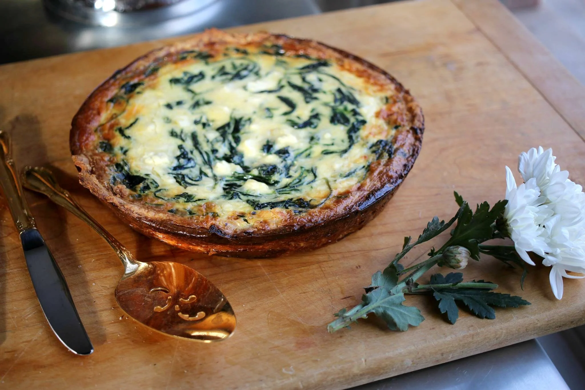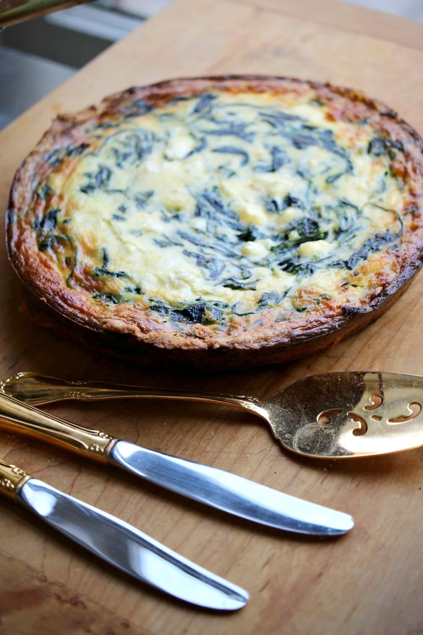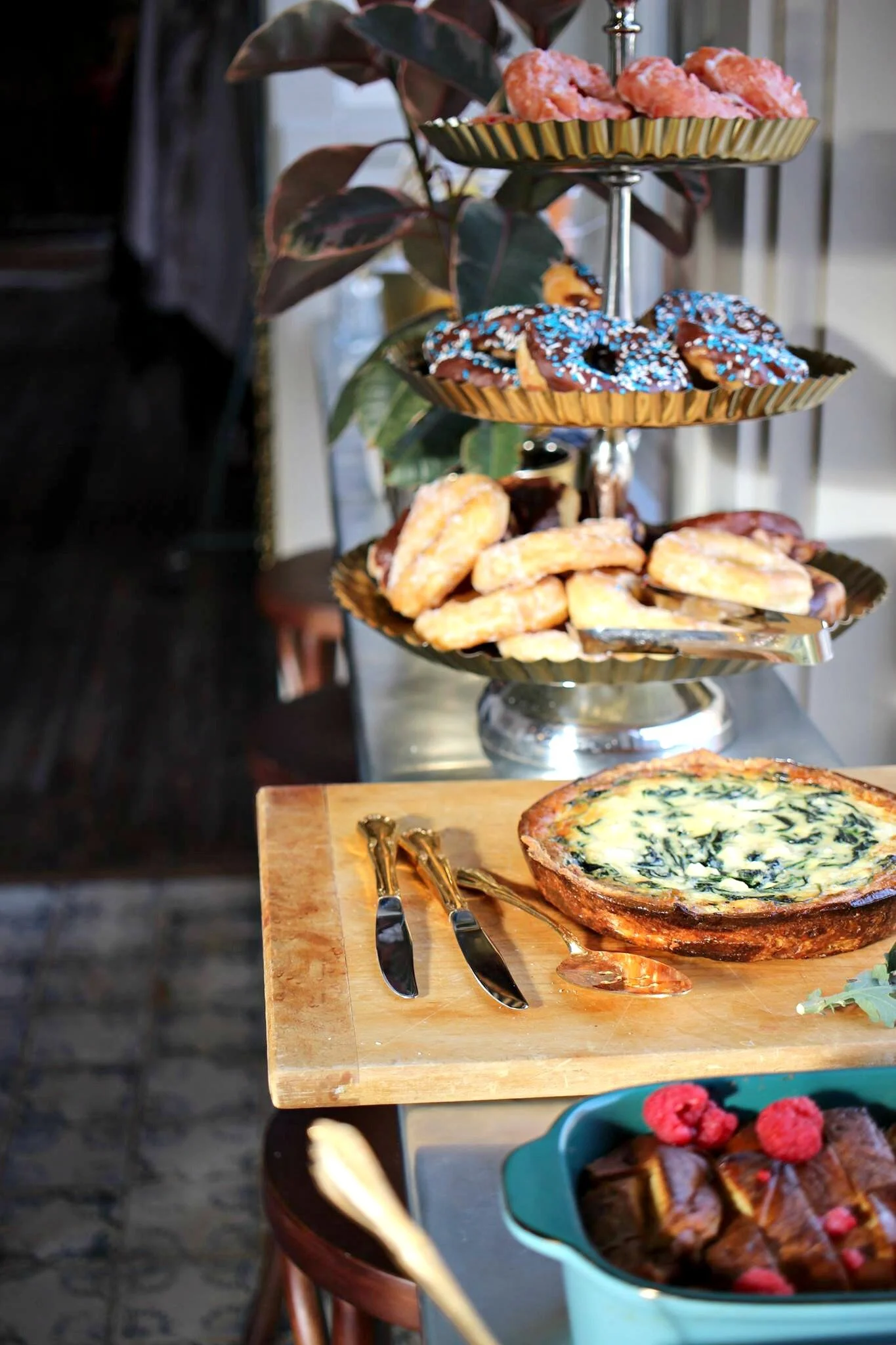 No brunch spread is complete without a quiche! This delicious savory quiche includes a one of my favorite combos: spinach + feta. It's the perfect balance to all the sweet dishes and treats I served at our blogger brunch and was definitely the dish I got the most compliments on! I used a frozen pie crust to make this recipe even quicker and easier, but if you prefer to make your own crust from scratch that's always an option. You can find the full list of ingredients and step by step instructions below!