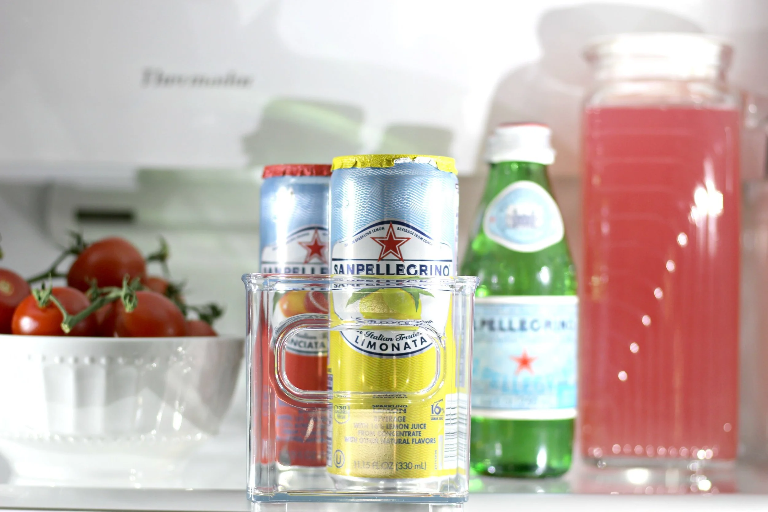 Your produce is some of your prettiest, brightest, and healthiest items so keep it front and center!  I like to use my drawers for less attractive items like beef, chicken, bacon, lunch meat, etc. and to corral larger packages like shredded cheese and sliced cheeses.  On shelves, line items up neatly front to back to give your fridge a streamlined look.  Use clear plastic bins to hold like objects- these are perfect because you can still see everything easily!