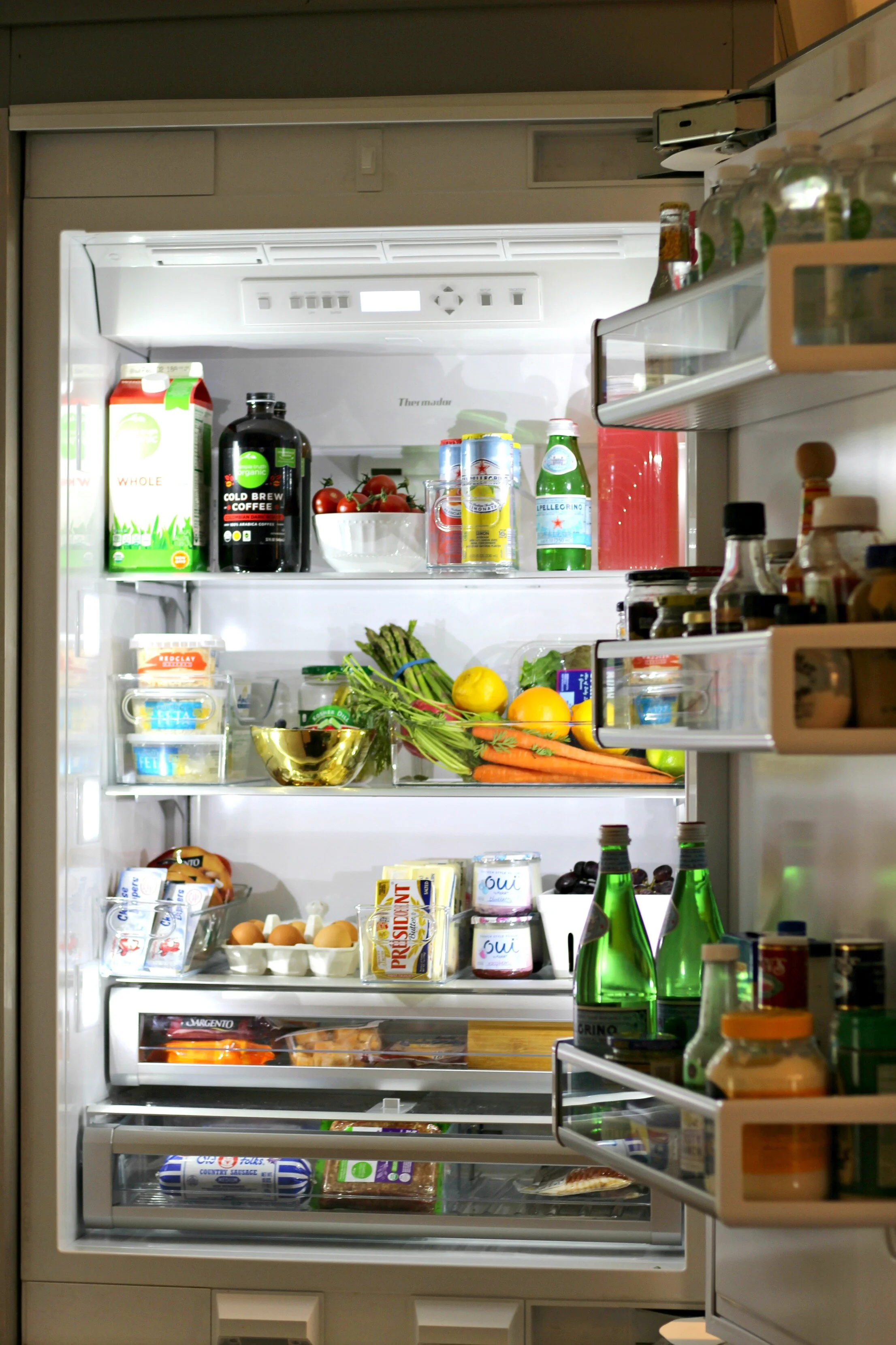 My top tip: Take as many items as you can OUT OF PACKAGES!  For example, I love my ceramic egg carton and always take my eggs out and place them in there.  It only takes a few seconds, but makes such a big difference.  Another example- I poured my juice into a clear + simple glass pitcher for a more clean and streamlined look.  I also have a white ceramic produce basket that I put fruit inside.  It makes it super easy to grab a few bites anytime you are looking for a snack.   Get rid of all the boxes, plastic, and additional labels that you can if you truly want to have an aesthetically pleasing fridge.