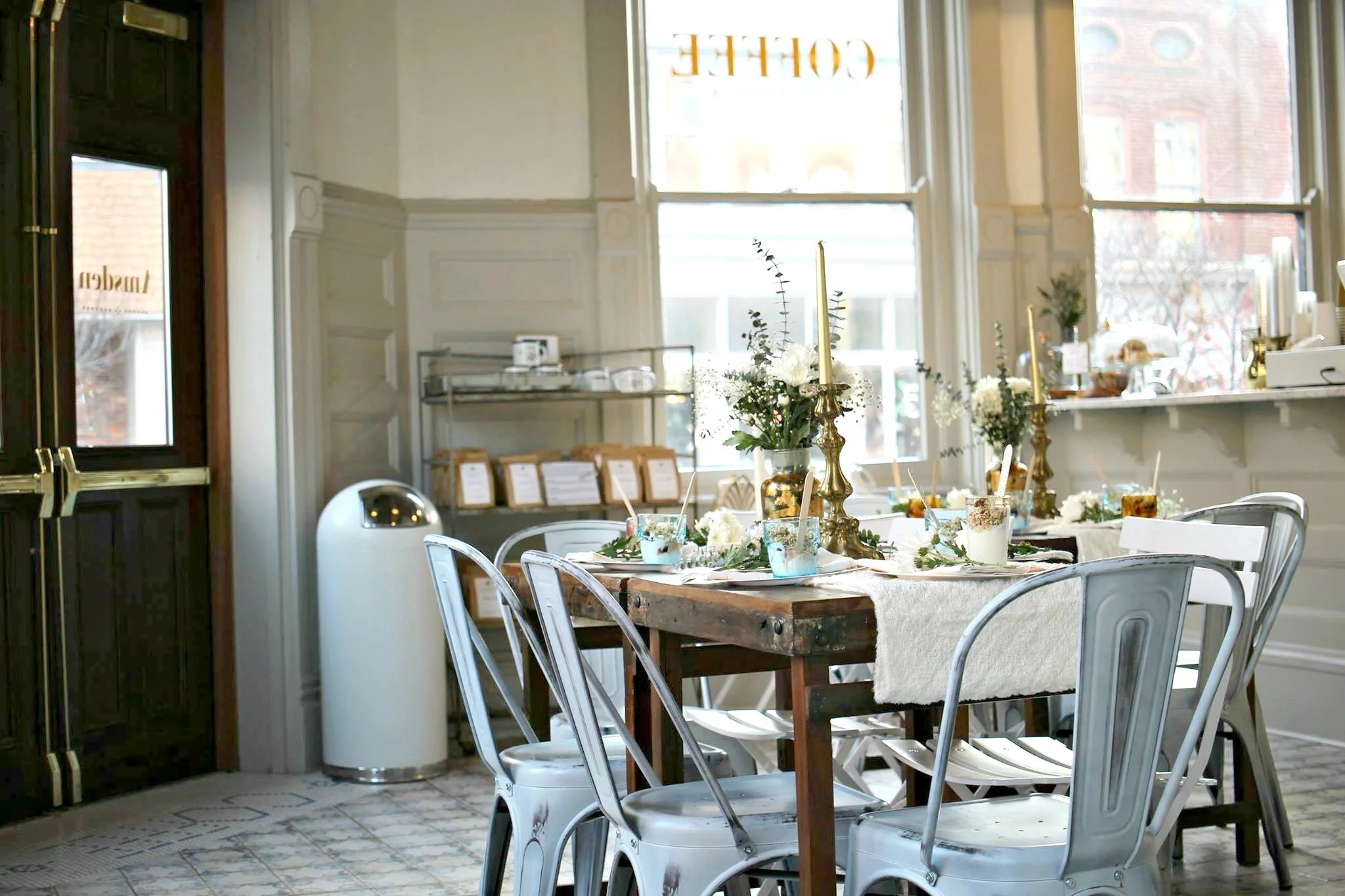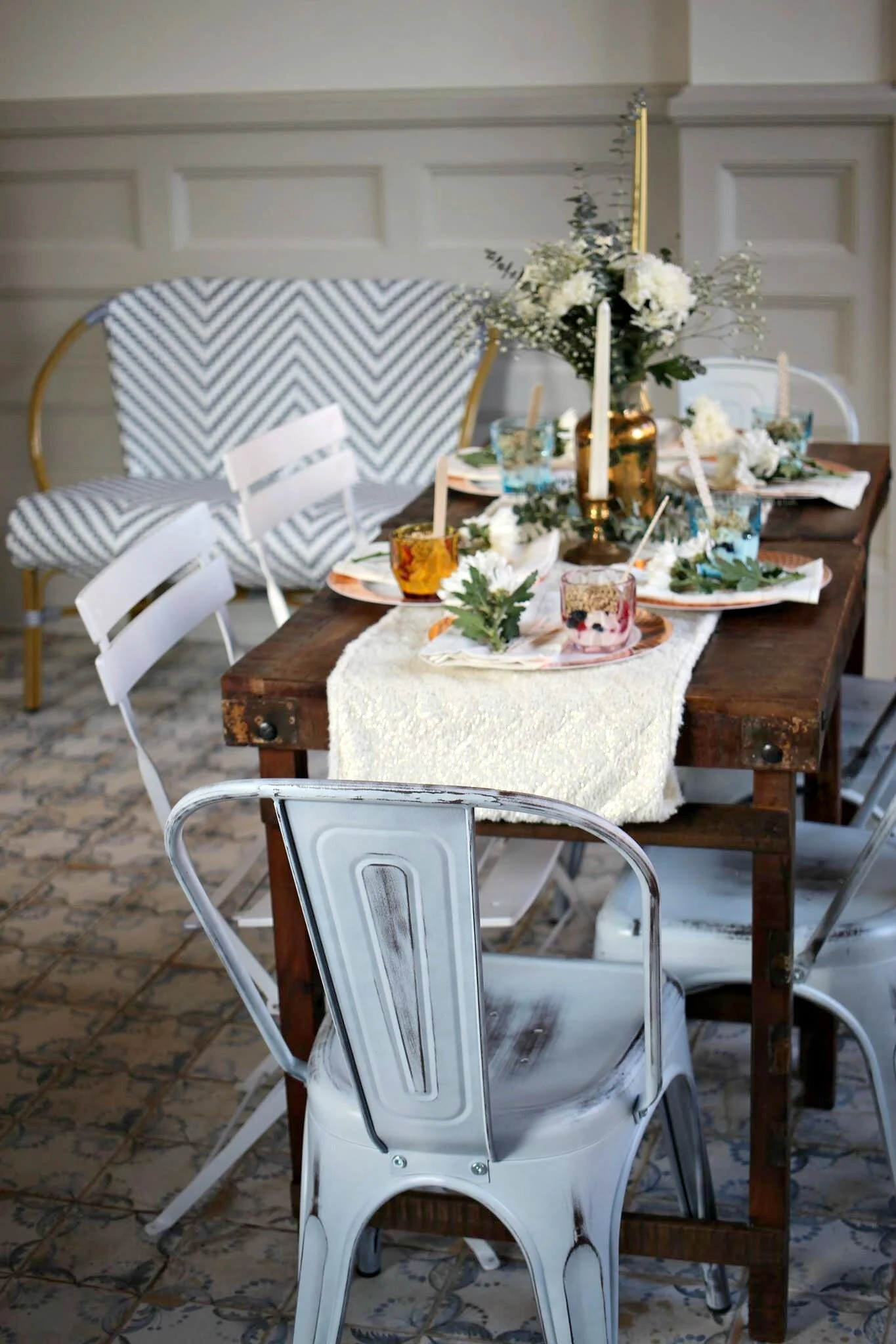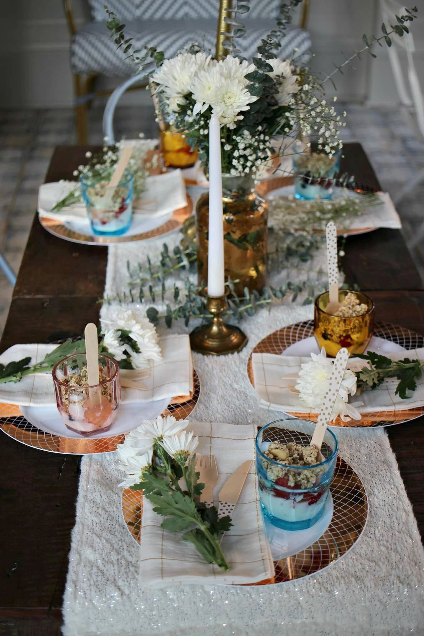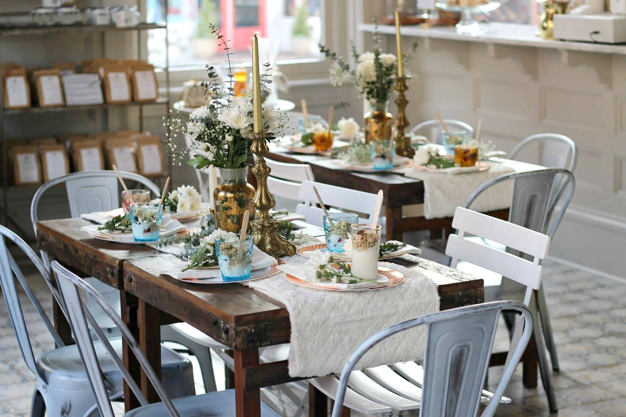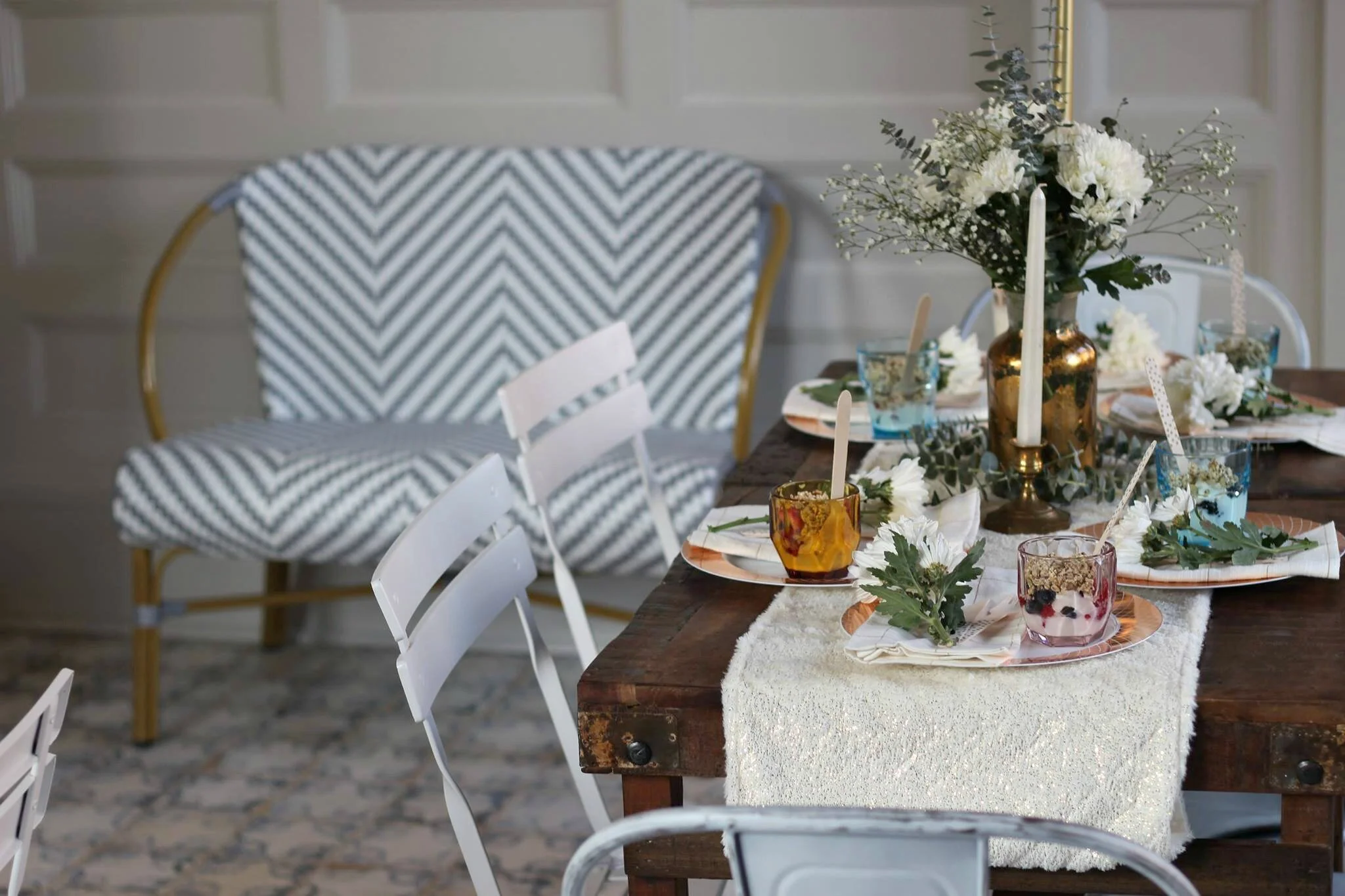 This past weekend I was thrilled to host the most fun little brunch at The Amsden for a group of my local blogger friends. I'm hoping this will be the first of many events like this in our spaces and I had so much fun decorating and setting everything up inside the coffee shop. I decided to keep it simple and go with a winter white theme on the table settings. I found the table runners, napkins, and cute disposable plates at Homegoods. I wanted to keep cleanup simple so I also used this disposable wooden flatware which was super cute but also practical! I put together some quick floral arrangements in gold jars using all white flowers, eucalyptus, and baby's breath. I also cut some extra stems to lay on each place setting on top of the plate and napkin.