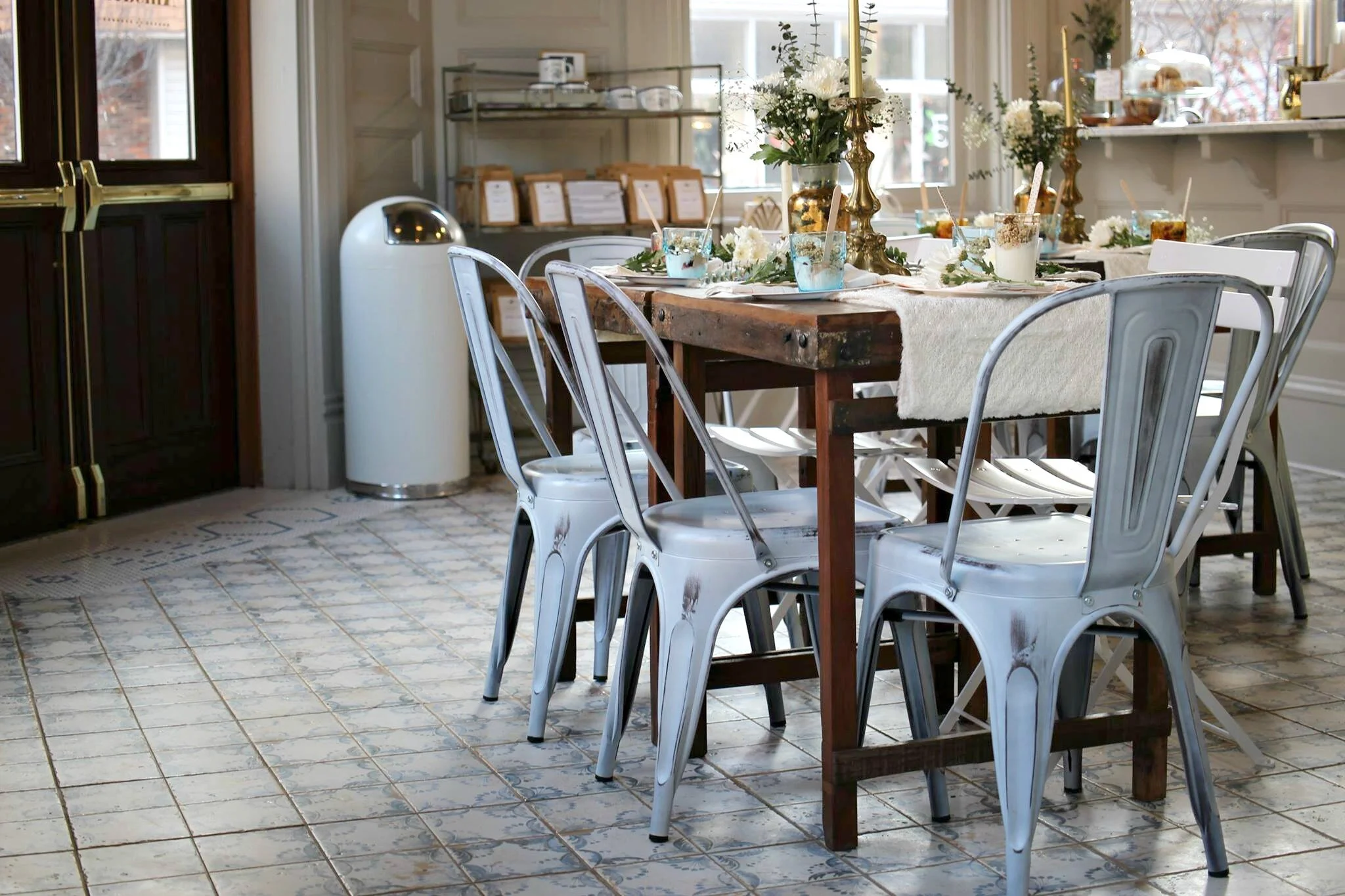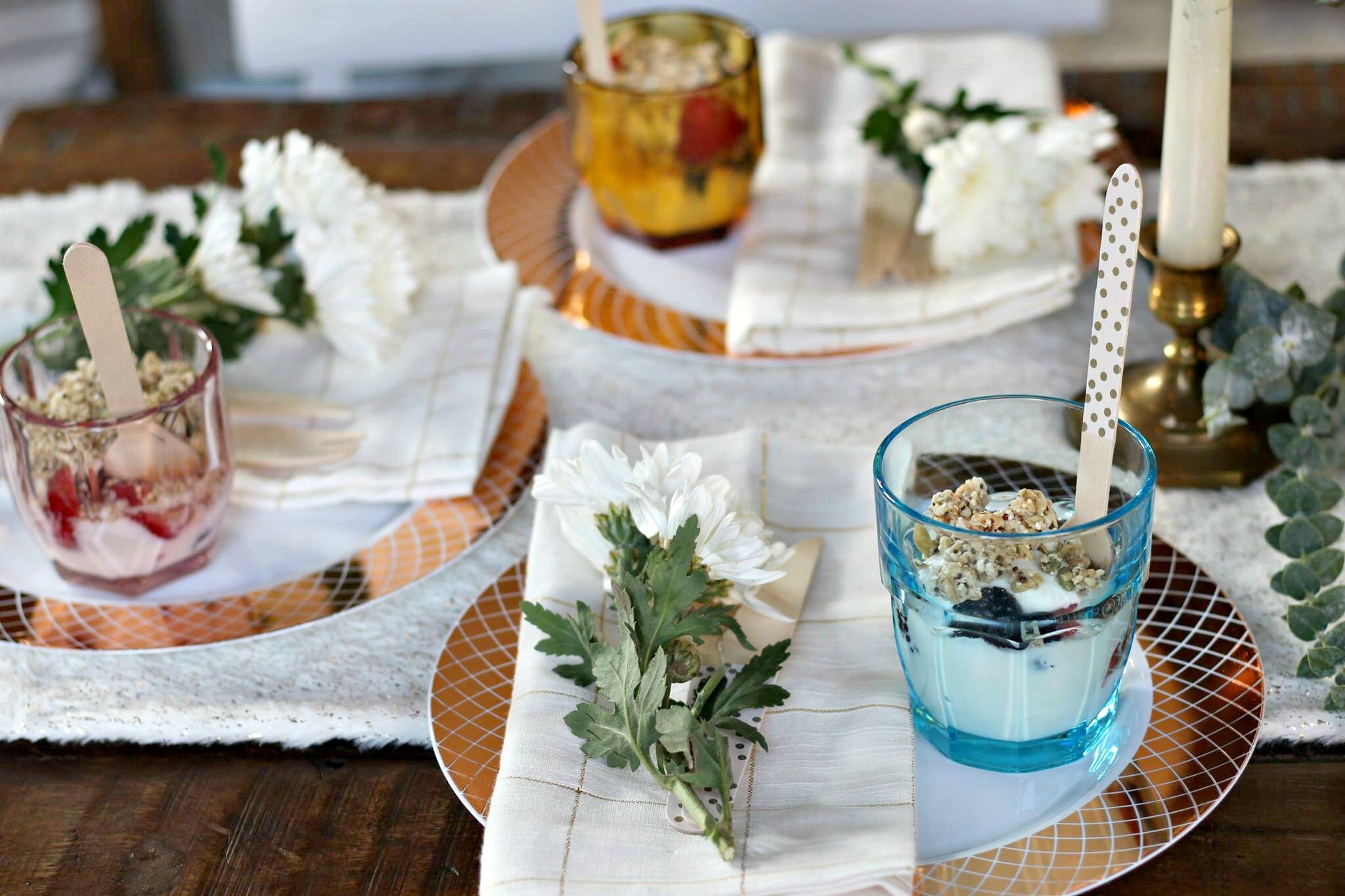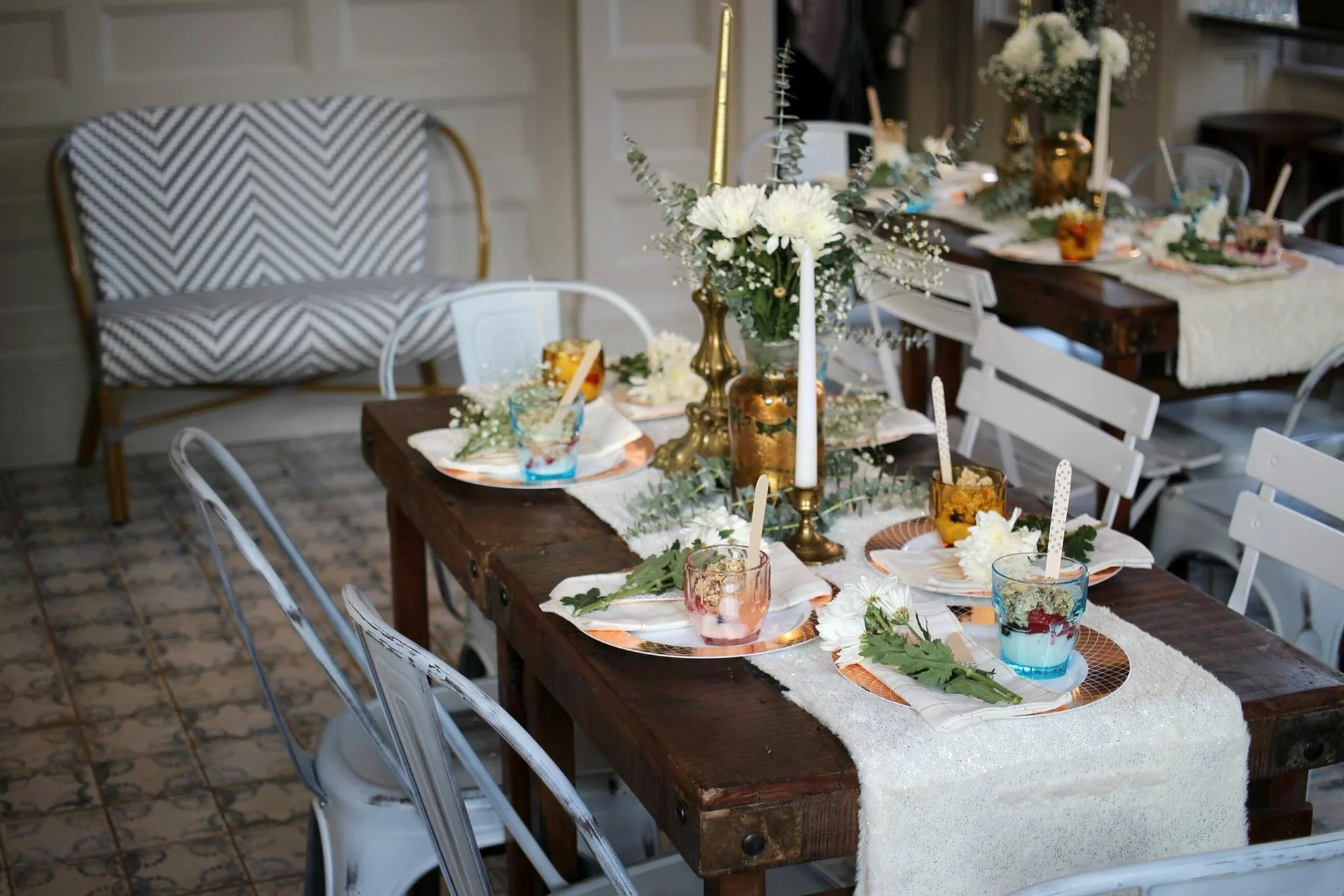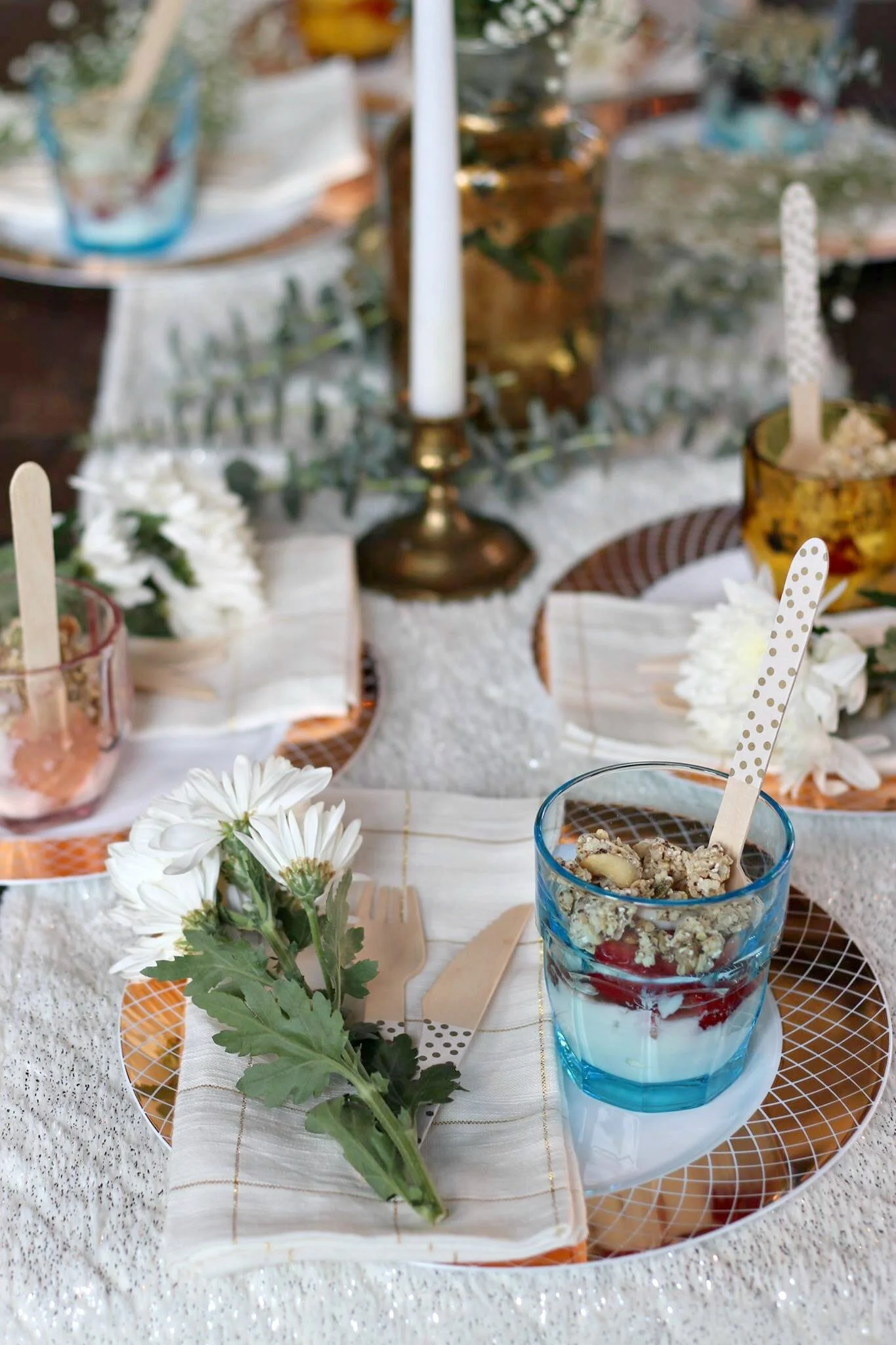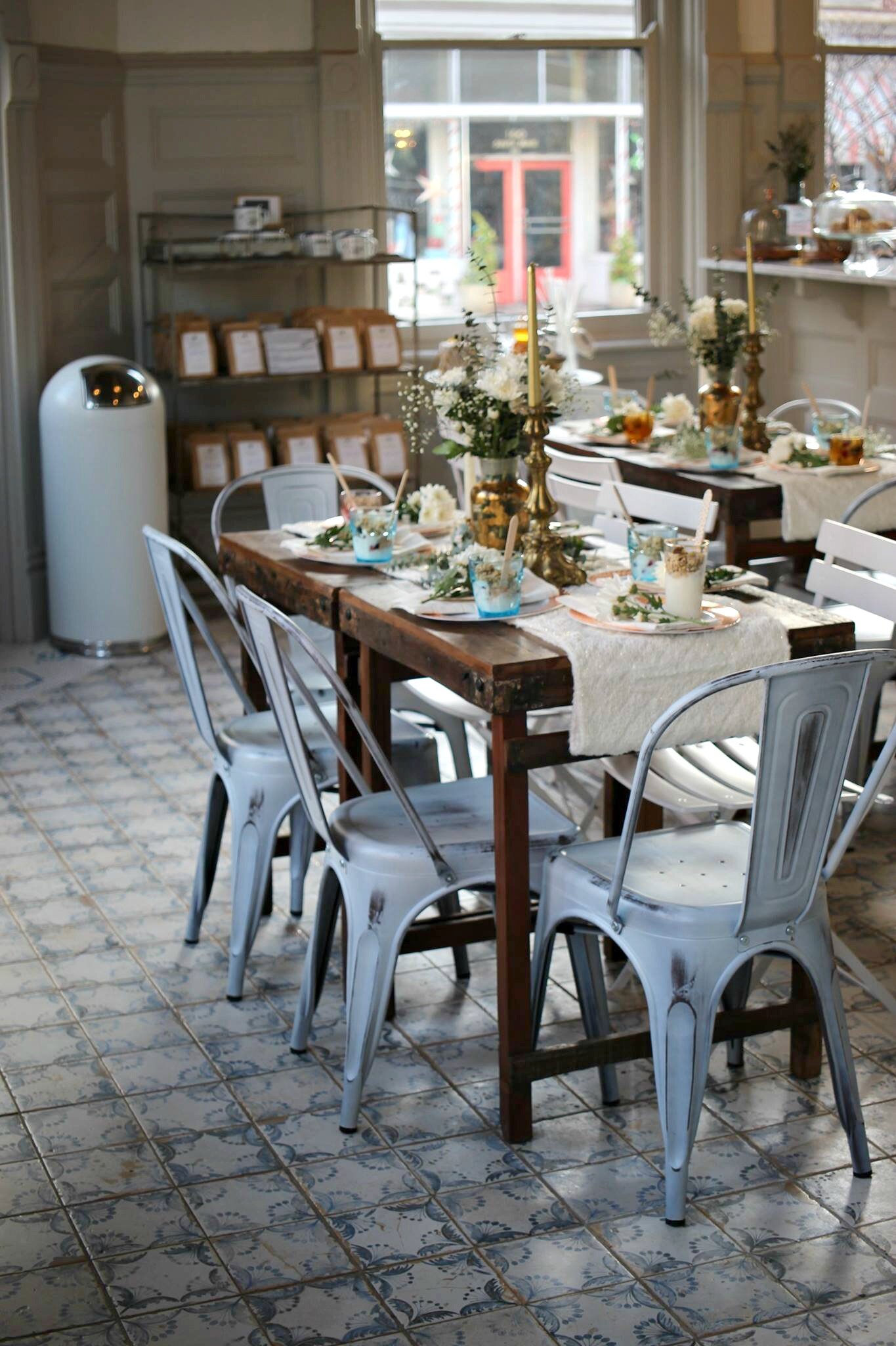 This past weekend I was thrilled to host the most fun little brunch at The Amsden for a group of my local blogger friends. I'm hoping this will be the first of many events like this in our spaces and I had so much fun decorating and setting everything up inside the coffee shop. I decided to keep it simple and go with a winter white theme on the table settings. I found the table runners, napkins, and cute disposable plates at Homegoods. I wanted to keep cleanup simple so I also used this disposable wooden flatware which was super cute but also practical! I put together some quick floral arrangements in gold jars using all white flowers, eucalyptus, and baby's breath. I also cut some extra stems to lay on each place setting on top of the plate and napkin.