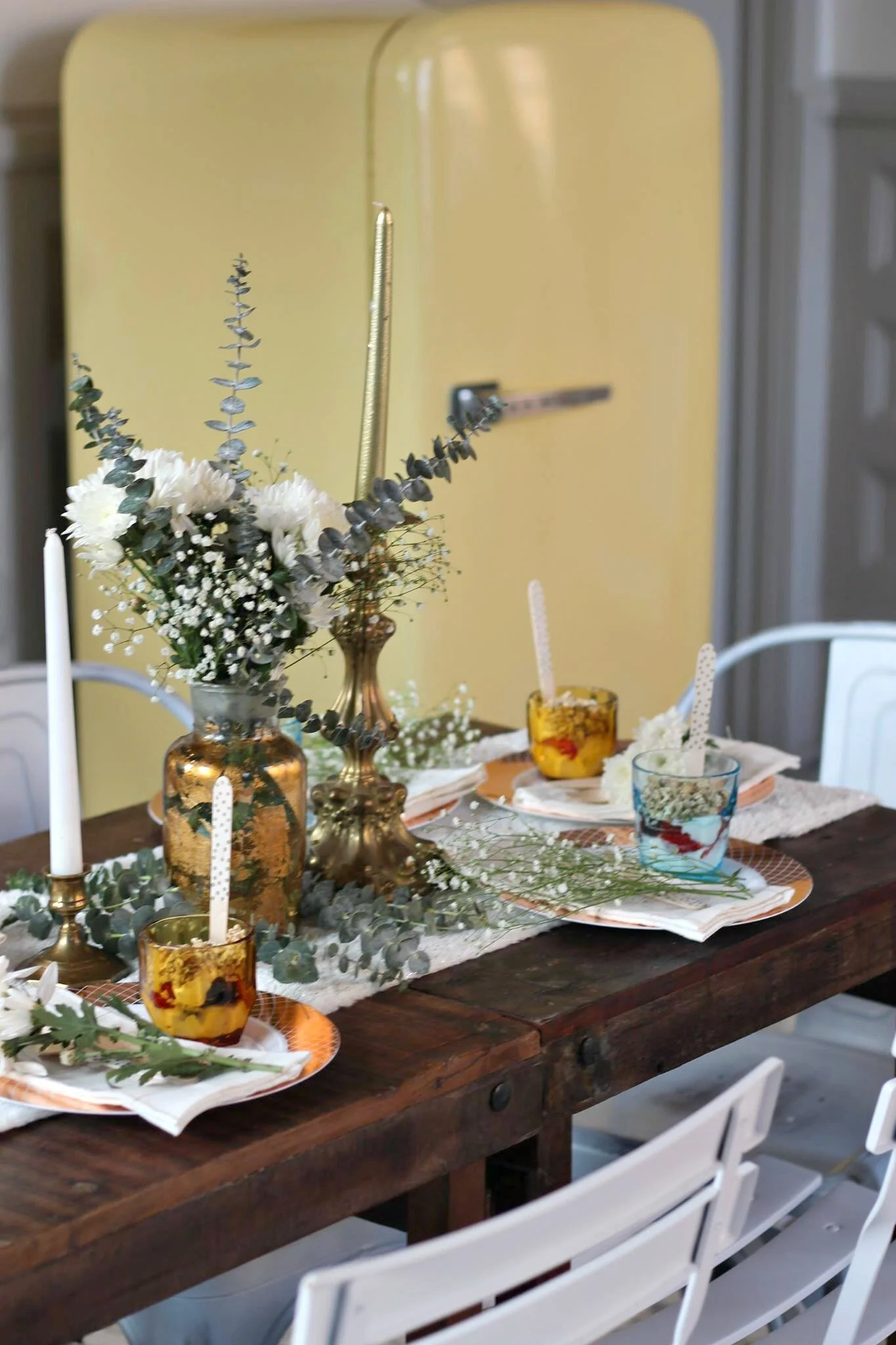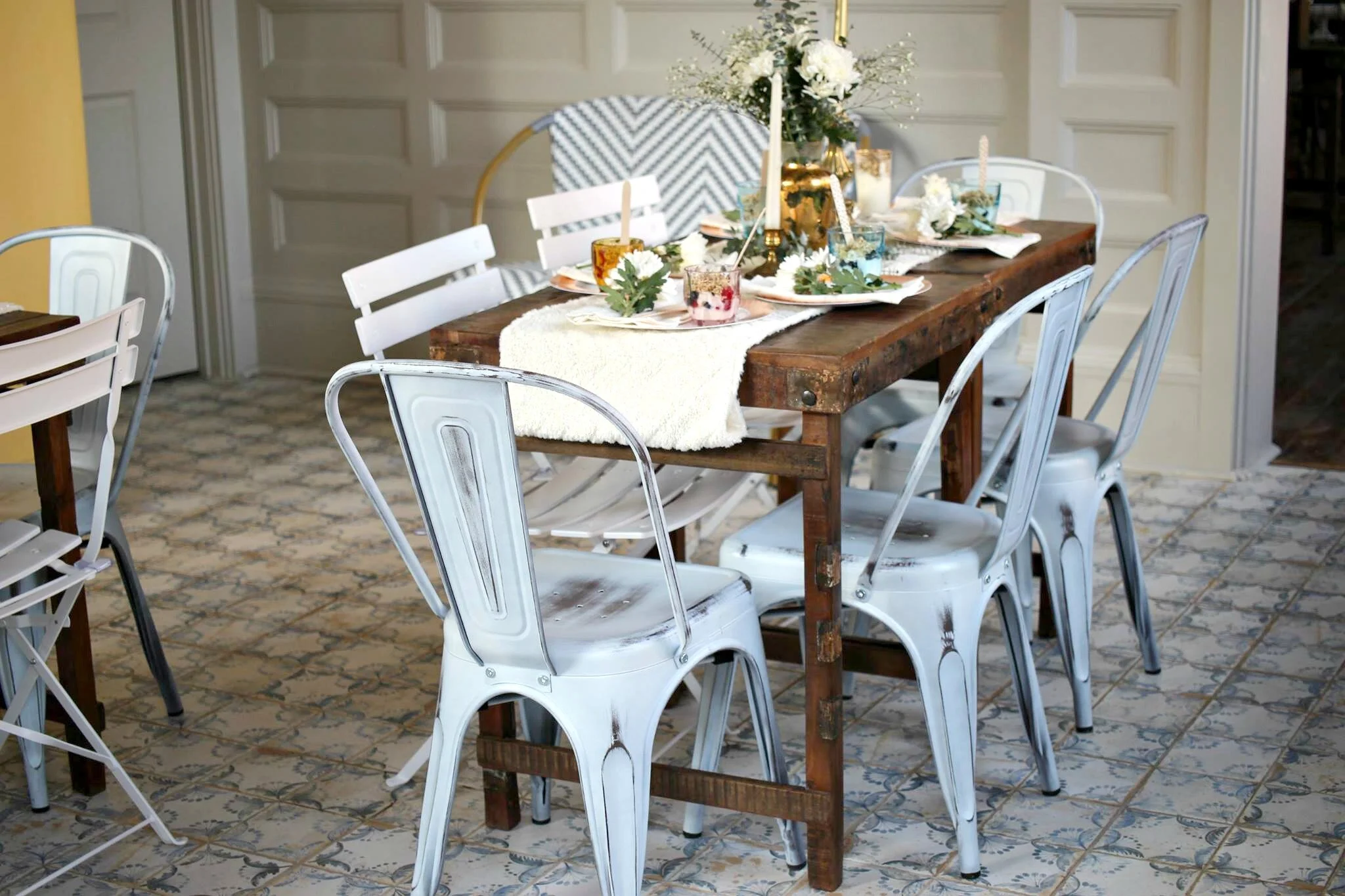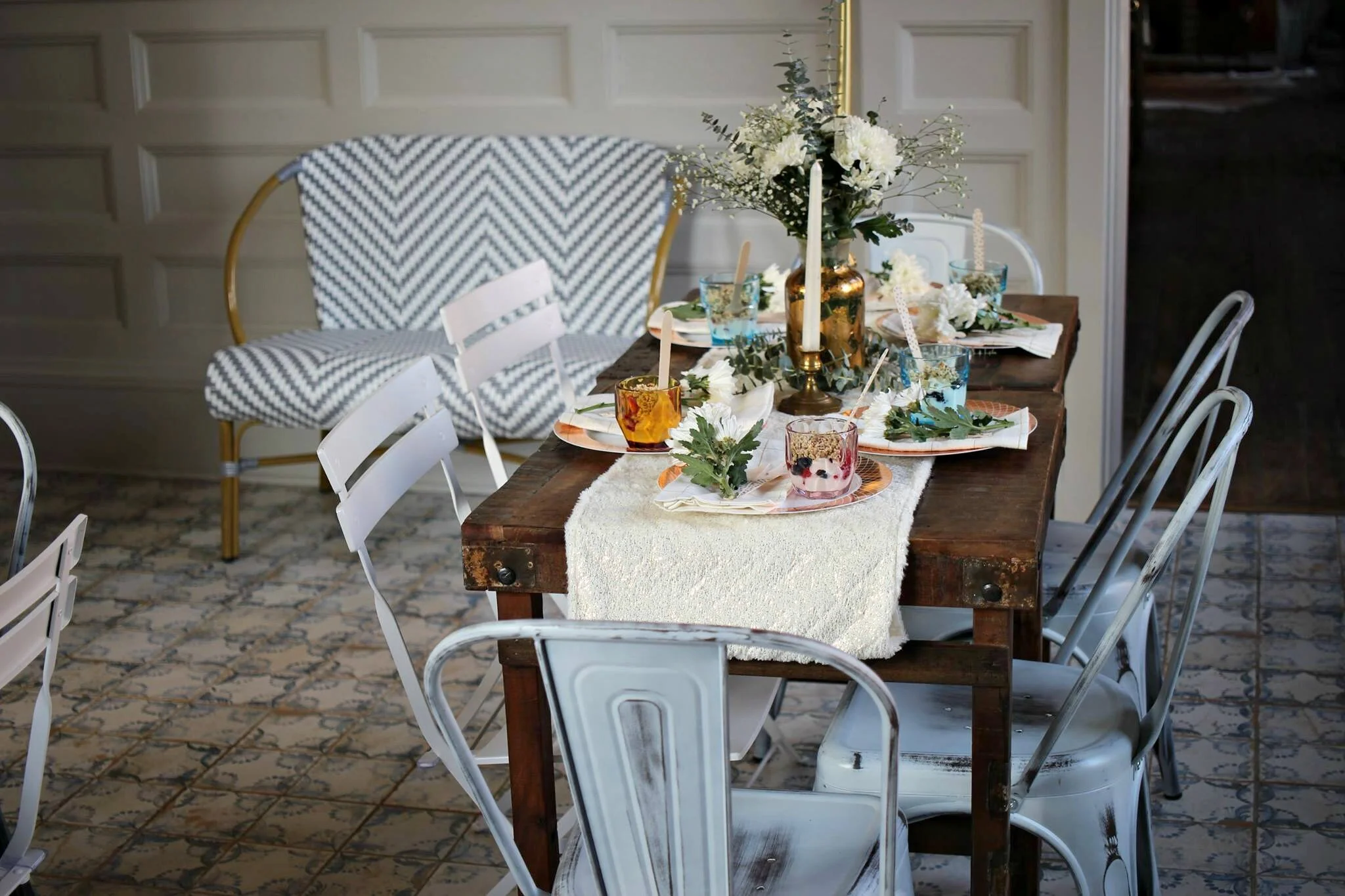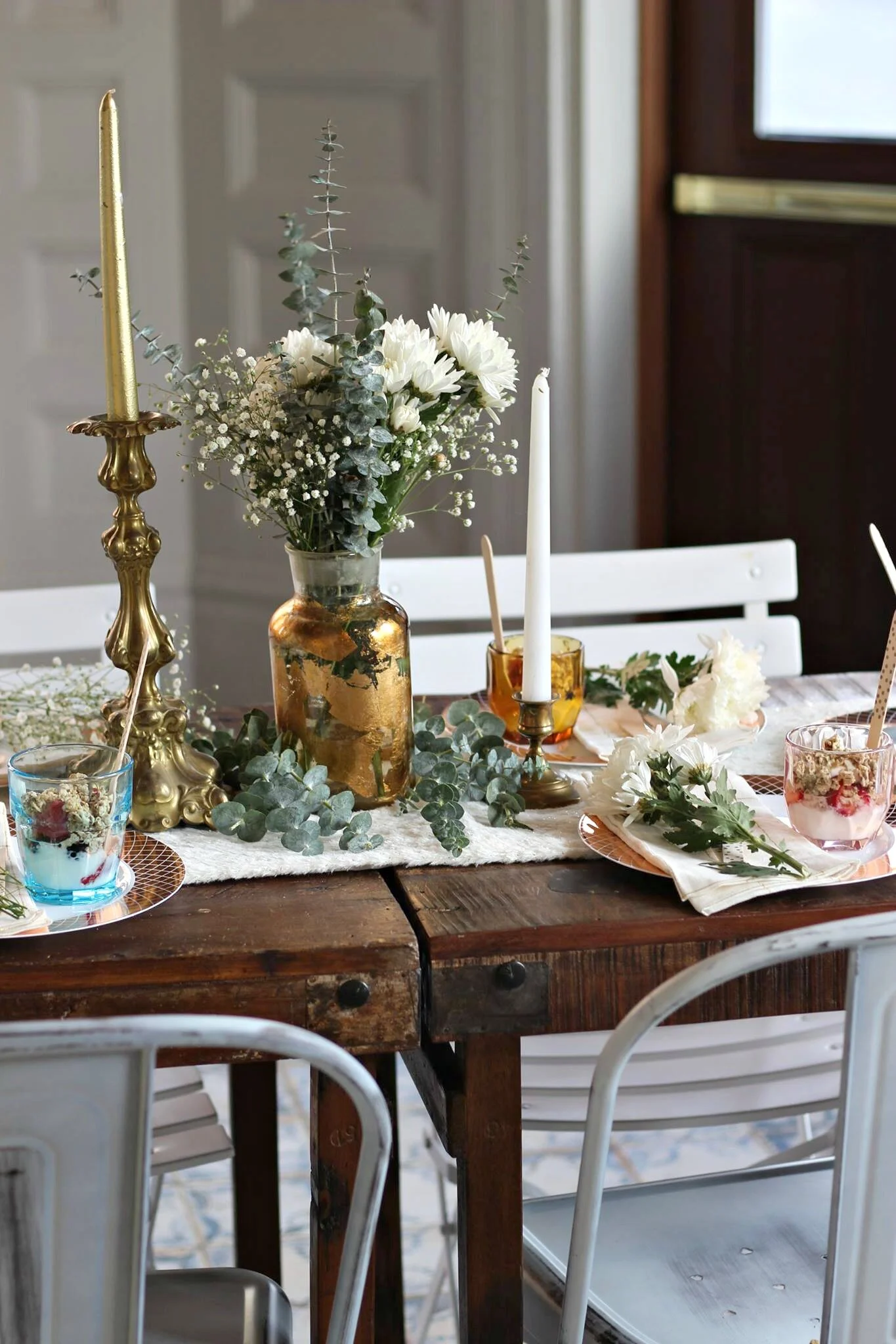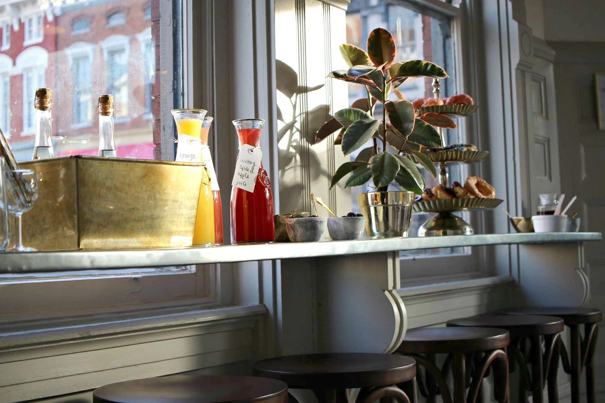 This past weekend I was thrilled to host the most fun little brunch at The Amsden for a group of my local blogger friends. I'm hoping this will be the first of many events like this in our spaces and I had so much fun decorating and setting everything up inside the coffee shop. I decided to keep it simple and go with a winter white theme on the table settings. I found the table runners, napkins, and cute disposable plates at Homegoods. I wanted to keep cleanup simple so I also used this disposable wooden flatware which was super cute but also practical! I put together some quick floral arrangements in gold jars using all white flowers, eucalyptus, and baby's breath. I also cut some extra stems to lay on each place setting on top of the plate and napkin.