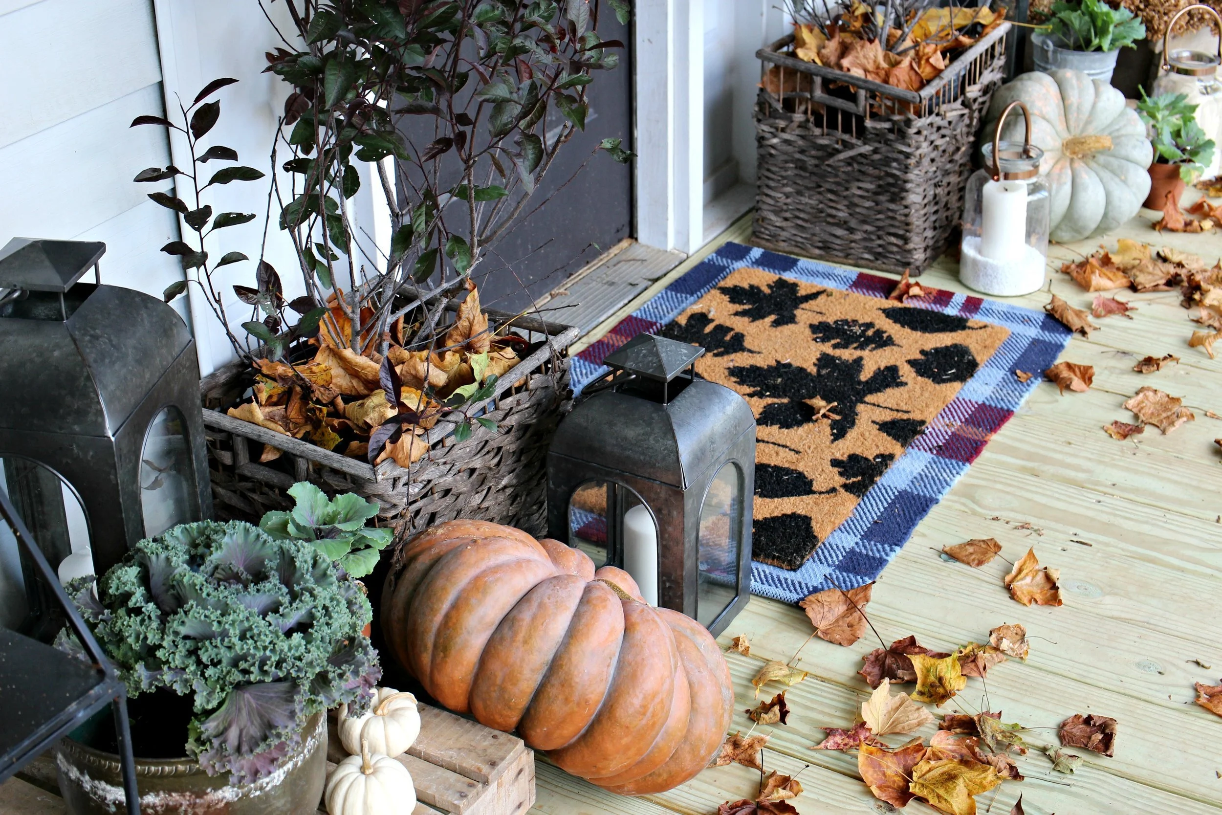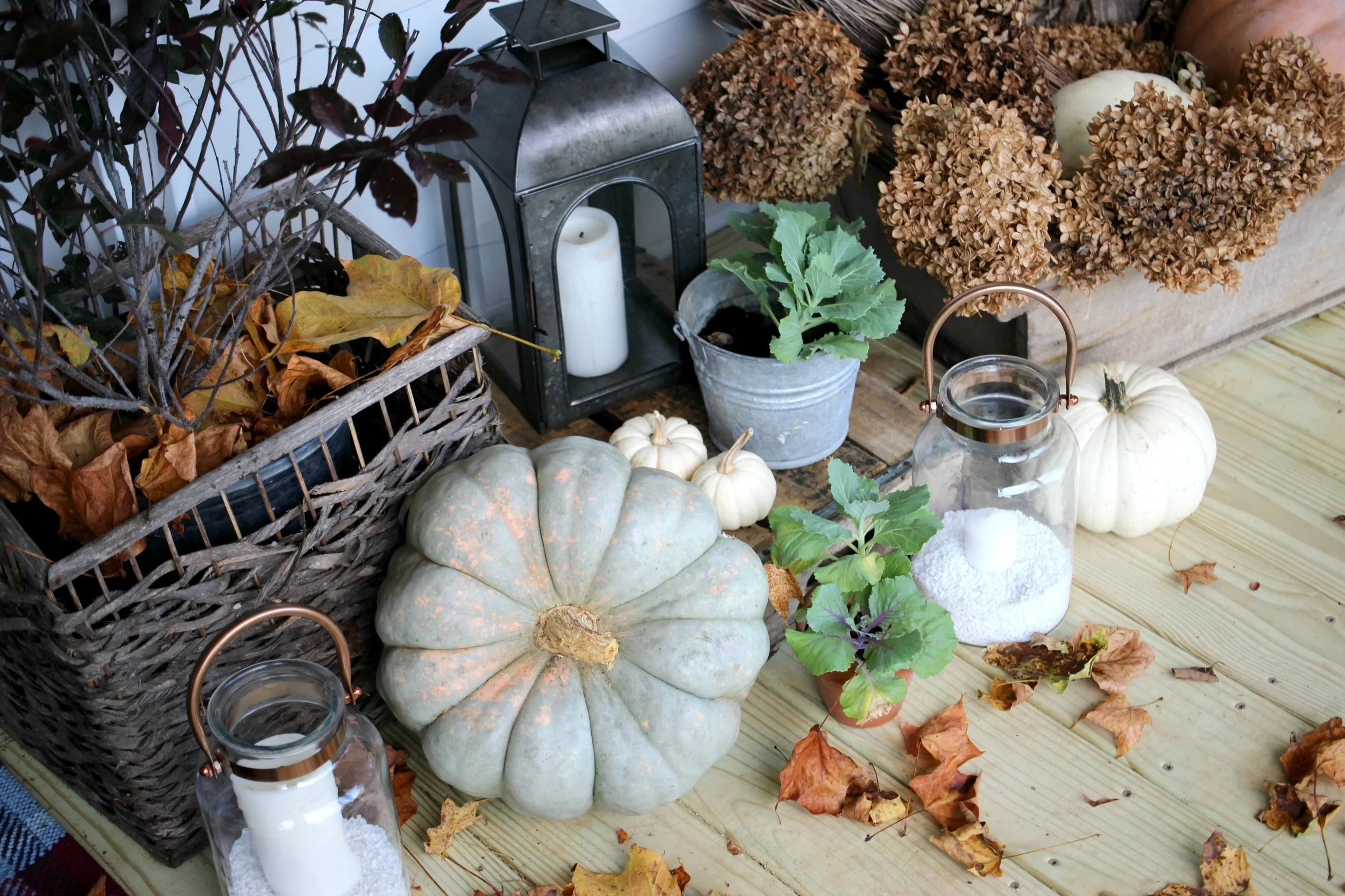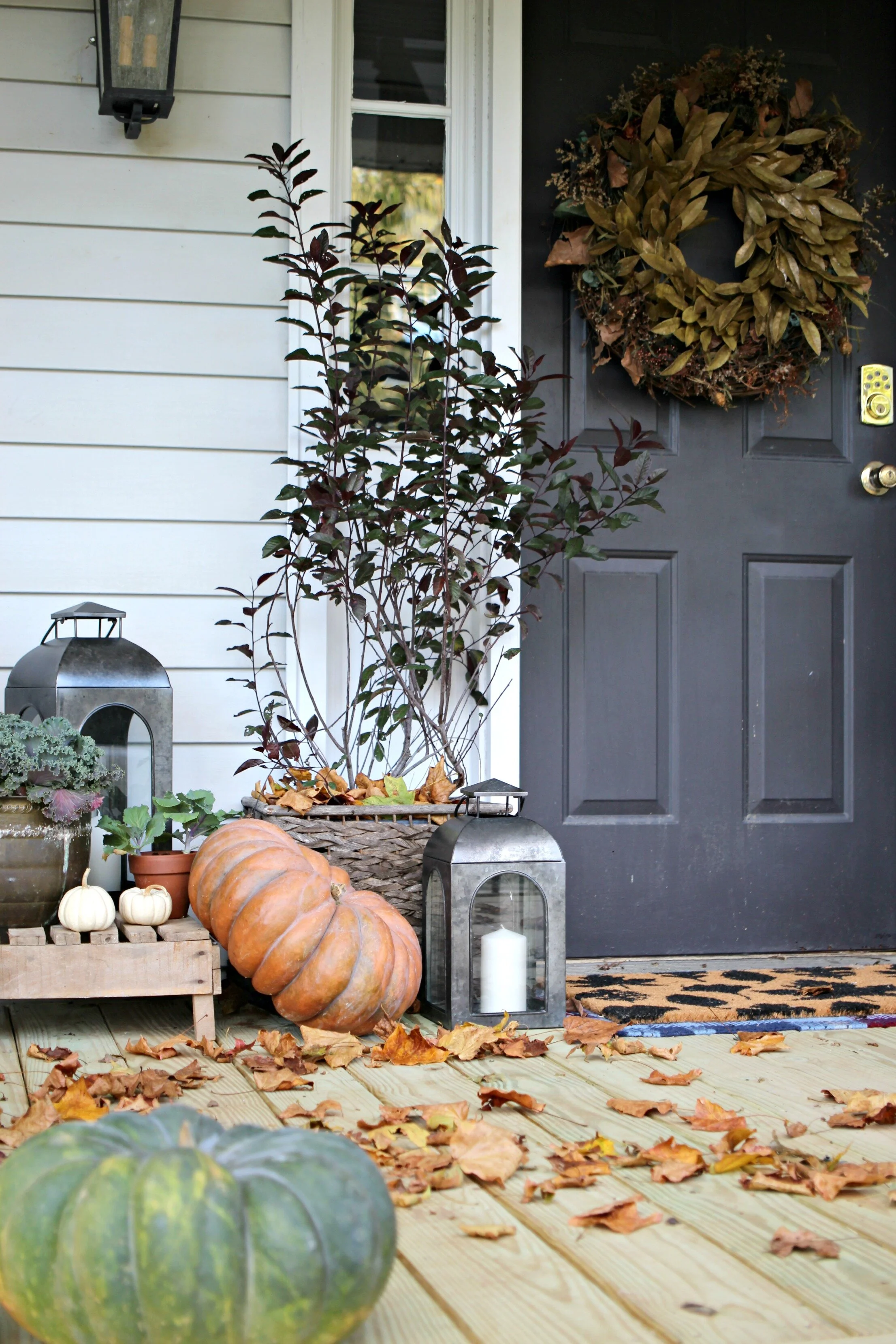 Lanterns are a great item to use for porch decor year round. They add some height and you can get them in a variety of styles and sizes. I used 3 dark metal ones (one in a larger size and two in a medium size) and also 2 smaller glass and copper lanterns. You can place battery operated candles inside, real pillar candles, citronella candles, or battery-operated twinkle lights. I also added some white rock at the bottom of my glass lanterns for extra texture and to make these feel more full and substantial.