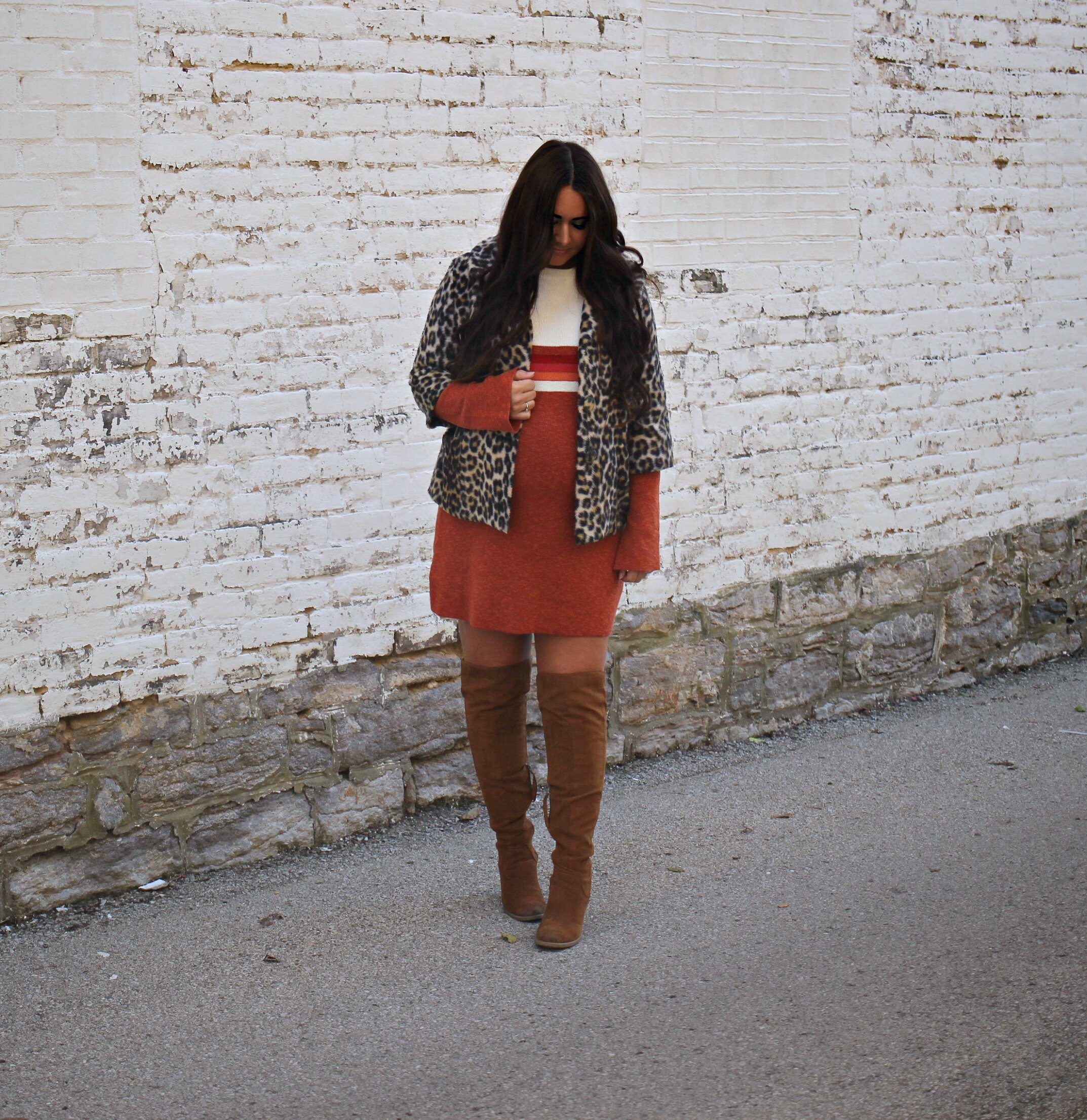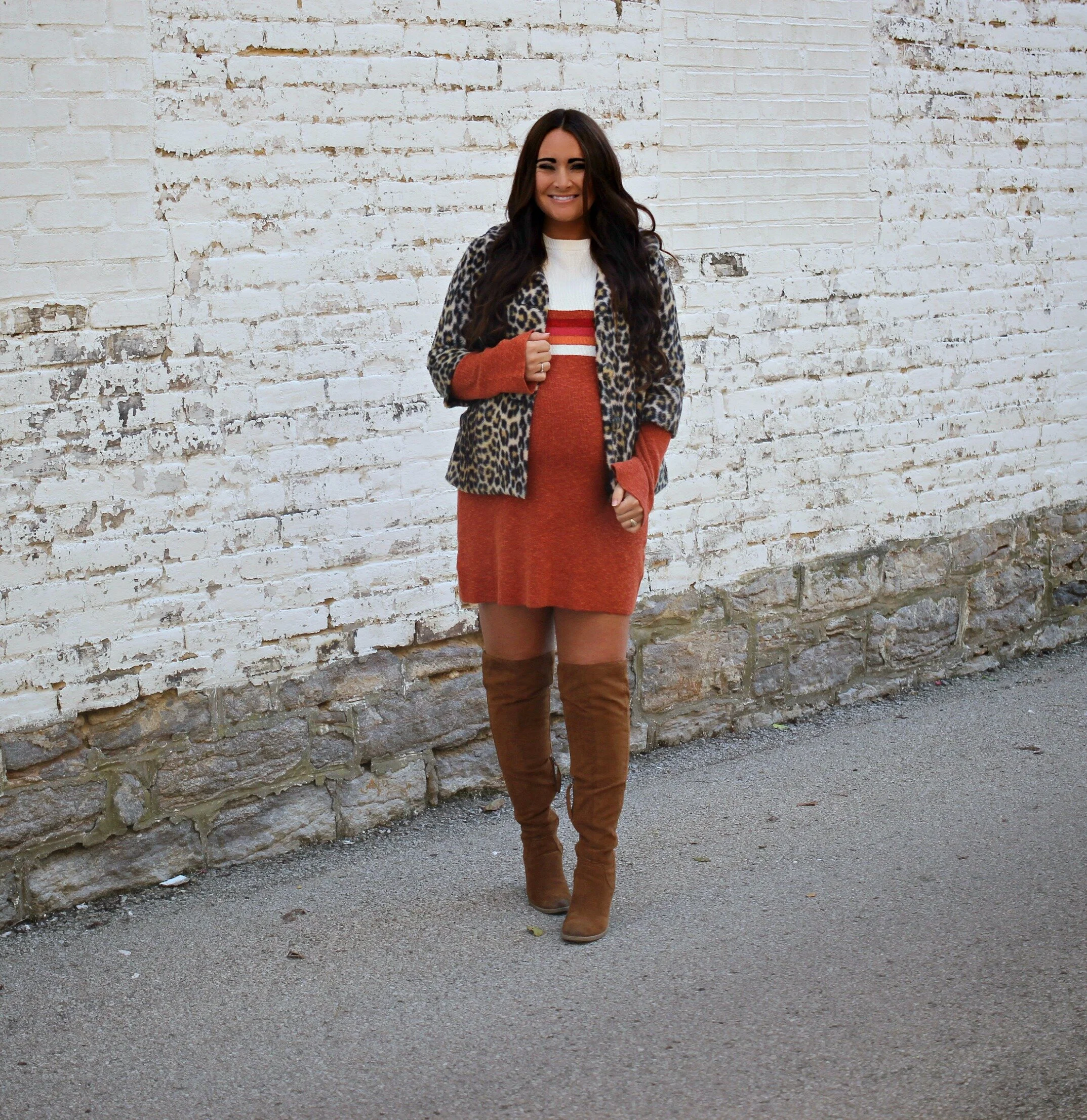 I had to be dressed up the ENTIRE weekend and at 36 weeks pregnant it was not exactly fun or comfortable. Thank goodness I found this Free People sweater dress- even though it was not maternity, it was so comfortable and made me feel somewhat fashionable and fall-ish! I knew that Free People would have a lot of options that would work for my super pregnant figure because their silhouettes always lean toward more flowy and oversized anyways. I was able to squeeze on my favorite vintage leopard coat on top (unbuttoned of course!) and I loved the mix of the stripes and leopard patterns! I know I’ll be wearing this dress even beyond pregnancy which is a huge win! You can shop my entire outfit through the links above + below!