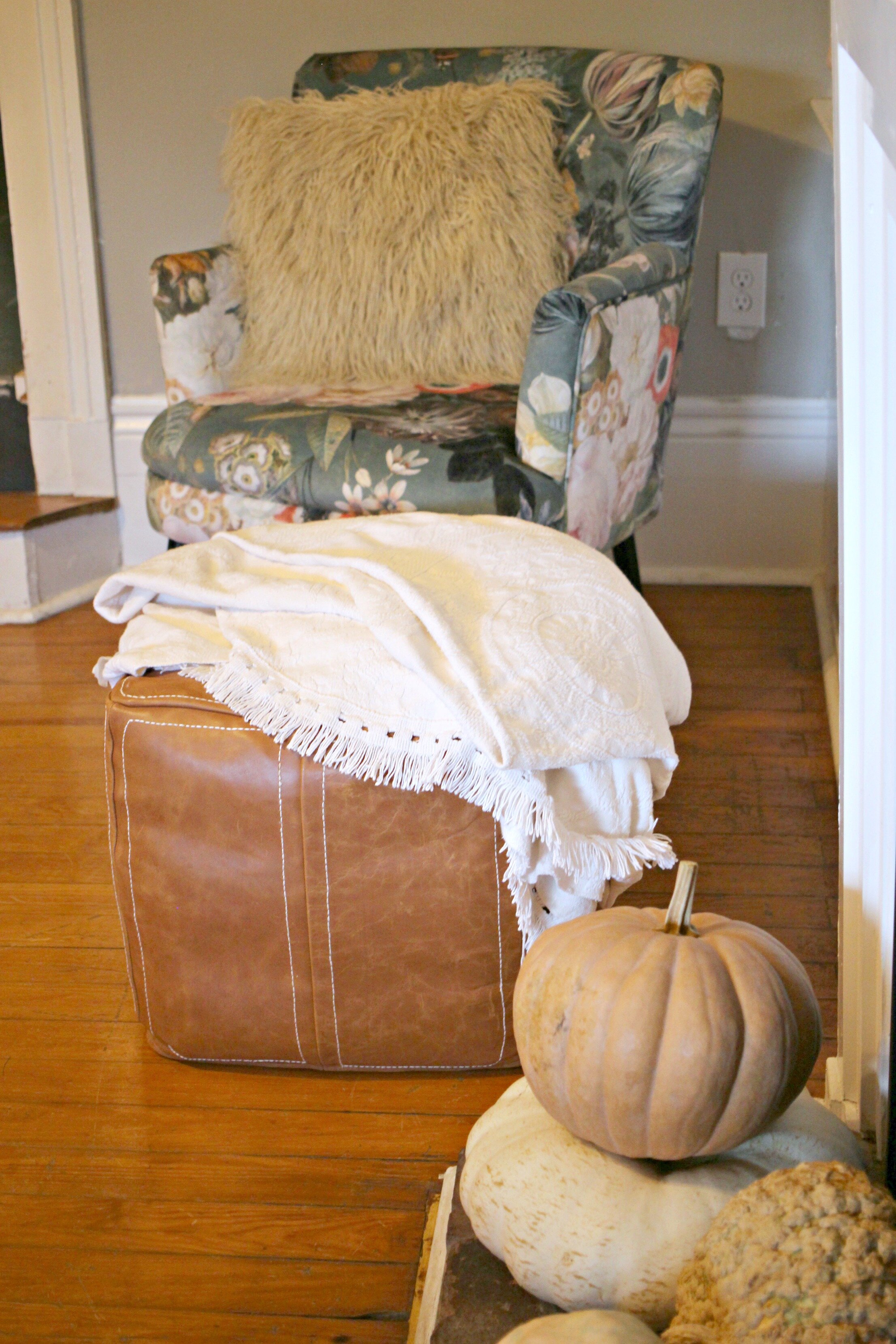 The next space up on my fall home tour is my living room! I have been steering more towards all neutrals and pale pastels in this room lately so I decided to keep that feel for fall instead of adding my usual pops of orange and browns. I used lots of layered velvet and knit pillows on the couch in all different shades of cream. blush, and magenta mixed in with my favorite gold leaf pillows from Homegoods. I layered up the mantle a bit more than I usually do for fall by adding some eucalyptus garland and then piled up some neutral pumpkins on the threshold too. I always add lots of pumpkins to my built-in shelves, all white and metallic this year, and also added a few vases with simple fall stems. I’ve linked everything that is newer/ still in stores below, but if you have questions about anything else, just ask!
