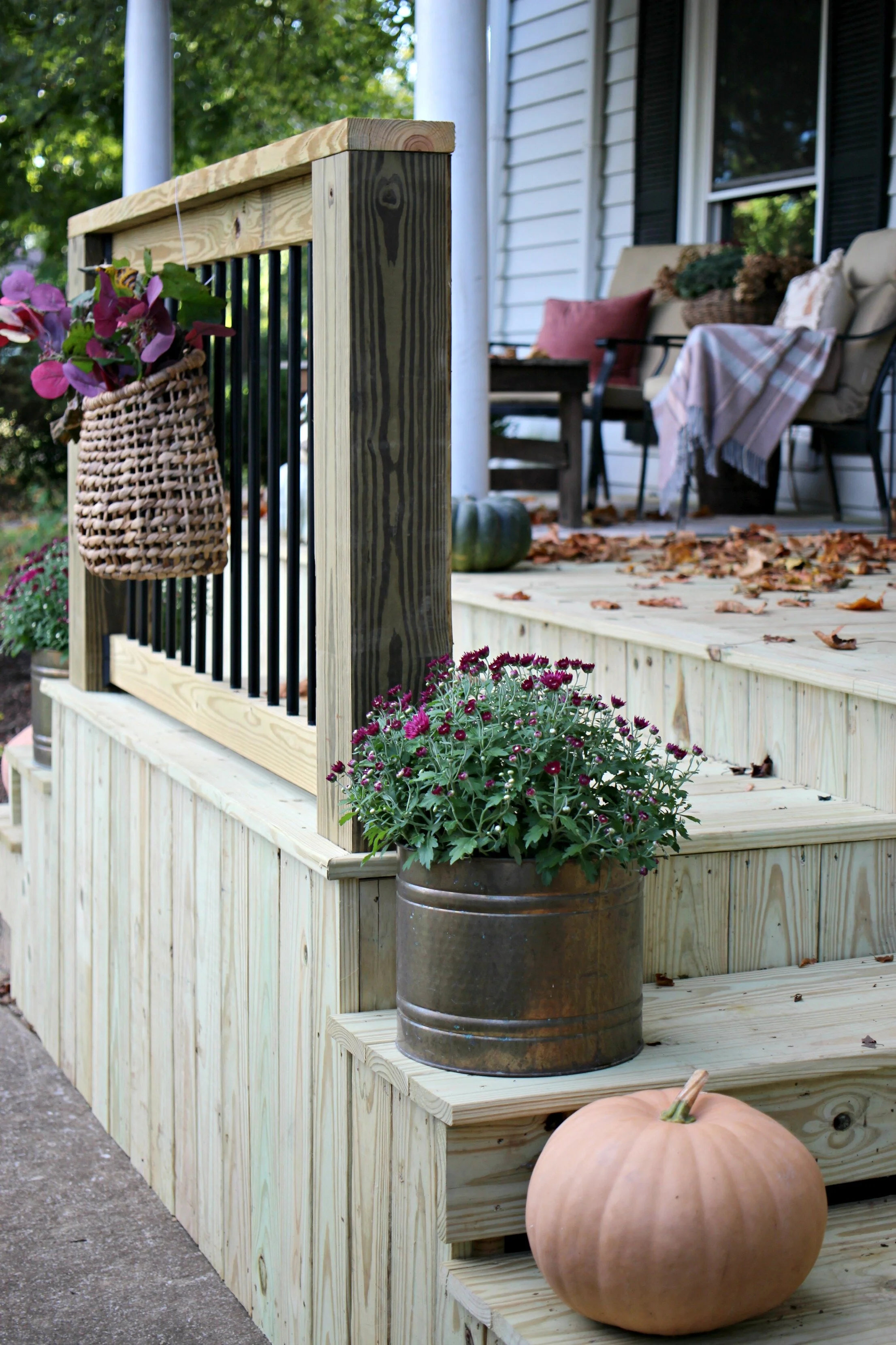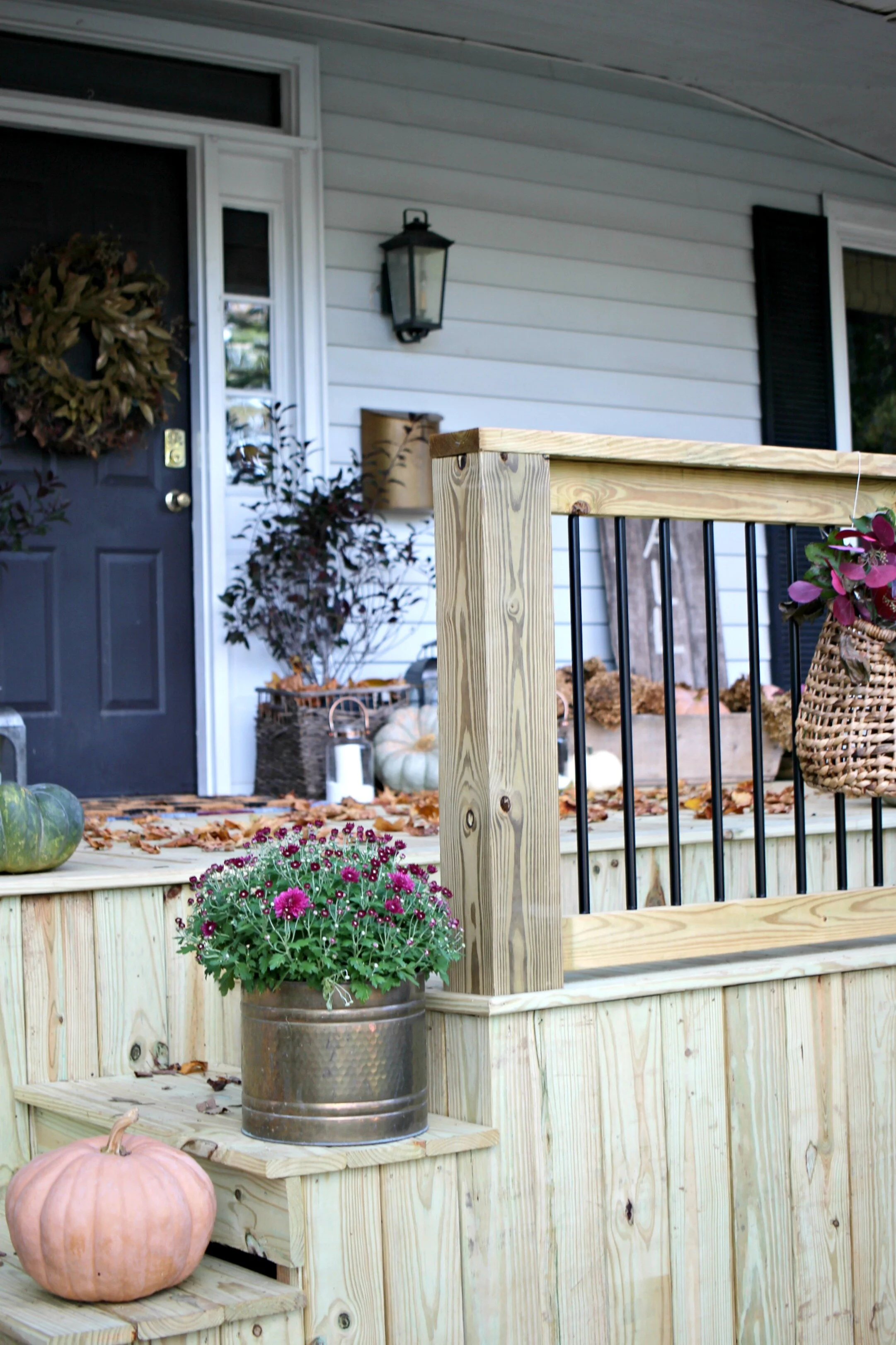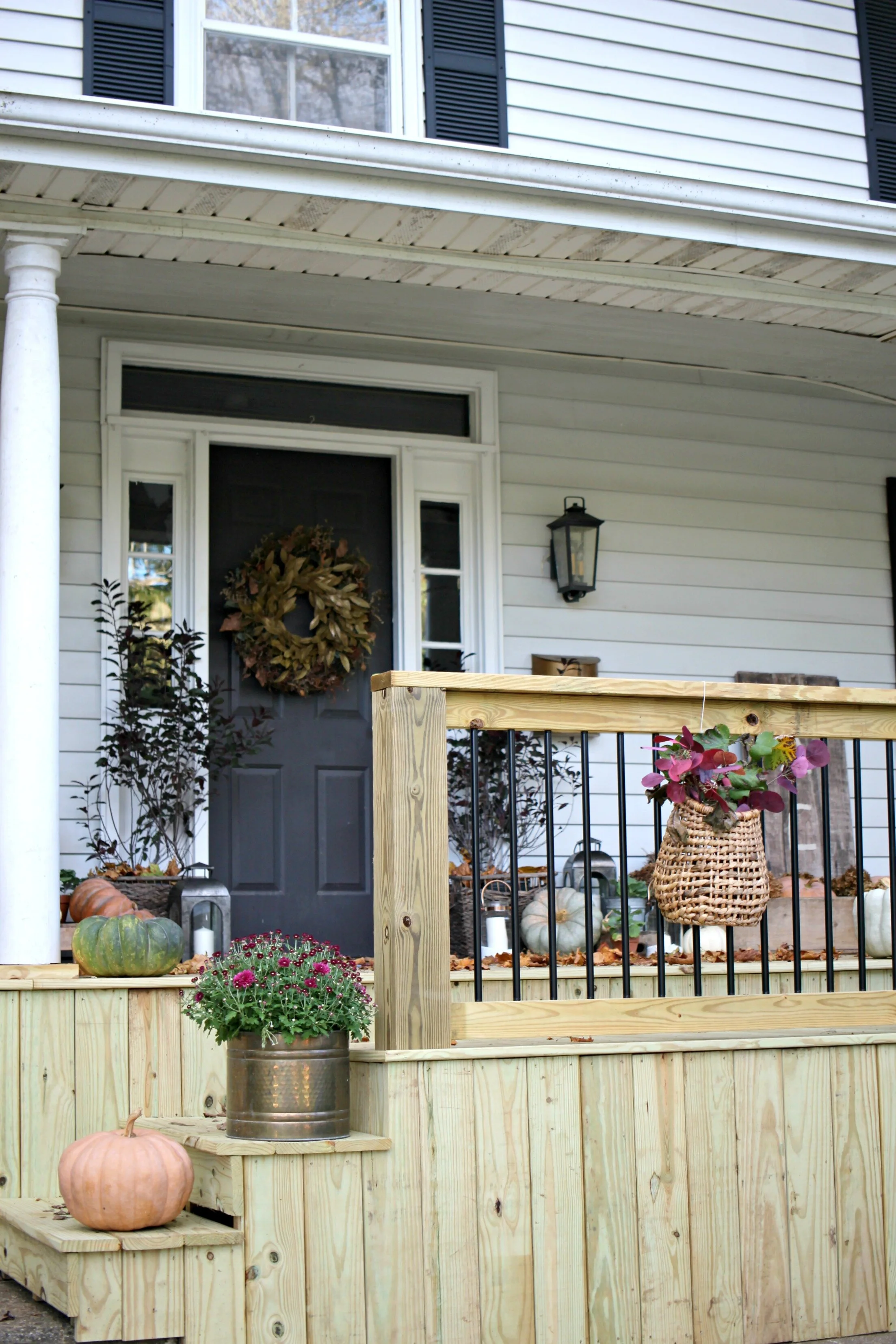 I was more excited than usual to decorate our front porch this year because we just completed a much overdue renovation of the porch which now has all new supports, stairs, and lumber all around. We have not gotten to stain the wood yet, but who knows when we’ll have time to do that, so I just went ahead and started decking it out for fall! This is a project we had on our list since moving in, as many of the boards had major cracking or holes in them, but somehow or another it always got pushed to the side. Now it’s as good as new and completely structurally sound as well.