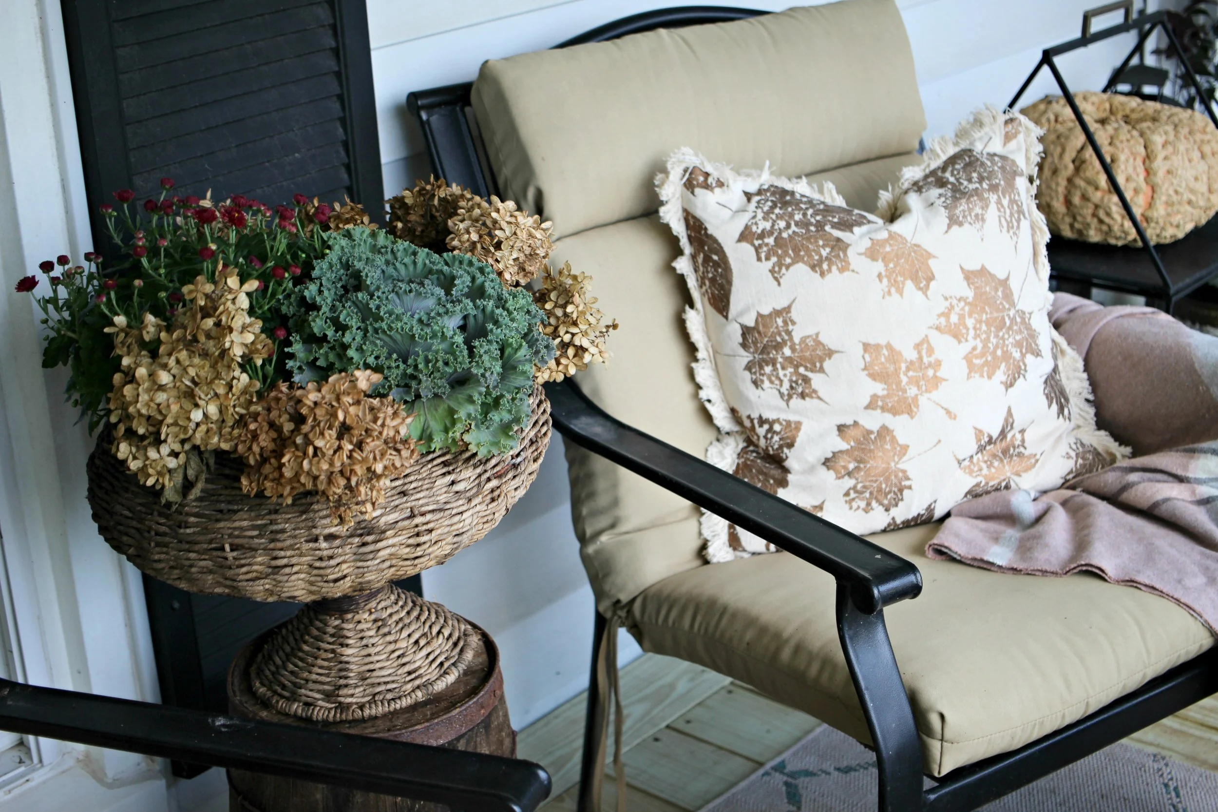 I always love to use clusters of lanterns on my porches too and the ones above from TJMaxx were perfect because the metal was a little darker so it stands out against all the neutrals. I also grabbed a few smaller glass + copper lanterns from the Target dollar spot to mix in so I had a good variety of sizes. As usual I used dried hydrangeas too as filler in my planters and throughout the porch (see below). Overall I’m loving the more muted colors out here with the pops of jeweltones out here! You can scroll through more photos of my fall porch below, and as always, if you have any questions about details or items used, just ask in the comments below!