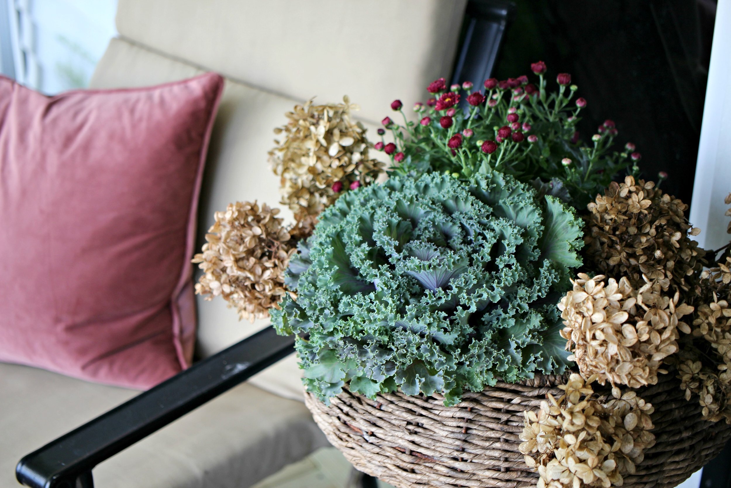 This year for my fall porch decor I decided to go with neutrals and greens with pops of plum. I used lots of mums throughout in both plum and white shades and I also mixed in some small cabbages and autumn sedum plants too. I placed all different shades of green, peachy and white pumpkins throughout the space as well. I used a variety of vintage and reclaimed pieces for planters including metal buckets, baskets, and brass pots, most of which were thrifted or from garage sales.