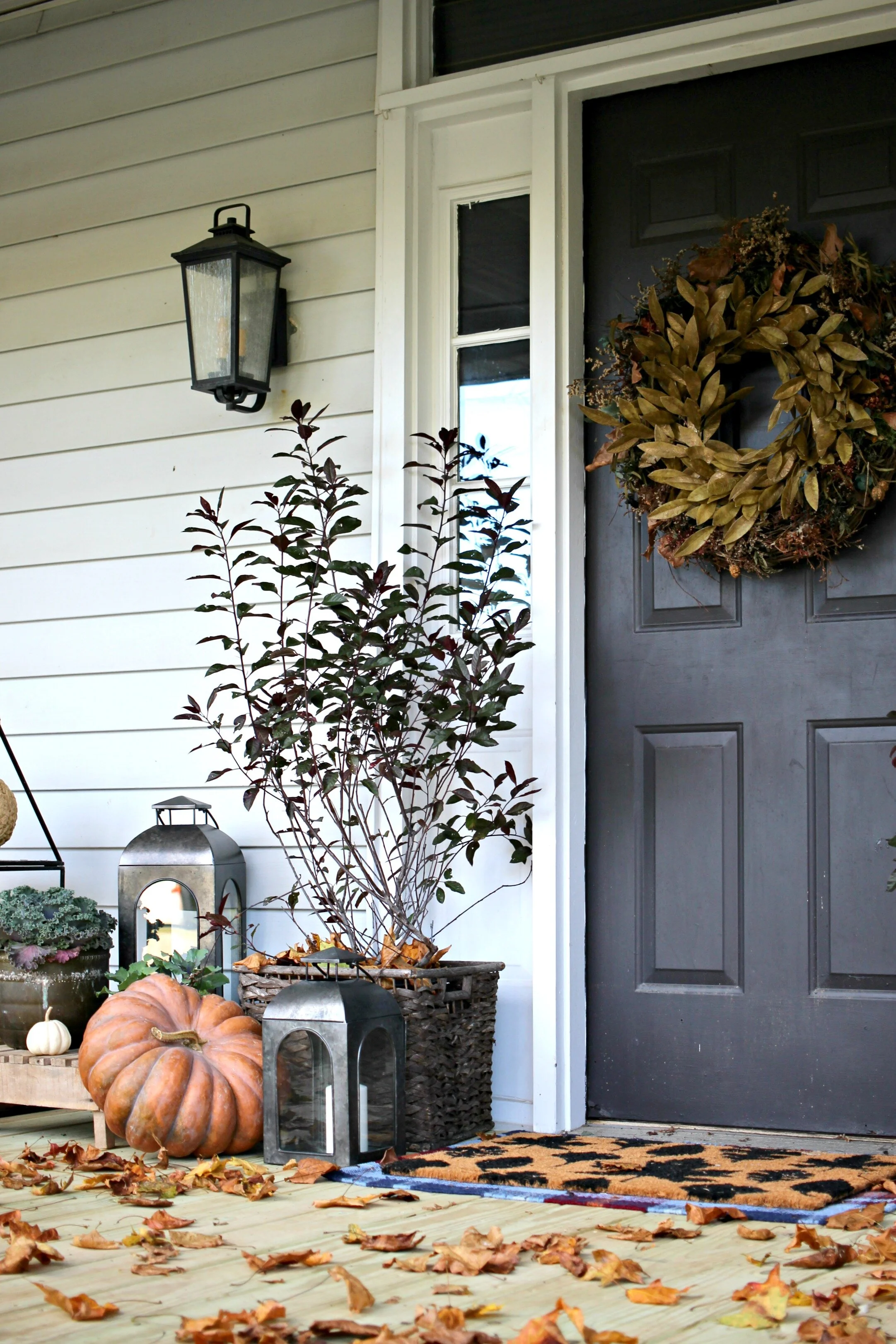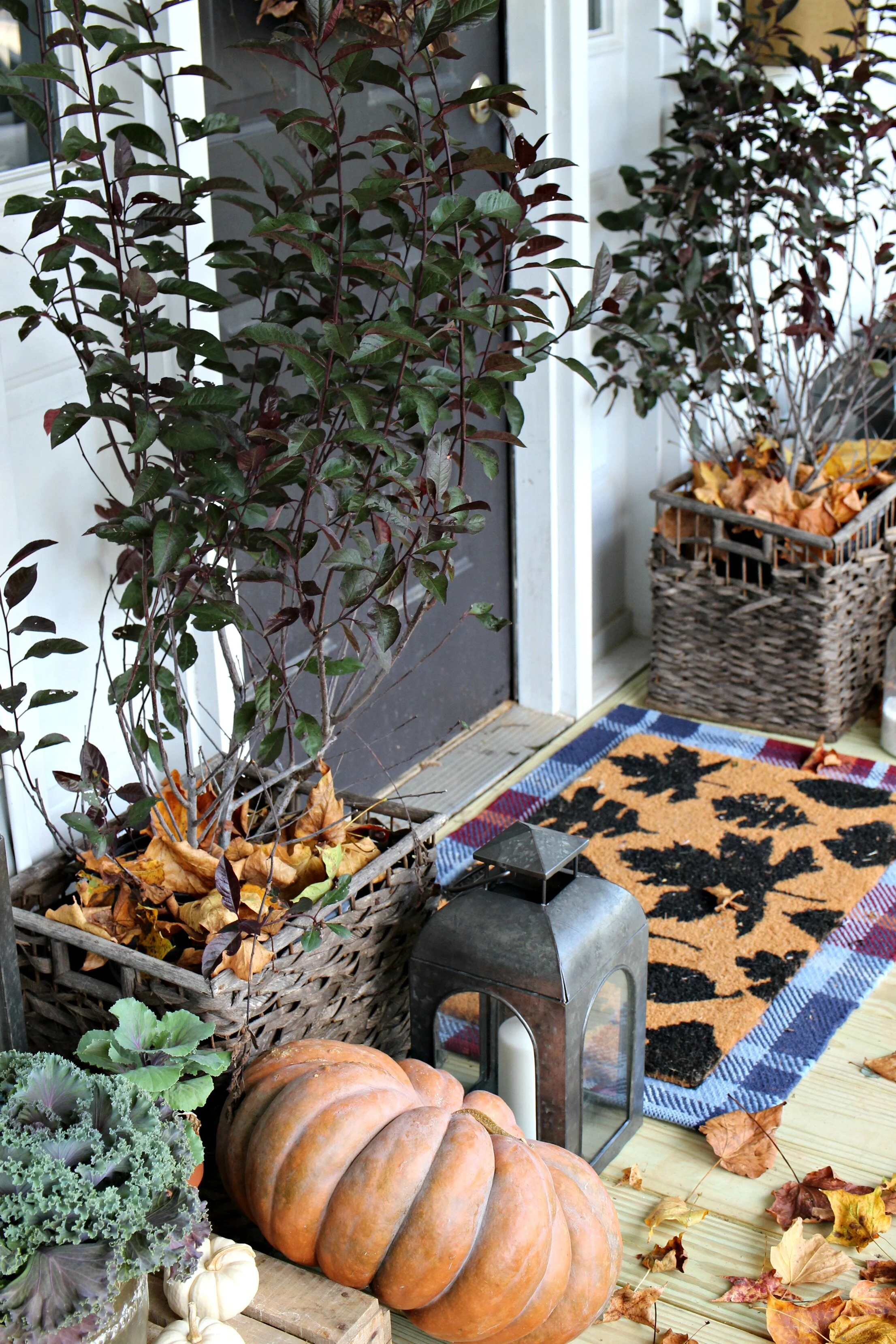 My favorite part of the porch this year is these autumn trees that I bought for each side of the door. I love having something a little taller here and they add that perfect dose of plum color and extra texture as well. I used the same wreath I have for the past several years on my front door which is actually two wreaths layered together (the gold one from Homegoods and the back one from the Peddler Mall). I also updated my doormat and went for the layered look with this bright plaid Target rug underneath this graphic leaf print doormat.