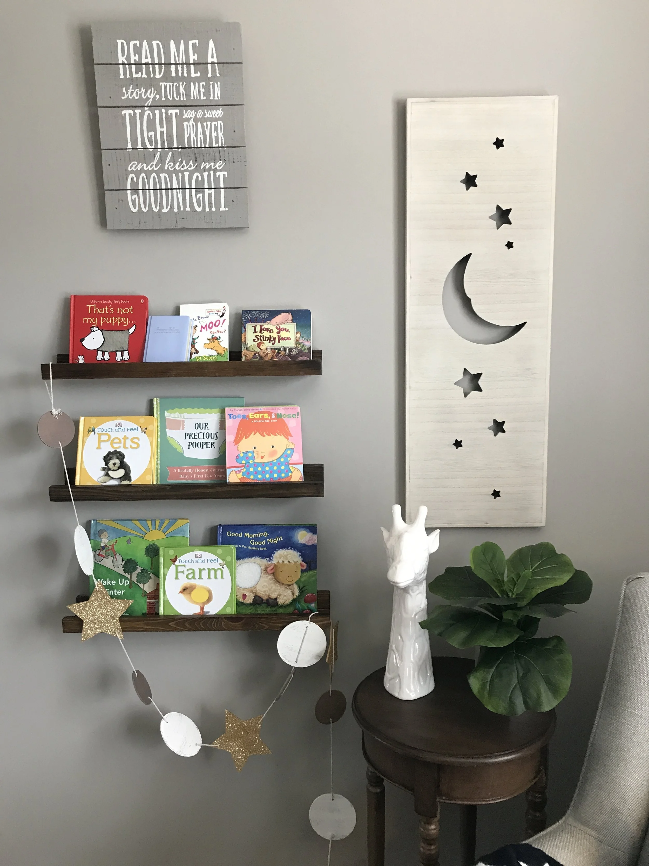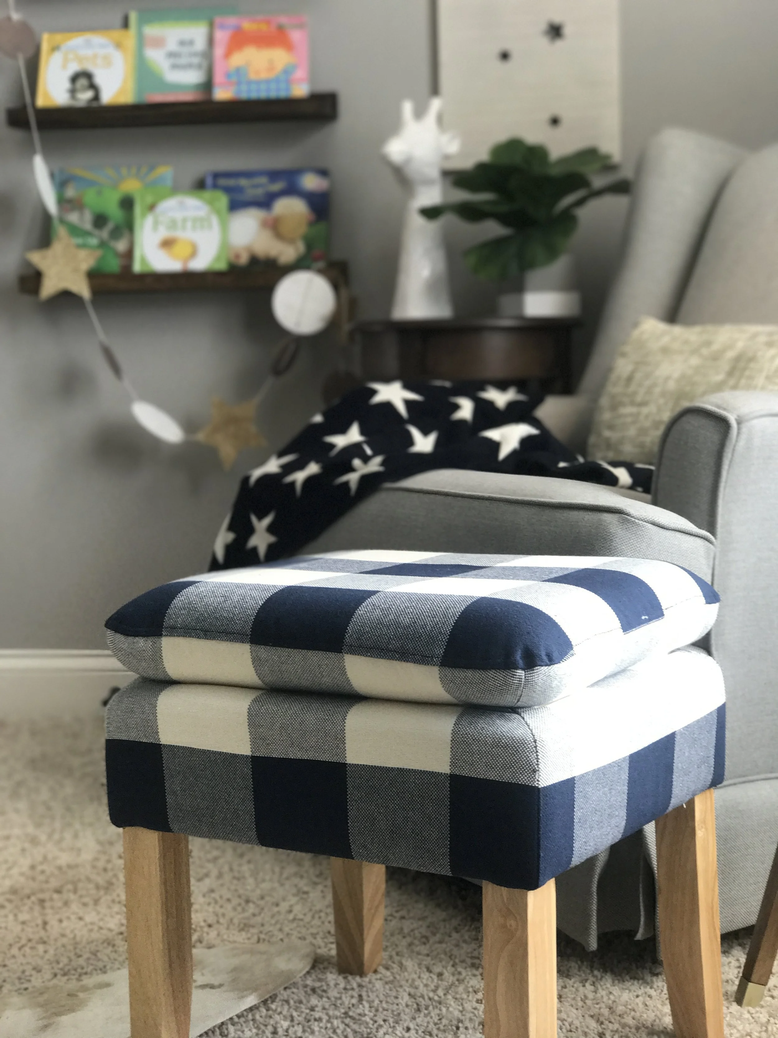 We also created a little reading nook with some book ledges, rocking chair, and floor lamp. I found a perfect side table from Homegoods along with the cute giraffe statue, faux fiddle leaf fig, and knit stars blanket. The book ledges are actually picture ledges from Target but they also work perfectly for leaning books too! I found a cute quote sign from Hobby Lobby for above the books and the moon and stars wood cut-out sign at Homegoods which filled the rest of the space perfectly. One of my favorite little details over here is the plaid ottoman which adds the perfect pop of pattern in this corner.