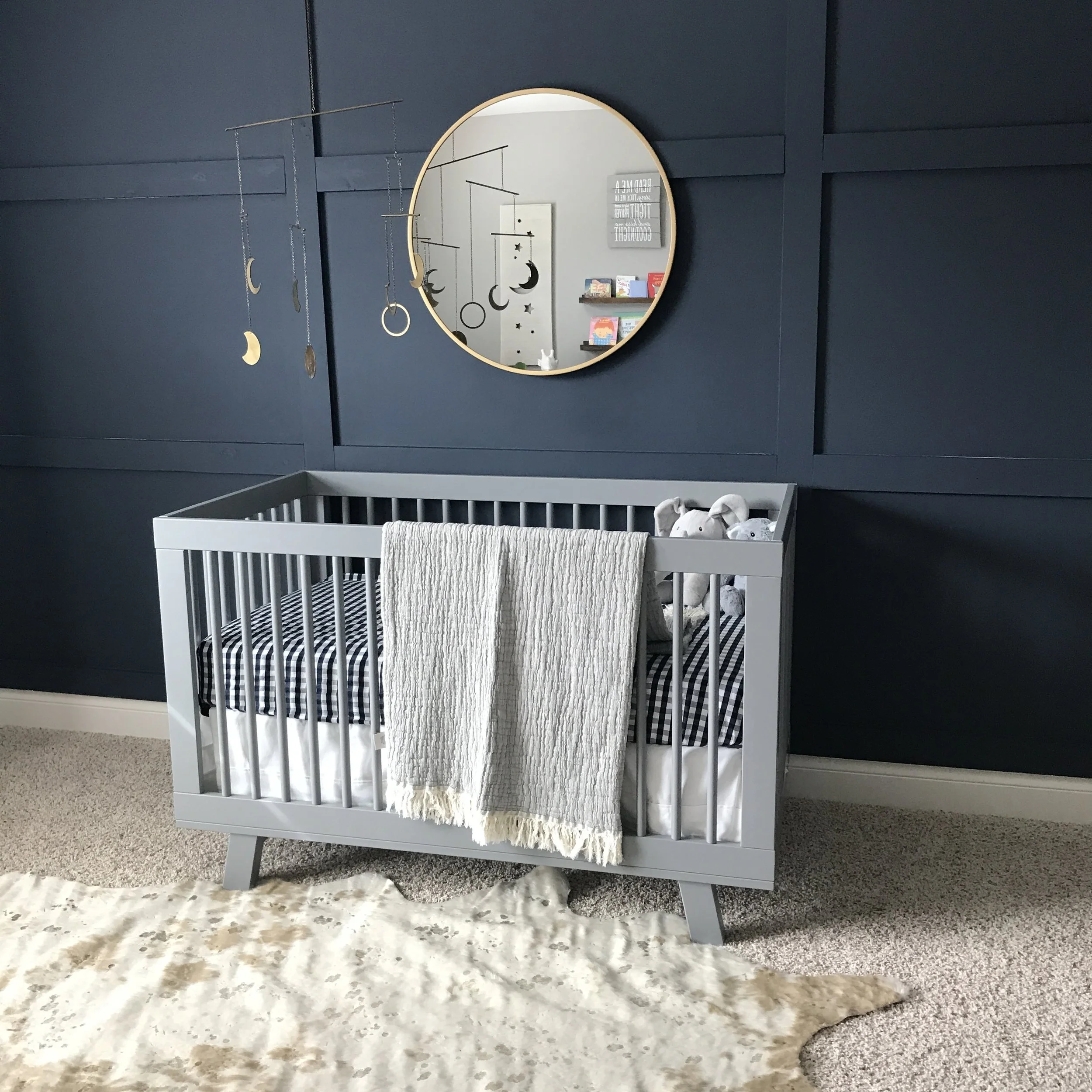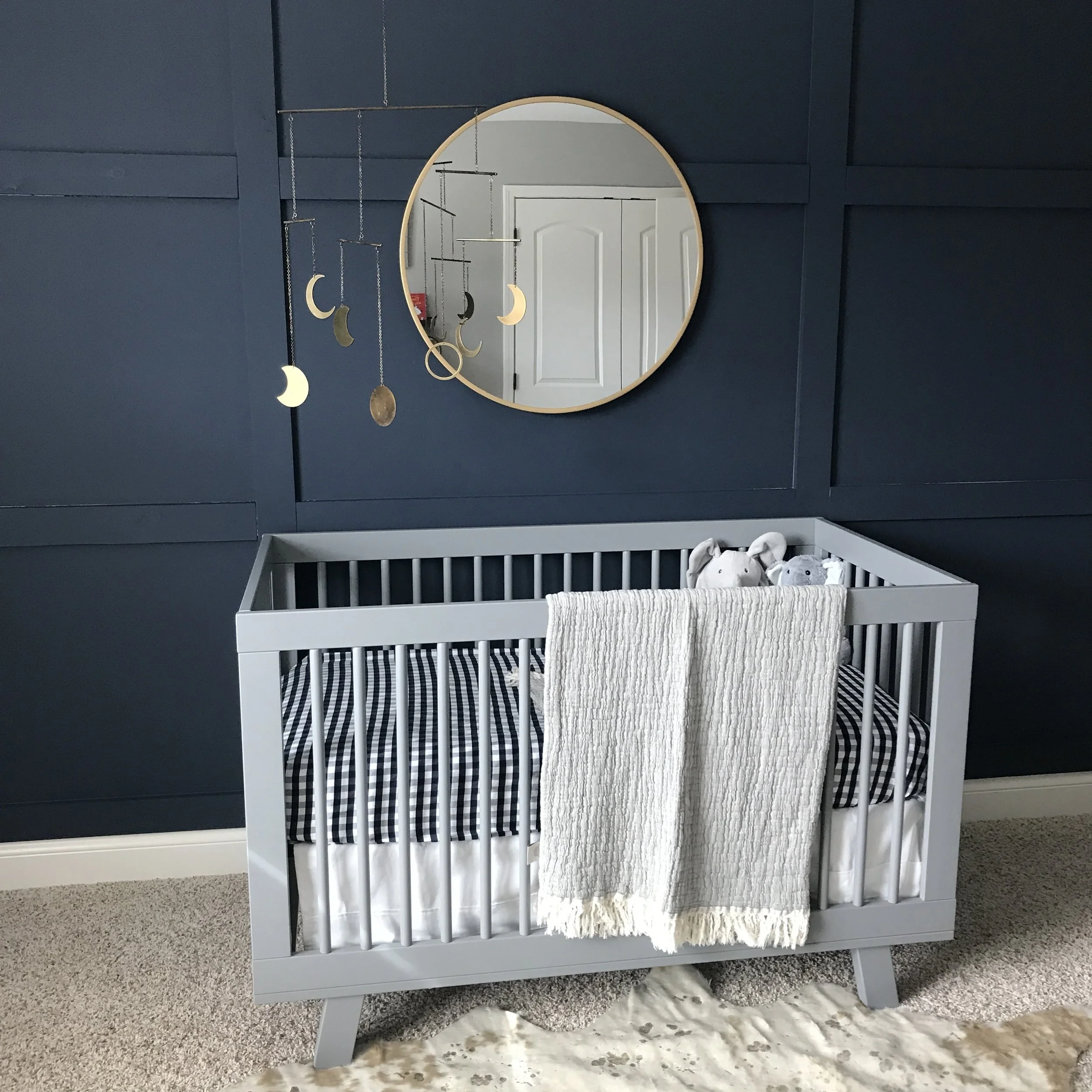 On the crib wall, the hanging decor really is the focal point. I love the simple gold mirror layered on the dark navy paneled wall and the brass moons mobile from Restoration Hardware is the perfect finishing touch. We kept it simple as far as the bedding and just went with a white crib skirt, gingham sheet, and one fringed throw blanket draped over the edge.