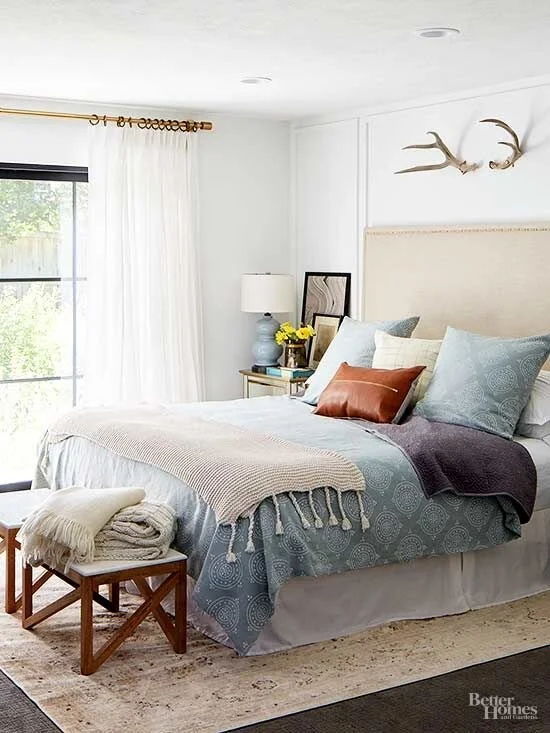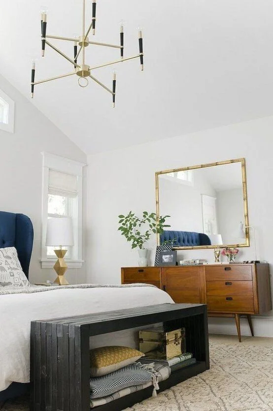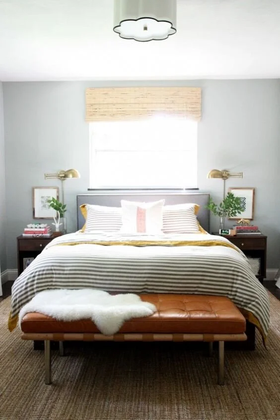 If you don't have space for a full bench, just placing a couple of small crates or baskets at the end of the bed works too! I love the look of these canvas and leather totes above and how they perfectly match this neutral + navy bedroom.