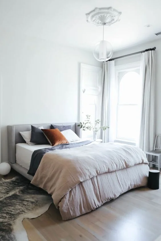 1. Paint your walls white instead: If you really want a super light and bright bedroom but don't want to worry about keeping white bedding clean, try painting the walls super light to still give the crisp and clean effect. A super light gray, greige, or just a classic white will do the trick. You can up the brightness even more by adding simple, sheer white curtains or shades as well. A bright, shaggy or textured rug also does wonders for adding that super clean and cozy feel to your space. And no, it doesn't make your bedroom boring to have white walls, just check out some of my favorite examples below! When you have a simple, bright, and blank slate- you can really have fun with the bedding and accessories while still achieving that crisp, clean, cozy look!