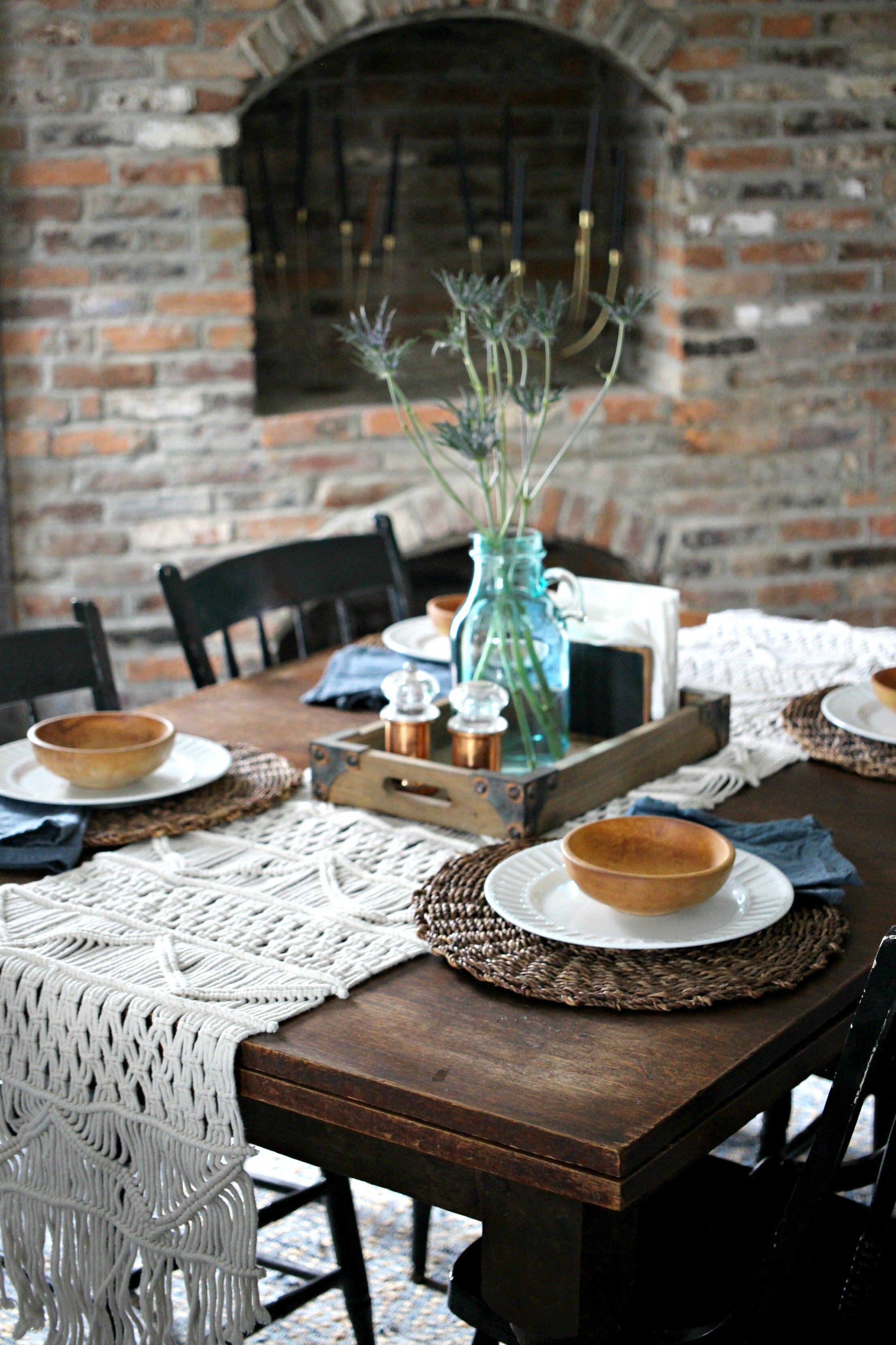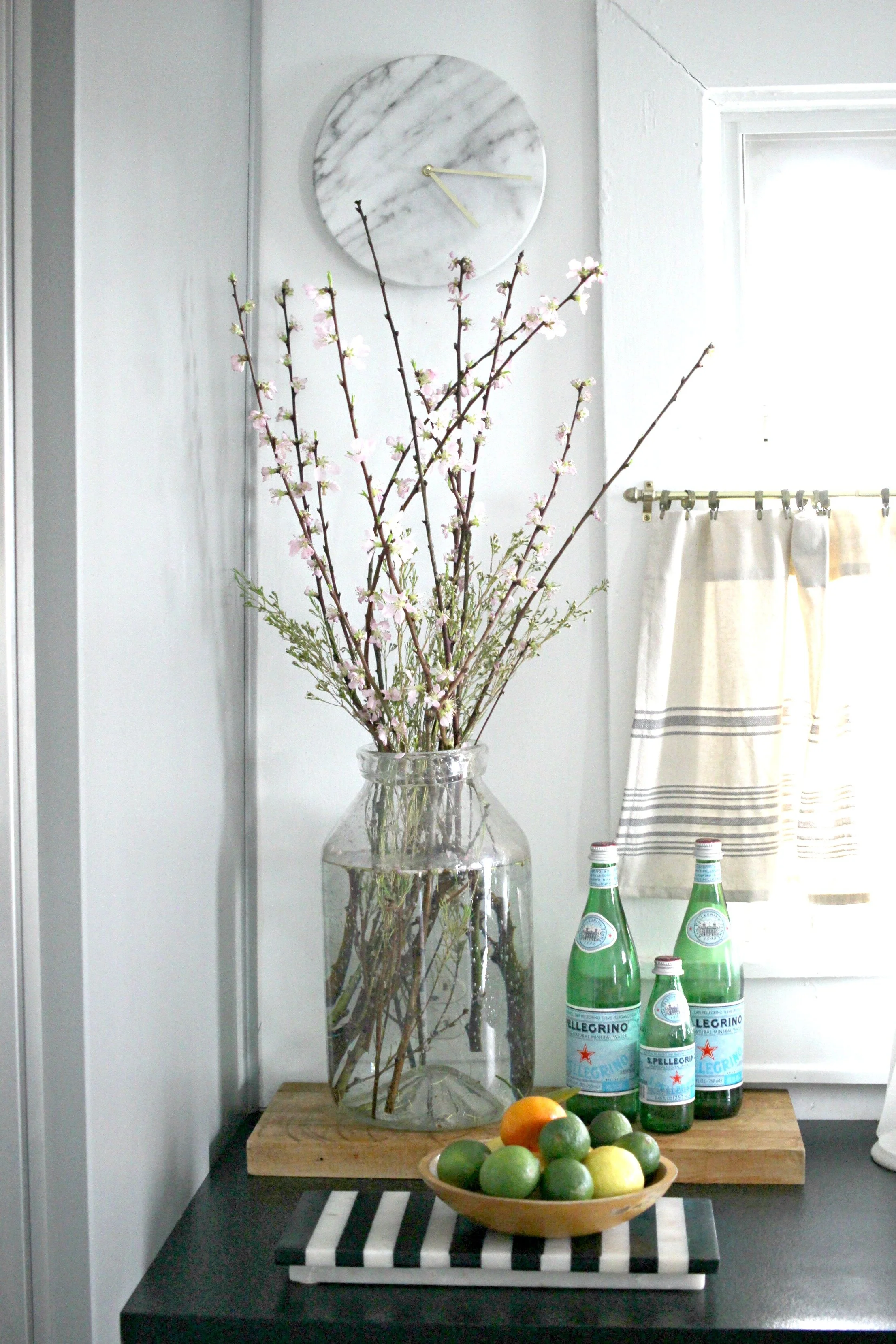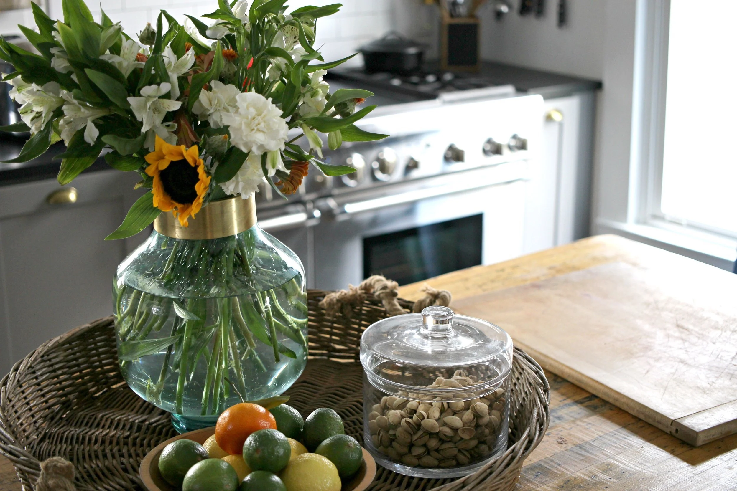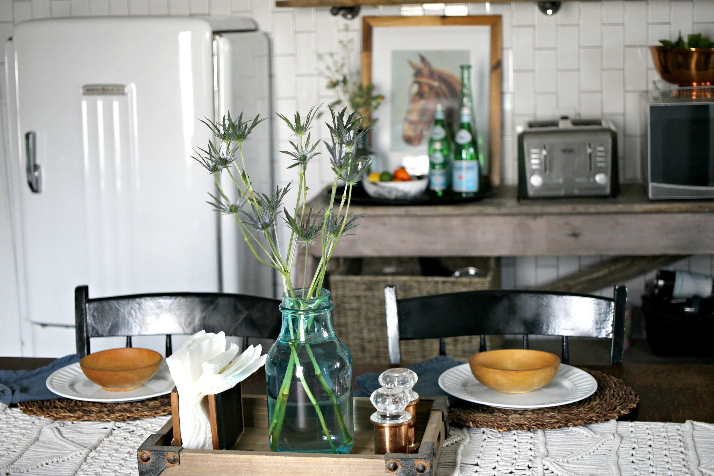 It took me a little longer than usual this year, but I've finally gotten all my winter decor packed up and am slowly freshening up my home for spring. The kitchen is one of the first areas I've focused on because it's so easy to add a few spring touches in here. A few bowls of fresh citrus like lemons, limes, and oranges are perfect for adding a pop of color on your kitchen island or on your countertops. I also like to have lots of fresh flowers everywhere. You don't even have to do a full blown arrangement, as sometimes just a few simple stems in a large jar can be just as effective. Finally I also brightened up my table settings with this amazing macrame runner and some simple white plates. You can find my kitchen details + fixtures are listed here, but if you have questions about anything else not listed, just ask!