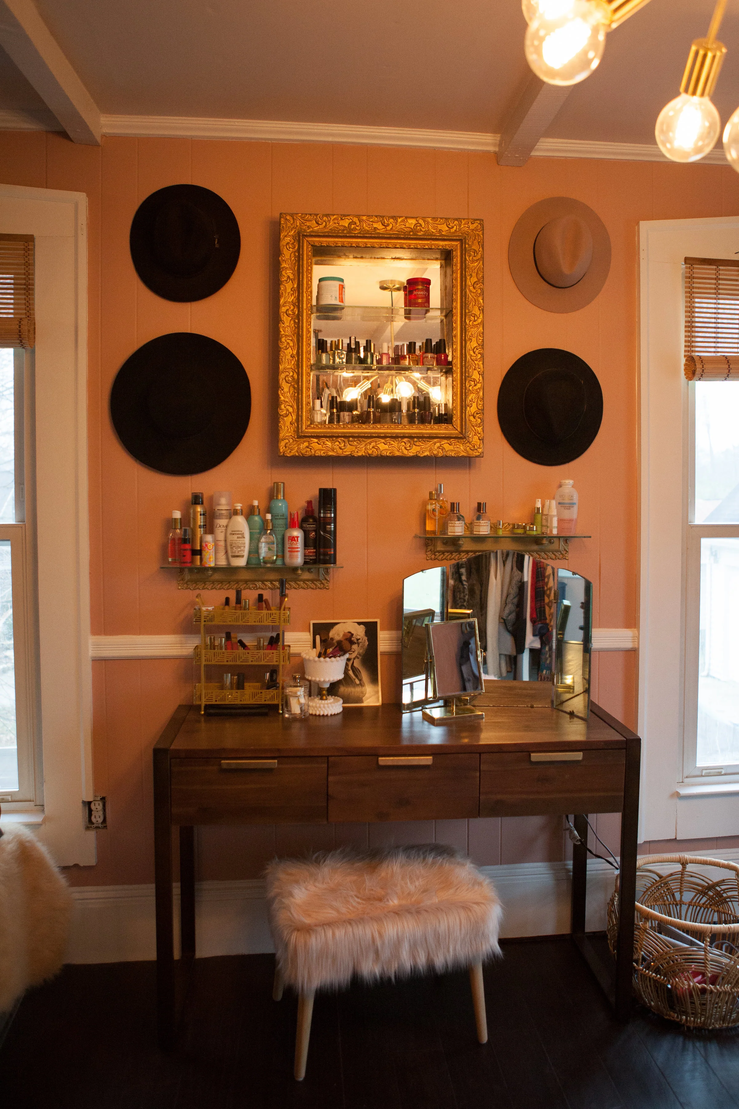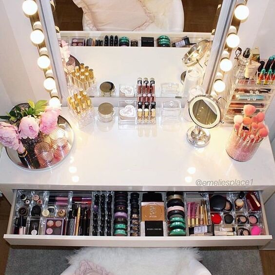 7. If additional space is needed consider adding a rolling cart beside your vanity, or wall mounted shelves above your vanity to hold extra organizers and/or beauty products.